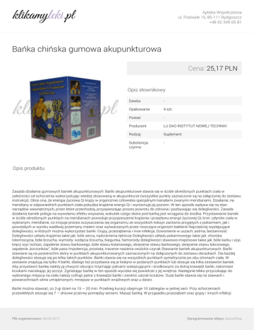 Apteka Współczesna ul. Podwale 15, 85-111 Bydgoszcz +48 52 345 65 81 Bańka chińska gumowa akupunkturowa Cena: 25,17 PLN Opis słownikowy Dawka - Opakowanie 4 szt. Postać - Producent LU DAO INSTYTUT NOWEJ TECHNIKI Rodzaj Suplement Substancja czynna - Opis produktu Zasada działania gumowych baniek akupunkturowych: Bańki akupunkturowe stawia się w ściśle określonych punktach ciała w zależności od schorzenia wykorzystując wiedzę stosowaną w akupunkturze (wszystkie punkty zaznaczone są na załączonej do zestawu instrukcji). Głosi ona, że energia życiowa Qi krąży w organizmie człowieka specjalnymi kanałami zwanymi meridianami. Działanie, na meridiany w odpowiednich punktach ciała pobudza krążenie energii Qi i wyrównuje jej poziom. W ten sposób wpływa się na stan narządów wewnętrznych, przez które przechodzą, przyspieszając proces powrotu do zdrowia i pozbywając się dolegliwości. Zasada działania baniek polega na wywołaniu efektu wsysania, wskutek czego skóra pod bańką jest wciągana do środka. Przystawianie baniek w ściśle określonych punktach na meridianach powoduje przyspieszenie krążenia i przepływu energii życiowej Qi, krwi i płynów ciała w wybranym, meridianie, co inicjuje proces oczyszczania się organizmu ze wszystkich toksyn zarówno przyjętych z pokarmem, jak i powstałych w wyniku wadliwej przemiany materii oraz wytwarzanych przez niszczące organizm bakterie Najczęściej występujące dolegliwości, w których można wykorzystać bańki: Grypy, przeziębienia i inne infekcje, Dzwonienie w uszach, astma, bezsenność Dolegliwości układu krążenia takie jak: bóle serca, nadciśnienia tętnicze Dolegliwości układu pokarmowego takie jak: choroba lokomocyjna, bóle brzucha, wymioty, wzdęcia brzucha, biegunka, hemoroidy dolegliwości stawowo-mięśniowe takie jak: bóle karku i szyi, kręcz szyi Ischias, zapalenie stawu barkowego, bóle stawu kolanowego, skręcenie stawu barkowego, skręcenie stawu łokciowego, zapalenie „korzonków", bóle pasa Impotencja, prostata, tracenie nasienia ceuloitis czyrak Stawianie baniek akupunkturowych: Bańki stawiane są na powierzchni skóry w punktach akupunkturowanych zaznaczonych na dołączonych do zestawu obrazkach. Dla każdej dolegliwości stosuje się po kilka takich punktów. Bańki stawia się na wszystkich punktach symetrycznie po obu stronach ciała. W zestawie znajdują się tylko 4 bańki, dlatego też przystawia się je kolejno w podanych punktach lub stosuje się kilka zestawów baniek. Aby przystawić bańkę należy ją chwycić oburącz trzymając palcami wskazującymi i środkowymi za dolną krawędź bańki, natomiast kciukami naciskając jej szczyt. Zgniatając bańkę w ten sposób wyciska się powietrze z jej wnętrza. Następnie lekko przyciskając do wybranego miejsca na ciele należy cofnąć palce z krawędzi bańki i zwolnić uścisk kciuków. Duże bańki stawia się na stawach i powierzchniach silnie umięśnionych; mniejsze w punktach wrażliwych oraz u dzieci. Bańki można stawiać, co 2-gi dzień na 15 – 20 min. Przebieg kuracji obejmuje 10 zabiegów w jednej serii. Przy schorzeniach przewlekłych stosuje się 7 – dniowe przerwy pomiędzy seriami. Masaż bańką: W przypadku przeziębień oraz grypy i innych infekcji Plik wygenerowano: 04-03-2017 Oprogramowanie sklepu: AptusShop Apteka Współczesna ul. Podwale 15, 85-111 Bydgoszcz +48 52 345 65 81 można zastosować masaż pleców bańką. Przed przystąpieniem do zabiegu należy całą powierzchnię masowaną posmarować oliwką. Następnie przystawia się bańkę w okolicy ramienia np. lewego i przesuwa się ją raz przy razie z góry na dół i z dołu do góry masując całą okolicę pleców. Dla osób dorosłych stosuje się największą bańkę w zestawie, dla dzieci bańki odpowiednio mniejsze w zależności od wieku dziecka. Przy dolegliwościach mięśniowych innych części ciała masuje się bolące miejsca w ten sam sposób. Przeciwwskazania: Nie stosować baniek przy zaburzeniach krzepliwości krwi, w przypadku wylewów podskórnych i obrzęków spowodowanych stłuczeniem lub skręceniem nie stosować baniek przed upływem 24 godzin od urazu. U kobiet w ciąży nie stawiać dużych baniek na brzuchu i nie stosować wysokiego ciśnienia zasysania. U osób bardzo wychudzonych i u małych dzieci nie stosować baniek w okolicach łopatek, kręgosłupa, sutków, koniuszka serca, żołądka oraz jamy brzusznej Bańki należy przechowywać czyste w suchym miejscu w temperaturze pokojowej z dala od grzejników i unikać ekspozycji słonecznych. Plik wygenerowano: 04-03-2017 Powered by TCPDF (www.tcpdf.org) Oprogramowanie sklepu: AptusShop