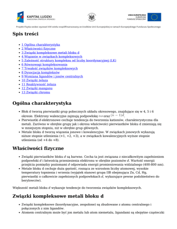 Spis treści 1 Ogólna charakterystyka 2 Właściwości fizyczne 3 Związki kompleksowe metali bloku d 4 Wiązanie w związkach kompleksowych 5 Zależność struktury kompleksu od liczby koordynacyjnej (LK) 6 Równowagi kompleksowania 7 Trwałość związków kompleksowych 8 Dysocjacja kompleksów 9 Wymiana ligandów i jonów centralnych 10 Związki żelaza 11 Reaktywność żelaza 12 Związki manganu 13 Związki chromu Ogólna charakterystyka Blok d tworzą pierwiastki grup pobocznych układu okresowego, znajdujące się w 4, 5 i 6 okresie. Elektrony walencyjne zajmują podpowłokę oraz . Pierwiastki d-elektronowe cechuje tendencja do tworzenia kationów, charakterystyczna dla metali. Zarówno w obrębie grupy jak i okresu właściwości pierwiastków bloku d zmieniają się w mniejszym stopniu, niż w obrębie grup głównych. Metale bloku d tworzą wiązania jonowe i kowalencyjne. W związkach jonowych wykazują niższe stopnie utlenienia (+1, +2, +3), a w związkach kowalencyjnych wyższe stopnie utlenienia (od +4 do +8). Właściwości fizyczne Związki pierwiastków bloku d są barwne. Cecha ta jest związana z niecałkowitym zapełnieniem podpowłoki d i łatwością przeniesienia elektronu w obrębie poziomów d. Wartość energii przejścia pomiędzy poziomami d odpowiada energii promieniowania widzialnego (400-800 nm). Metale bloku d cechuje duża gęstość, rosnąca ze wzrostem liczby atomowej, wysokie temperatury topnienia i wrzenia (wyjątek stanowi grupa IIB obejmująca Zn, Cd, Hg, pierwiastki o całkowicie zapełnionych podpowłokach d, wykazujące pewne podobieństwo do berylowców). Większość metali bloku d wykazuje tendencje do tworzenia związków kompleksowych. Związki kompleksowe metali bloku d Związki kompleksowe (koordynacyjne, zespolone) są zbudowane z atomu centralnego i połączonych z nim ligandów. Atomem centralnym może być jon metalu lub atom niemetalu, ligandami są obojętne cząsteczki lub aniony. Przykłady: [Fe(CN)6]4-, [Cu(NH3)]2+, [BH4]¯, [SiF6]2Kompleksy jednordzeniowe zawierają 1 atom centralny, kompleksy wielordzeniowe zawierają 2 lub więcej atomów centralnych połączonych ze sobą przy pomocy wspólnych ligandów. Liczbę ligandów bezpośrednio związanych z atomem centralnym nazywa się liczbą koordynacyjną (LK). Wiązanie w związkach kompleksowych Teoria pola krystalicznego tłumaczy tworzenie się kompleksów oddziaływaniami elektrostatycznymi między elektronami obsadzającymi podpowłoki typu d atomu centralnego, a elektronami ligandów. Teoria pola ligandów traktuje wiązanie między atomem centralnym a ligandami jako zlokalizowane wiązanie koordynacyjne utworzone w wyniku nakrywania się orbitali atomowych ligandów obsadzonych wolnymi parami elektronowymi z orbitalami zhybrydyzowanymi jonu centralnego. Zależność struktury kompleksu od liczby koordynacyjnej (LK) LK = 2 występuje głównie w przypadku kompleksów jonów jednowartościowych Cu+, Ag+, Au+, a także Hg2+. Kompleksy te mają strukturę liniową. Kompleksy o LK = 3 są rzadko spotykane i mają zazwyczaj kształt płaski [HgJ3]¯ lub kształt piramidy trygonalnej [SnCl3]¯. LK = 4 jest często spotykana w przypadku kompleksów metali przejściowych, zwłaszcza zawierających dużą liczbę elektronów d. Jest to najczęściej występująca liczba koordynacyjna w przypadku kompleksów metali grup głównych. Kompleksy te mają strukturę oktaedryczną [BF4]¯, [AlCl4]¯, [CrO4]¯ lub płaską kwadratową, charakterystyczna dla kationów zawierających 8 elektronów d (Ni2+, Pt2+, Pd2+, Ir+) [Ni(CN)4]2-, [Pt(H2O)4]2+. Kompleksy o LK = 5 mają kształt piramidy lub bipiramidy trygonalnej. Kompleksy o LK = 6 są najczęściej typowe dla metali przejściowych. W większości mają kształt regularnego ośmiościanu (kompleksy oktaedryczne). Liczby koordynacyjne 7, 8, 9 są spotykane w przypadku dużych rozmiarów atomu centralnego (molibden, wanad). Równowagi kompleksowania Kationy występują w roztworach wodnych w postaci hydratowanej, jako jony kompleksowe (akwajony). Powstawanie związków kompleksowych w roztworach wodnych polega na wymianie ligandów H2O na inne ligandy. Podstawianie ligandów odbywa się stopniowo. Ustalają się równowagi zależne od stężenia wprowadzanego ligandu: 1. [Ag(H2O)2]+ + NH3 ⇔ [Ag(H2O)(NH3)]+ + H2O 2. [Ag(H2O)(NH3)]+ + NH3 ⇔ [Ag(NH3)2] + + H2O Sumaryczną reakcję można przedstawić za pomocą równania: [Ag(H2O)2]+ + 2NH3 ⇔ [Ag(NH3)2]+ + 2H2O którą opisuje sumaryczna stała trwałości b. Wartość b dla różnych kompleksów o takim samym jonie centralnym pozwala porównywać właściwości kompleksujące różnych ligandów oraz przewidywać reakcje wymiany ligandów. Trwałość związków kompleksowych Trwałość kompleksów zależy od właściwości jonu centralnego i ligandów oraz charakteru oddziaływań pomiędzy nimi. Na podstawie danych doświadczalnych ustalono pewne korelacje pozwalające przewidywać zmiany trwałości kompleksów. Dla pierwiastków trzeciego okresu trwałość zmienia się w szeregu Mn2+ < Fe2+ < Co2+ < Ni2+ < Cu2+ w miarę jak maleje promień jonowy (rośnie wtedy tzw. potencjał jonowy, czyli stosunek ). Dla kationów o zbliżonych promieniach jonowych różniących się ładunkiem trwałość kompleksu rośnie w miarę wzrostu ładunku Na+ < Ca2+ < Y3+ < Th4+ Dysocjacja kompleksów Kompleksy o dużych wartościach b są bardzo trwałe i nie ulegają widocznej dysocjacji, nawet jeżeli roztwory są bardzo rozcieńczone. Kompleksy o małych wartościach b ulegają dysocjacji. Przykładem jest [Mn(NH3)2]2+ , dla którego log b = 1,3. Kompleks ten ulega znacznej dysocjacji w miarę rozcieńczania roztworu: [Mn(NH3)2]2+ → Mn2+ + 2NH3. Jeżeli wartość b kompleksu danego metalu jest duża, to nadmiar ligandu nie jest konieczny do utworzenia kompleksu. Dla małych wartości stałych trwałości należy stosować nadmiar ligandu. Wymiana ligandów i jonów centralnych Podczas two