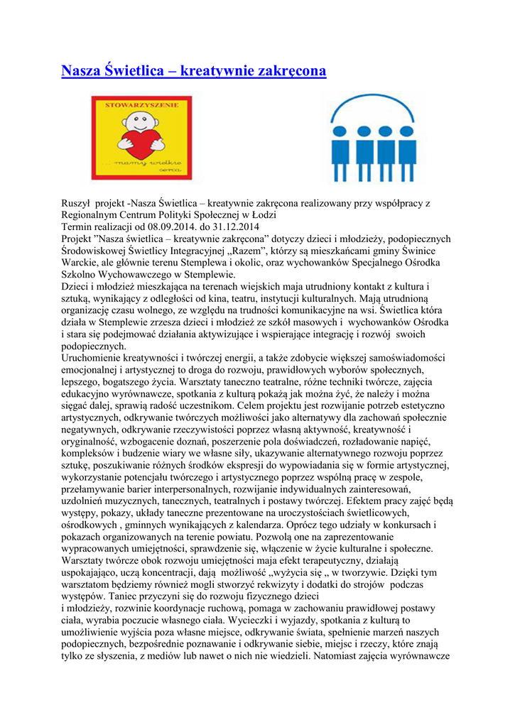 Nasza Świetlica – kreatywnie zakręcona Ruszył projekt -Nasza Świetlica – kreatywnie zakręcona realizowany przy współpracy z Regionalnym Centrum Polityki Społecznej w Łodzi Termin realizacji od 08.09.2014. do 31.12.2014 Projekt ”Nasza świetlica – kreatywnie zakręcona” dotyczy dzieci i młodzieży, podopiecznych Środowiskowej Świetlicy Integracyjnej „Razem”, którzy są mieszkańcami gminy Świnice Warckie, ale głównie terenu Stemplewa i okolic, oraz wychowanków Specjalnego Ośrodka Szkolno Wychowawczego w Stemplewie. Dzieci i młodzież mieszkająca na terenach wiejskich maja utrudniony kontakt z kultura i sztuką, wynikający z odległości od kina, teatru, instytucji kulturalnych. Mają utrudnioną organizację czasu wolnego, ze względu na trudności komunikacyjne na wsi. Świetlica która działa w Stemplewie zrzesza dzieci i młodzież ze szkół masowych i wychowanków Ośrodka i stara się podejmować działania aktywizujące i wspierające integrację i rozwój swoich podopiecznych. Uruchomienie kreatywności i twórczej energii, a także zdobycie większej samoświadomości emocjonalnej i artystycznej to droga do rozwoju, prawidłowych wyborów społecznych, lepszego, bogatszego życia. Warsztaty taneczno teatralne, różne techniki twórcze, zajęcia edukacyjno wyrównawcze, spotkania z kulturą pokażą jak można żyć, że należy i można sięgać dalej, sprawią radość uczestnikom. Celem projektu jest rozwijanie potrzeb estetyczno artystycznych, odkrywanie twórczych możliwości jako alternatywy dla zachowań społecznie negatywnych, odkrywanie rzeczywistości poprzez własną aktywność, kreatywność i oryginalność, wzbogacenie doznań, poszerzenie pola doświadczeń, rozładowanie napięć, kompleksów i budzenie wiary we własne siły, ukazywanie alternatywnego rozwoju poprzez sztukę, poszukiwanie różnych środków ekspresji do wypowiadania się w formie artystycznej, wykorzystanie potencjału twórczego i artystycznego poprzez wspólną pracę w zespole, przełamywanie barier interpersonalnych, rozwijanie indywidualnych zainteresowań, uzdolnień muzycznych, tanecznych, teatralnych i postawy twórczej. Efektem pracy zajęć będą występy, pokazy, układy taneczne prezentowane na uroczystościach świetlicowych, ośrodkowych , gminnych wynikających z kalendarza. Oprócz tego udziały w konkursach i pokazach organizowanych na terenie powiatu. Pozwolą one na zaprezentowanie wypracowanych umiejętności, sprawdzenie się, włączenie w życie kulturalne i społeczne. Warsztaty twórcze obok rozwoju umiejętności maja efekt terapeutyczny, działają uspokajająco, uczą koncentracji, dają możliwość „wyżycia się „ w tworzywie. Dzięki tym warsztatom będziemy również mogli stworzyć rekwizyty i dodatki do strojów podczas występów. Taniec przyczyni się do rozwoju fizycznego dzieci i młodzieży, rozwinie koordynacje ruchową, pomaga w zachowaniu prawidłowej postawy ciała, wyrabia poczucie własnego ciała. Wycieczki i wyjazdy, spotkania z kulturą to umożliwienie wyjścia poza własne miejsce, odkrywanie świata, spełnienie marzeń naszych podopiecznych, bezpośrednie poznawanie i odkrywanie siebie, miejsc i rzeczy, które znają tylko ze słyszenia, z mediów lub nawet o nich nie wiedzieli. Natomiast zajęcia wyrównawcze (logopedia, pomoc w nauce) i komunikacyjne z j. angielskiego, maja one na celu wyrównywanie szans rozwojowych, eliminowanie braków i problemów związanych z przyswajaniem języka oraz poprawa i nauka swobodnej komunikacji w tym języku.. Zajęcia kulinarne maja na celu przybliżenia dzieciom i młodzieży zasad prawidłowego i racjonalnego odżywiania się, poznawania zasad bhp podczas przygotowywania posiłków pod okiem opiekuna, a także zdobywaniu samodzielności i zaradności życiowej poprzez umiejętności przygotowywania posiłków, wyrabianie u dzieci staranności, rzetelnego stosunku do pracy. W trakcie projektu uczestnicy będą korzystali z dożywiania- jednego dodatkowego posiłku dziennie. Nasi podopieczni obok spożywania posiłku poznają szczegółowo zasady zdrowego żywienia, dowiedzą się jak przygotować prosty posiłek nie psując jego wartości zdrowotnych i odżywczych, jak łączyć składniki. Praca w grupie dzieci z normą i dzieci niepełnosprawnych stwarza okazję do rozbudzenia akceptacji wobec siebie zarówno jednych jak i drugich. Wspólne wyjazdy, spożywane razem posiłki czy wspólna zabawa to najlepszy sposób na niwelowanie granic, które nie pozwalają osobom niepełnosprawnym na swobodne funkcjonowanie w społeczeństwie Bez projektu i wsparcia nie maja szans na takie odkrywanie świata i swoich możliwości Działania w ramach realizacji projektu w czasie maj-grudzień 2013 to: 1. Funkcjonowanie Środowiskowej Świetlicy Integracyjnej „Razem” w Stemplewie dla 25 stałych podopiecznych, od poniedziałku do piątku w godz. 14.30 -18.30. Opiekę nad dziećmi będą sprawowali wychowawcy świetlicy wspierani przez wolontariuszy. W ramach działalności świetlicy odbędą się: Warsztaty twórcze: Jak zajęcia wspierające i aktywizujące chcemy zaproponować podopiecznym świetlicy zapoznają się z nowymi formami rękodzieła, spotkanie z glinoterapią, makramą, filcem, decoupage. Uczestnicy zajęć zaprezentują swoje prace na wystawach, przeglądach imprez Zajęcia logopedyczne mające na celu wyrównywanie szans rozwojowych poprzez pomoc w nauce, zajęcia wspierające rozwój . Pomoc w nauce, odrabianiu lekcji (codziennie), zajęcia przeznaczone dla wszystkich dzieci, ujęte w planie pracy świetlicy. Zajęcia muzyczne, wokalno-rytmiczne; warsztaty będą możliwością dla dzieci i młodzieży rozwijania potrzeb artystycznych, zainteresowań i upodobań muzycznych, kształtowanie głosu oraz umiejętności posługiwania się nim. Zajęcia wyrównawcze z języka angielskiego – pomoc w nauce języka angielskiego, nadgonienie braków, uzupełnia