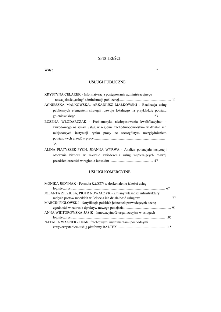 SPIS TREŚCI Wstęp.................................................................................................................. 7 USŁUGI PUBLICZNE KRYSTYNA CELAREK - Informatyzacja postępowania administracyjnego - nowa jakość „usług" administracji publicznej .......................................................... 11 AGNIESZKA MAŁKOWSKA, ARKADIUSZ MAŁKOWSKI - Realizacja usług publicznych elementem strategii rozwoju lokalnego na przykładzie powiatu goleniowskiego ....................................................................................... 23 BOŻENA WŁODARCZAK - Problematyka niedopasowania kwalifikacyjno- zawodowego na rynku usług w regionie zachodniopomorskim w działaniach miejscowych instytucji rynku pracy ze szczególnym uwzględnieniem powiatowych urzędów pracy ............................................................................... 35 ALINA PIĄTYSZEK-PYCH, JOANNA WYRWA - Analiza potencjału instytucji otoczenia biznesu w zakresie świadczenia usług wspierających rozwój przedsiębiorczości w regionie lubuskim ................................................. 47 USŁUGI KOMERCYJNE MONIKA JEDYNAK - Formuła KAIZEN w doskonaleniu jakości usług logistycznych ....................................................................................................... 67 JOLANTA ZIEZIULA, PIOTR NOWACZYK - Zmiany własności infrastruktury małych portów morskich w Polsce a ich działalność usługowa .................................. 77 MARCIN PIGŁOWSKI - Notyfikacja polskich jednostek prowadzących ocenę zgodności w zakresie dyrektyw nowego podejścia ..................................................... 91 ANNA WIKTOROWSKA-JASIK - Innowacyjność organizacyjna w usługach logistycznych ....................................................................................................... 105 NATALIA WAGNER - Handel frachtowymi instrumentami pochodnymi z wykorzystaniem usług platformy BALTEX ..................................................... 115 Spis treści 2 ADAM BAREMBRUCH - Edukacja i wiedza finansowa a zarządzanie finansami osobistymi ............................................................................................................ 127 AGNIESZKA GRZYBOWSKA - Nowoczesne technologie w rozwoju usług sektora bankowego ................................................................................................... 141 BEATA NOWOTARSKA-ROMANIAK - Wdrażanie orientacji marketingowej w firmach ubezpieczeniowych .................................................................................. 153 ANNA WALLIS - E-ubezpieczenia jako nowa forma świadczenia usług ubezpieczeniowych ................................................................................................... 167 URSZULA BĄKOWSKA-MORAWSKA - Działania na rzecz wzrostu wartości konsumenckiej w usługach SPA ............................................................................... 179 SEBASTIAN DUDZIAK, JACEK BORZYSZKOWSKI - Analiza oferty specjalnych pakietów pobytowych i ich wykorzystania w obiekcie hotelarskim na przykładzie Royal Park Hotel & SPA w Mielnie .................................. 193 MAŁGORZATA GRZYWIŃSKA-RĄPCA - Analiza wydatków gospodarstw domowych na rekreację i kulturę w roku 2010 .................................................... 205 JOANNA JANICKA - Wpływ ustawy o usługach turystycznych na podaż i jakość usług pilockich i przewodnickich w województwie lubelskim w latach 19972012 ...................................................................................................... 219 BEATA KOLNY - Mocne i słabe strony przedsiębiorstw świadczących usługi zagospodarowujące czas wolny na tle szans i zagrożeń w otoczeniu ....................... 231 MAGDALENA KULBACZEWSKA, ROBERT KUBICKI - Udział turystów zagranicznych w turystyce uzdrowiskowej województwa zachodnio- pomorskiego ......................................................................................... 247 KATARZYNA ORFIN - Kształtowanie marki na rynku usług turystycznych 261 ALEKSANDER PANASIUK - Determinanty funkcjonowania regionalnego systemu informacji turystycznej ............................................................................... 271 ANNA KALINOWSKA-ŻELEŹNIK, MARTA SIDORKIEWICZ - Identyfikacja usług wybranych produktów turystyki biznesowej. Ujęcie marketingowe 283 PIOTR MURYJAS, MATEUSZ MURYJAS - E-usługi w obszarze marketingu internetowego realizowane z wykorzystaniem narzędzi IT ................................. 297 JULIA WOJCIECHOWSKA-SOLIS - Analiza jakości usług biur podróży województwa lubelskiego za pomocą metody SERVQUAL .................................... 311 KAMILA MAŃKO, ANETA WOLNA-SAMULAK, MONIKA STANKIEWICZ - Globalizacja rynku usług turystycznych ............................................................... 325 KATARZYNA ZIOŁO - Skuteczna motywacja pracowników i jej wpływ na budowanie przewagi konkurencyjnej przedsiębiorstwa w sektorze usług turystycznych ....................................................................................... 337 KATARZYNA DZIEWANOWSKA, MONIKA SKOREK - Wprowadzanie nowej usługi na rynek na przykładzie portalu Cogitors.pl ....................................... 351 IZABELA OLSZEWSKA - Model B2B świadczenia usług informatycznych - cechy i wyznaczniki konkurencyjności ............................................................ 363 3 Spis treści MAREK SYLWESTRZAK, ANNA STOLARCZYK - E-commerce w Poczcie Polskiej w świetle rozwiązań wybranych zagranicznych operatorów pocztowych .............................................................................................................. 373 MAREK GNUSOWSKI - Wpływ globalizacji na polski rynek usług prawniczych ............................................................................................................. 385 ALEKSANDRA ŁAPKO - Żeglarskie usługi szkoleniowe na przykładzie oferty wo