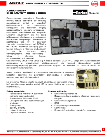 ABSORBERY CHO-MUTE ABSORBERY CHO-MUTETM 9005 i 9025 Elastomerowe absorbery Cho-Mute oferują łatwe podejście do redukcji niepożądanej emisji z urządzeń elektronicznych oraz minimalizują sprzęganie się zaburzeń między poszczególnymi wnękami urządzenia i rezonanse mikrofalowe we wnękach. Materiał zbudowany jst na bazie silikonowego elastomeru wypełnionego materiałem ferrytowym. Materiały te pochłaniają fale RF w szerokim zakresie częstotliwości od 500MHz do 18GHz. Materiał dostępny jest w formie arkuszy o różnych grubościach z lub bez warstwy taśmy samoprzylepnej. Jest elastyczny i łatwy w obróbce (cięcie, sztancowanie, wykrawanie). Oba materiały 9005 oraz 9025 są w klasie palności UL94 V-0. Mogą być z powodzeniem stosowane w urządzeniach elektronicznych do redukcji niepożądanej emisji elektromagnetycznej poprzez pochłanianie sygnału jak również do redukcji odbić od metalicznych powierzchni. Astat posiada możliwość sztancowania absorberów w dowolne kształty, zarówno na potrzebny prototypów i produkcji małoseryjnej jak i wielkoseryjnej. Na życzenie Klienta, dobór naszych absorberów rozwiązań może być potwierdzony analizą emisji RF w polu bliskim za pomocą skanera EMC. Zalety materiału: Pochłanianie mikrofal w szerokim zakresie częstotliwości Pochłanianie RF aż do 25dB Dostępny dla kilku standardowych grubości Elastyczny Zgodny z RoHS Łatwo dostępny Dopuszczenie UL 94 V-0 Typowe aplikacje: Elektronika przenośna Bezprzewodowe systemy głosowe i przesyłu danych Elektronika wojskowa GPS Komputery przemysłowe Noktowizja Sprzęt infrastruktury teleinformatycznej 1 ABSORBERY CHO-MUTE INFORMACJE OGÓLNE O PRODUKCIE Właściwość Jednostka Metoda testowa Wartość Budowa Silikon wypełniony ferrytem Parametry elektryczne Początkowa rezystywność powierzchniowa Ω/ CEPS-0002 > 1M Początkowa rezystywność objętościowa Ω⋅cm CEPS-0002 > 1M Przenikalność -- ASTM D2520 1,76 Tangens strat magnetycznych -- ASTM D2520 0,602 Przenikalność elektryczna -- ASTM D2520 13,8 Tangens strat dielektrycznych -- ASTM D2520 0,15 Zakres temperatur roboczych -- -- -50oC +160oC Wytrzymałość na rozciąganie PSI (MPa) ASTM D412 500 (3,44) % min ASTM D412 200 Shore A ASTM D2240 55 Lb/in (N/m) ASTM D624 60 (10,5k) W/mK ASTM D5470 9005=0,56 9025=0,87 -- ASTM D792 3,4 Parametry mechaniczne Wydłużenie Twardość Wytrzymałość na rozdarcie Parametry termiczne Przewodność termiczna Parametry fizyczne Ciężar właściwy 2 ABSORBERY CHO-MUTE CHARAKTERYSTYKI ABSORBERÓW CHO-MUTE 9005 Absorpcja [dB] w funkcji częstotliwości [MHz] CHO-MUTE 9025 Absorpcja [dB] w funkcji częstotliwości [MHz] Absorpcja [dB/cm] w funkcji częstotliwości [MHz] Absorpcja [dB/cm] w funkcji częstotliwości [MHz] NUMERY ZAMÓWIENIOWE 46 - TA - 1020 - 90XX T: grubość: A: taśma samoprzylepna XX: rodzaj absorbera brak taśmy 05 dla materiału 9005 1 0,51 mm 0 2 0,81 mm 1 z taśmą 25 dla materiału 9025 3 1,57 mm 4 2,36 mm 5 3,18 mm 7 0,25 mm Nasz dział techniczny służy pomocą odnoście doboru absorberów [email protected] 3