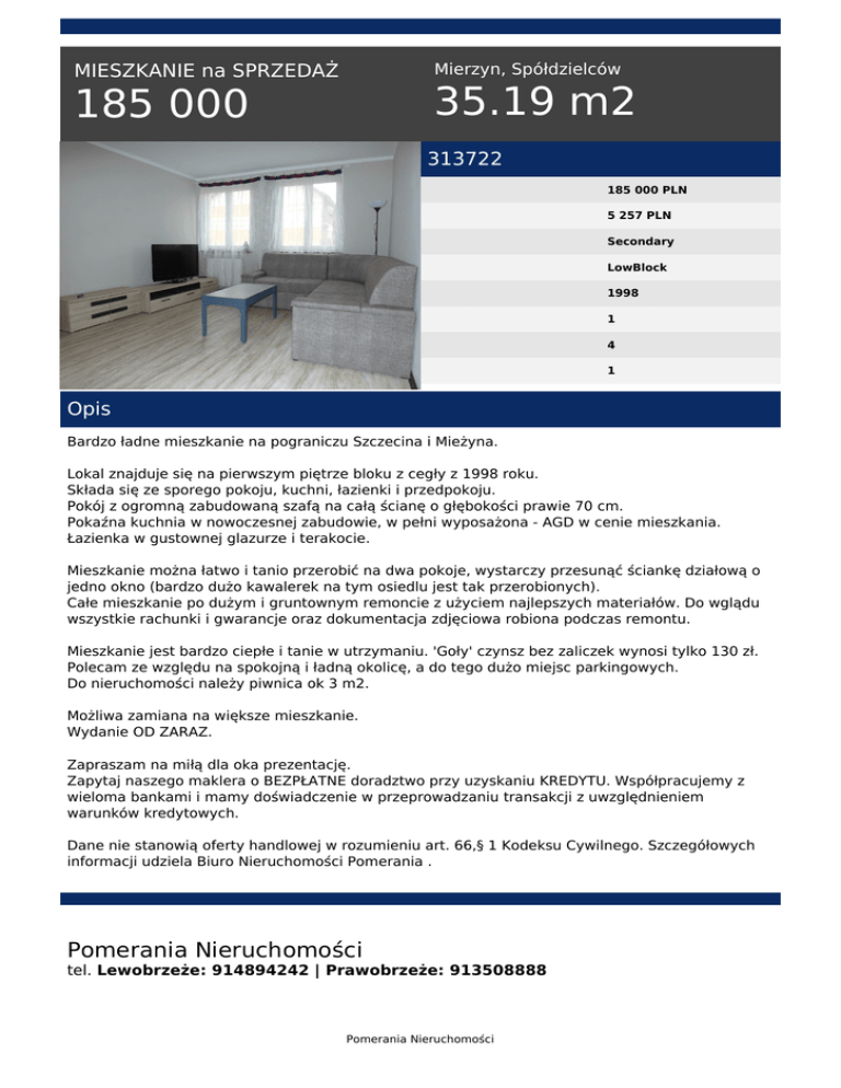 185 000 35.19 m2 - Pomerania Nieruchomości
