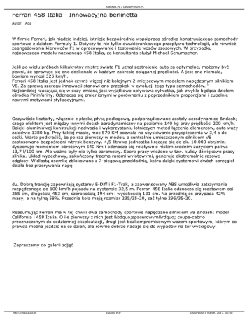AutoRok.PL / DesignForum.PL Ferrari 458 Italia - Innowacyjna berlinetta Autor: Aga W firmie Ferrari, jak nigdzie indziej, istnieje bezpośrednia współpraca ośrodka konstruującego samochody sportowe z działem Formuły 1. Dotyczy to nie tylko dwukierunkowego przepływu technologii, ale również zaangażowania kierowców F1 w opracowywanie i testowanie wozów szosowych. W przypadku najnowszego modelu nazwanego 458 Italia, za konsultanta służył Michael Schumacher. Jeśli po wielu próbach kilkukrotny mistrz świata F1 uznał zestrojenie auta za optymalne, możemy być pewni, że sprawuje się ono doskonale w każdym zakresie osiąganej prędkości. A jest ona niemała, bowiem wynosi 325 km/h. Ferrari 458 Italia jest jednak czymś więcej niż kolejnym 2-miejscowym modelem napędzanym silnikiem V8. Za sprawą szeregu innowacji stanowi ono przeskok w ewolucji tego typu samochodów. ' Najbardziej rzucającą się w oczy zmianą jest wyjątkowo opływowa sylwetka, jak zwykle będąca dziełem ośrodka Pininfariny. Odznacza się zmienionymi w porównaniu z poprzednikiem proporcjami i zupełnie nowymi motywami stylizacyjnymi. Oczywiście kształty, włącznie z płaską płytą podłogową, podporządkowane zostały aerodynamice – czego efektem jest między innymi docisk aerodynamiczny na poziomie 140 kg przy prędkości 200 km/h. Dzięki aluminiowej konstrukcji nadwozia i wykorzystaniu lotniczych metod łączenia elementów, auto waży zaledwie 1380 kg. Przy takiej masie, moc 570 KM pozwala na uzyskiwanie przyspieszenia w 3,4 s do setki. Warto podkreślić, że po raz pierwszy w modelu z centralnie umieszczonym silnikiem V8 zastosowano bezpośredni wtrysk benzyny. 4,5-litrowa jednostka kręcąca się do ok. 10.000 obr/min, dysponuje momentem obrotowym 540 Nm i odznacza się relatywnie niskim średnim zużyciem paliwa 13,7 l/100 km. Ale ważne były nie tylko parametry. Sporo pracy włożono w tzw. kulisy dźwiękowe pracy silnika. Układ wydechowy, zakończony trzema rurami wylotowymi, generuje ekstremalnie rasowe odgłosy. Widlastą ósemkę zblokowano z 7-biegową przekładnią, która dzięki systemowi dwóch sprzęgieł działa bez przerywania napę du. Dobrą trakcję zapewniają systemy E-Diff i F1-Trak, a zaawansowany ABS umożliwia zatrzymanie rozpędzonego do 100 km/h pojazdu na dystansie 32,5 m. Ferrari 458 Italia odznacza się rozstawem osi 265 cm, długością 453 cm, szerokością 194 cm i wysokością 121 cm. Na przednią oś przypada 42% masy, a na tylną 58%. Przednie koła mają rozmiar 235/35-20, zaś tylne 295/35-20. Reasumując Ferrari ma w tej chwili dwa samochody sportowe napędzane silnikiem V8 – model California i 458 Italia. O ile pierwszy z nich jest „spacerowym” coupe-cabrio przeznaczonym do codziennej eksploatacji, drugi jest bezkompromisowym wozem sportowym, którym co prawda można jeździć na co dzień, ale równie dobrze nadaje się do wypadów na tor wyścigowy. Zapraszamy do galerii zdjęć http://mas.auto.pl Kreator PDF Utworzono 4 March, 2017, 06:00