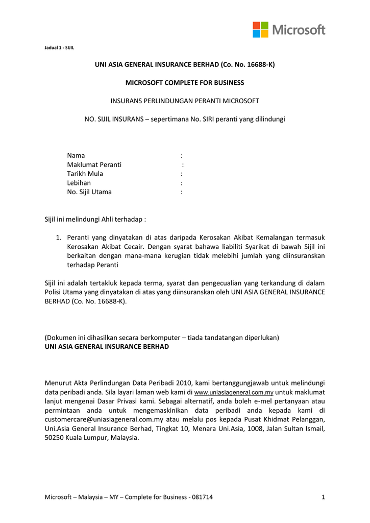 Jadual 1 - SIJIL UNI ASIA GENERAL INSURANCE BERHAD (Co. No. 16688-K) MICROSOFT COMPLETE FOR BUSINESS INSURANS PERLINDUNGAN PERANTI MICROSOFT NO. SIJIL INSURANS – sepertimana No. SIRI peranti yang dilindungi Nama Maklumat Peranti Tarikh Mula Lebihan No. Sijil Utama : : : : : Sijil ini melindungi Ahli terhadap : 1. Peranti yang dinyatakan di atas daripada Kerosakan Akibat Kemalangan termasuk Kerosakan Akibat Cecair. Dengan syarat bahawa liabiliti Syarikat di bawah Sijil ini berkaitan dengan mana-mana kerugian tidak melebihi jumlah yang diinsuranskan terhadap Peranti Sijil ini adalah tertakluk kepada terma, syarat dan pengecualian yang terkandung di dalam Polisi Utama yang dinyatakan di atas yang diinsuranskan oleh UNI ASIA GENERAL INSURANCE BERHAD (Co. No. 16688-K). (Dokumen ini dihasilkan secara berkomputer – tiada tandatangan diperlukan) UNI ASIA GENERAL INSURANCE BERHAD Menurut Akta Perlindungan Data Peribadi 2010, kami bertanggungjawab untuk melindungi data peribadi anda. Sila layari laman web kami di www.uniasiageneral.com.my untuk maklumat lanjut mengenai Dasar Privasi kami. Sebagai alternatif, anda boleh e-mel pertanyaan atau permintaan anda untuk mengemaskinikan data peribadi anda kepada kami di [email protected] atau melalu pos kepada Pusat Khidmat Pelanggan, Uni.Asia General Insurance Berhad, Tingkat 10, Menara Uni.Asia, 1008, Jalan Sultan Ismail, 50250 Kuala Lumpur, Malaysia. Microsoft – Malaysia – MY – Complete for Business - 081714 1 MICROSOFT COMPLETE FOR BUSINESS Ringkasan Terma dan Syarat untuk Program Perlindungan Peranti Apakah Perlindungan Yang Akan Anda Terima Jikalau Anda telah membayar Premium, dan Kami telah menerima permohonan anda, Kami bersetuju untuk melindungi Anda dalam Tempoh Insurans mengikut terma, syarat, pengecualian dan Had dalam Polisi Utama Apa Yang Akan Dibayar Kami akan melindungi Anda terhadap Kerosakan yang disebabkan Akibat Kemalangan (termasuk Kerosakan Akibat Cecair) Tanggungjawab Anda Untuk Memberitahu Apa Yang Perlu Anda Maklumkan Kepada Kami Anda mesti maklumkan semua perkara yang Anda tahu, atau sepatutnya tahu, yang mana boleh mempengaruhi keputusan Kami untuk melindungi Anda dan/ atau terma yang melindungi Anda. Anda perlu melakukan perkara ini semasa memohon Perlindungan insurans atau memperbaharui perlindungan insurans Anda. Apabila Kami merujuk kepada Anda soalan khusus, Anda hendaklah menjawab soalan dengan jujur. Adalah penting untuk setiap orang yang dilindungi di bawah insurans ini menjawab soalan dengan sejujurnya. Apa Yang Akan Berlaku Sekiranya Anda Tidak Memberitahu Kami Sekiranya Anda melindungi maklumat atau Anda tidak menjawab soalan Kami dengan cara seperti yang diterangkan, Kami boleh mengurangkan pembayaran Tuntutan Anda, atau Kami boleh membatalkan perlindungan polisi Anda. Sekiranya kegagalan Anda untuk memaklumkan Kami dianggap sebagai penipuan, atau jawapan Anda tidak benar, Kami boleh mengambilkira seolah-olah polisi Anda tidak pernah wujud. Adakah Anda Layak Untuk Perlindungan Anda akan layak dilindungi di bawah Polisi ini jika Anda adalah pembeli Peranti baru dari Microsoft dan Melebihi umur 18. Perkataan-Perkataan Yang Membawa Maksud Tertentu Sebahagian perkataan-perkataan di dalam Sijil Insurans/Polisi Utama membawa maksud tertentu. Perkataan-perkataan tersebut dan maksudnya adalah seperti di bawah. Microsoft – Malaysia – MY – Complete for Business - 081714 2 Kemalangan Bermaksud peristiwa luaran yang melibatkan kekerasan, keganasan dan yang menyebabkan Kerosakan yang tidak dijangka, berlaku secara kebetulan dan tanpa sebarang perancangan dan berlaku tanpa bergantung kepada sebab-sebab lain. Walaubagaimanapun, kecurian peranti adalah terkecuali. Sijil Insurans Bermaksud Sijil Insurans yang mengandungi perincian seperti nama Anda, perincian buatan dan model Peranti yang dilindungi. Ianya merupakan sebahagian daripada Polisi Utama, dan Anda hendaklah membacanya bersama-sama dengan terma-terma dan syarat-syarat di dalam Polisi Utama. Tuntutan Bermaksud tuntutan bagi mana-mana hak dan faedah di bawah Polisi Utama. Syarikat akan menyelesaikan Tuntutan dengan membayar pusat perkhidmatan yang disahkan. Kami, Syarikat Merujuk kepada UNI.ASIA GENERAL INSURANCE BERHAD Kerosakan Bermaksud Kerosakan fizikal, kemusnahan dan kegagalan Peranti Anda (termasuk, tetapi tidak terhad kepada, Kerosakan akibat cecair) yang menghalang Peranti Anda dari berfungsi dengan sewajarnya. Tarikh Kejadian Bermaksud tarikh apabila Kerosakan Akibat Kemalangan berlaku. Lebihan Bermaksud jumlah yang perlu ditanggung oleh Anda untuk setiap Tuntutan. Anda hendaklah membayar jumlah pertama untuk semua Tuntutan, dan jumlah Lebihan tersebut dinyatakan di dalam Polisi Anda. Kejadian Bermaksud peristiwa Kerosakan Akibat Kemalangan (termasuk Kerosakan Akibat Cecair) berlaku. Anda Merujuk kepada individu yang namanya dinyatakan dalam Sijil tertakluk kepada terma kelayakan yang telah ditentukan oleh syarikat dari masa ke semasa. Ahli yang Diinsuranskan Polisi ini meliputi peranti yang digunakan oleh organisasi, pekerja ataupun individu. Microsoft – Malaysia – MY – Complete for Business - 081714 3 Had Bermaksud jumlah maksimum yang dibayar di bawah Polisi Utama ini dalam Tempoh Perlindungan untuk penggantian atau pembaikan Peranti; Harga Penggantian atau kos pembaikan dan dua tuntutan maksimum hanya untuk tempoh perlindungan tetapi jumlah semua faedah yang dibayar atau perlu dibayar semasa polisi ini berkuatkuasa tidak akan melebihi agregat dua kali jumlah yang diinsuranskan peranti. Penukaran Material Bermaksud apa-apa penukaranan material yang melibatkan fungsi Peranti yang dilindungi, samada meningkatkan keupayaannya atau penglibatan yang dapat mengurangkan keupayaannya daripada spesifikasi asal pengeluar. Peranti Bermaksud Peranti yang dinyatakan di dalam Sijil Insurans Ahli yang Diinsuranskan termasuk nombor SIRI, pengeluar dan ciri-ciri model. Tempoh Perlindungan Bermaksud Tempoh Perlindungan dimana Kami telah menerima Caruman daripa