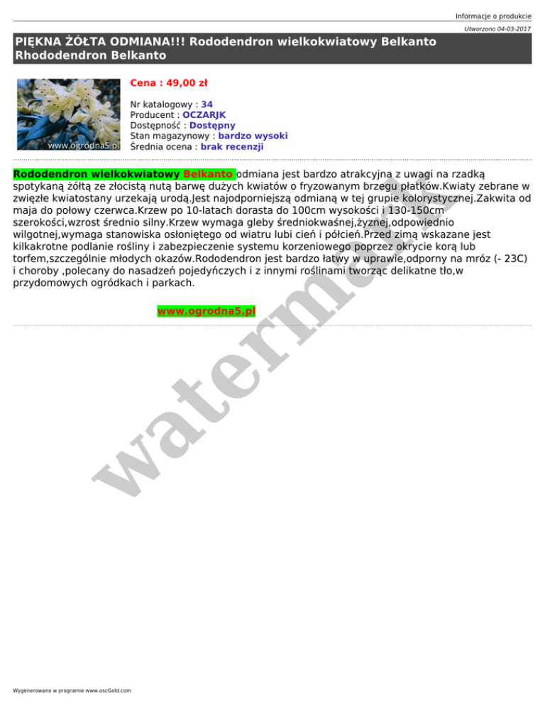 Informacje o produkcie Utworzono 04-03-2017 PIĘKNA ŻÓŁTA ODMIANA!!! Rododendron wielkokwiatowy Belkanto Rhododendron Belkanto Cena : 49,00 zł Nr katalogowy : 34 Producent : OCZARJK Dostępność : Dostępny Stan magazynowy : bardzo wysoki Średnia ocena : brak recenzji er m ar k Rododendron wielkokwiatowy Belkanto odmiana jest bardzo atrakcyjna z uwagi na rzadką spotykaną żółtą ze złocistą nutą barwę dużych kwiatów o fryzowanym brzegu płatków.Kwiaty zebrane w zwięzłe kwiatostany urzekają urodą.Jest najodporniejszą odmianą w tej grupie kolorystycznej.Zakwita od maja do połowy czerwca.Krzew po 10-latach dorasta do 100cm wysokości i 130-150cm szerokości,wzrost średnio silny.Krzew wymaga gleby średniokwaśnej,żyznej,odpowiednio wilgotnej,wymaga stanowiska osłoniętego od wiatru lubi cień i półcień.Przed zimą wskazane jest kilkakrotne podlanie rośliny i zabezpieczenie systemu korzeniowego poprzez okrycie korą lub torfem,szczególnie młodych okazów.Rododendron jest bardzo łatwy w uprawie,odporny na mróz (- 23C) i choroby ,polecany do nasadzeń pojedyńczych i z innymi roślinami tworząc delikatne tło,w przydomowych ogródkach i parkach. w at www.ogrodna5.pl Wygenerowano w programie www.oscGold.com
