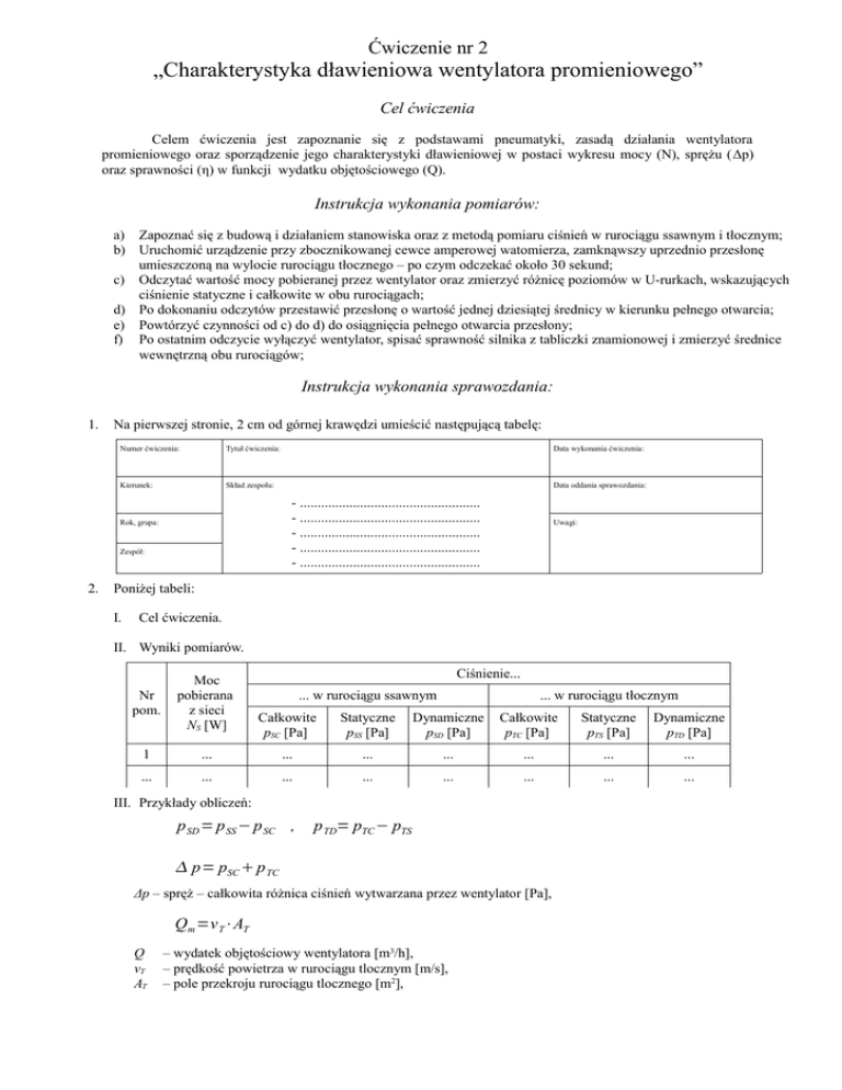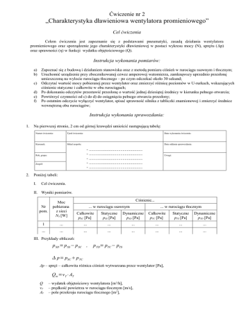Ćwiczenie nr 2 „Charakterystyka dławieniowa wentylatora promieniowego” Cel ćwiczenia Celem ćwiczenia jest zapoznanie się z podstawami pneumatyki, zasadą działania wentylatora promieniowego oraz sporządzenie jego charakterystyki dławieniowej w postaci wykresu mocy (N), sprężu (Δp) oraz sprawności (η) w funkcji wydatku objętościowego (Q). Instrukcja wykonania pomiarów: a) Zapoznać się z budową i działaniem stanowiska oraz z metodą pomiaru ciśnień w rurociągu ssawnym i tłocznym; b) Uruchomić urządzenie przy zbocznikowanej cewce amperowej watomierza, zamknąwszy uprzednio przesłonę umieszczoną na wylocie rurociągu tłocznego – po czym odczekać około 30 sekund; c) Odczytać wartość mocy pobieranej przez wentylator oraz zmierzyć różnicę poziomów w U-rurkach, wskazujących ciśnienie statyczne i całkowite w obu rurociągach; d) Po dokonaniu odczytów przestawić przesłonę o wartość jednej dziesiątej średnicy w kierunku pełnego otwarcia; e) Powtórzyć czynności od c) do d) do osiągnięcia pełnego otwarcia przesłony; f) Po ostatnim odczycie wyłączyć wentylator, spisać sprawność silnika z tabliczki znamionowej i zmierzyć średnice wewnętrzną obu rurociągów; Instrukcja wykonania sprawozdania: 1. Na pierwszej stronie, 2 cm od górnej krawędzi umieścić następującą tabelę: Numer ćwiczenia: Tytuł ćwiczenia: Kierunek: Skład zespołu: Data oddania sprawozdania: - ................................................... - ................................................... - ................................................... - ................................................... - ................................................... Rok, grupa: Zespół: 2. Data wykonania ćwiczenia: Uwagi: Poniżej tabeli: I. Cel ćwiczenia. II. Wyniki pomiarów. Nr pom. Moc pobierana z sieci NS [W] 1 ... Ciśnienie... ... w rurociągu ssawnym ... w rurociągu tłocznym Całkowite pSC [Pa] Statyczne pSS [Pa] Dynamiczne pSD [Pa] Całkowite pTC [Pa] Statyczne pTS [Pa] Dynamiczne pTD [Pa] ... ... ... ... ... ... ... ... ... ... ... ... ... ... III. Przykłady obliczeń: p SD = p SS − p SC , p TD= pTC − pTS p= pSC p TC Δp – spręż – całkowita różnica ciśnień wytwarzana przez wentylator [Pa], Qm =v T⋅AT Q vT AT – wydatek objętościowy wentylatora [m3/h], – prędkość powietrza w rurociągu tlocznym [m/s], – pole przekroju rurociągu tlocznego [m2], p v T = 2⋅ TD ρ – gęstość powietrza [kg/m3], N = N S⋅S , = N UŻ N N – moc mechaniczna dostarczana wentylatorowi przez silnik [W], NS – moc pobierana przez silnik z sieci [W], NUŻ – moc użyteczna [W], N UŻ =Q⋅ p IV. Wyniki obliczeń: Nr pomiaru Spęż Δp [Pa] Prędkość powietrza w rurociągu tł. v [m/s] Wydatek objętościowy wentylatora Q [m3/h] Moc pobierana przez wentylator N [W] Sprawność wentylatora η [-] 1 ... ... ... ... ... ... ... ... ... ... ... V. Wnioski. VI. Załączniki (wykres: N,Δp,η = f(Q), brudnopis). Moc użyteczna NUŻ [W]