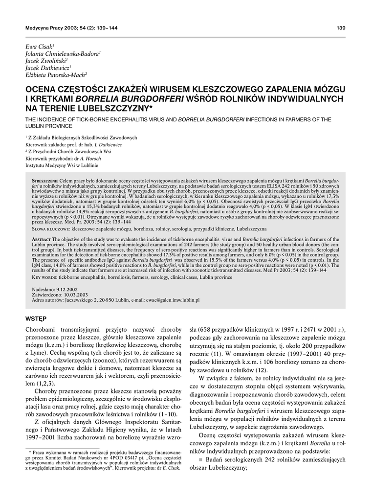 Medycyna Pracy 2003; 54 (2): 139–144 139 Ewa Cisak1 Jolanta Chmielewska-Badora1 Jacek Zwoliński1 Jacek Dutkiewicz1 Elżbieta Patorska-Mach2 OCENA CZĘSTOŚCI ZAKAŻEŃ WIRUSEM KLESZCZOWEGO ZAPALENIA MÓZGU I KRĘTKAMI BORRELIA BURGDORFERI WŚRÓD ROLNIKÓW INDYWIDUALNYCH NA TERENIE LUBELSZCZYZNY* THE INCIDENCE OF TICK-BORNE ENCEPHALITIS VIRUS AND BORRELIA BURGDORFERI INFECTIONS IN FARMERS OF THE LUBLIN PROVINCE 1 Z Zakładu Biologicznych Szkodliwości Zawodowych Kierownik zakładu: prof. dr hab. J. Dutkiewicz 2 Z Przychodni Chorób Zawodowych Wsi Kierownik przychodni: dr A. Horoch Instytutu Medycyny Wsi w Lublinie STRESZCZENIE Celem pracy było dokonanie oceny częstości występowania zakażeń wirusem kleszczowego zapalenia mózgu i krętkami Borrelia burgdorferi u rolników indywidualnych, zamieszkujących tereny Lubelszczyzny, na podstawie badań serologicznych testem ELISA 242 rolników i 50 zdrowych krwiodawców z miasta jako grupy kontrolnej. W przypadku obu tych chorób, przenoszonych przez kleszcze, odsetki reakcji dodatnich były znamiennie wyższe u rolników niż w grupie kontrolnej. W badaniach serologicznych, w kierunku kleszczowego zapalenia mózgu, wykazano u rolników 17,3% wyników dodatnich, natomiast w grupie kontrolnej odsetek ten wyniósł 6,0% (p < 0,05). Obecność swoistych przeciwciał IgG przeciwko Borrelia burgdorferi stwierdzono u 15,3% badanych rolników, natomiast w grupie kontrolnej dodatnio reagowało 4,0% (p < 0,05). W klasie IgM stwierdzono u badanych rolników 14,9% reakcji seropozytywnych z antygenem B. burgdorferi, natomiast u osób z grupy kontrolnej nie zaobserwowano reakcji seropozytywnych (p < 0,01). Otrzymane wyniki wskazują, że u rolników występuje zawodowe ryzyko zachorowań na choroby odzwierzęce przenoszone przez kleszcze. Med. Pr. 2003; 54 (2): 139–144 Słowa kluczowe: kleszczowe zapalenie mózgu, borelioza, rolnicy, serologia, przypadki kliniczne, Lubelszczyzna ABSTRACT The objective of the study was to evaluate the incidence of tick-borne encephalitis virus and Borrelia burgdorferi infections in farmers of the Lublin province. The study involved sero-epidemiological examinations of 242 farmers (the study group) and 50 healthy urban blood donors (the control group). In both tick-transmitted diseases, the frequency of sero-positive reactions was significantly higher in farmers than in controls. Serological examinations for the detection of tick-borne encephalitis showed 17.3% of positive results among farmers, and only 6.0% (p < 0.05) in the control group. The presence of specific antibodies IgG against Borrelia burgdorferi was observed in 15.3% of the farmers versus 4.0% (p < 0.05) in controls. In the IgM class, 14.0% of farmers showed positive reactions to B. burgdorferi, while in the control group no sero-positive reactions were noted (p < 0.01). The results of the study indicate that farmers are at increased risk of infection with zoonotic tick-transmitted diseases. Med Pr 2003; 54 (2): 139–144 Key words: tick-borne encephalitis, borreliosis, farmers, serology, clinical cases, Lublin province Nadesłano: 9.12.2002 Zatwierdzono: 10.03.2003 Adres autorów: Jaczewskiego 2, 20-950 Lublin, e-mail: [email protected] WSTĘP Chorobami transmisyjnymi przyjęto nazywać choroby przenoszone przez kleszcze, głównie kleszczowe zapalenie mózgu (k.z.m.) i boreliozę (krętkowicę kleszczową, chorobę z Lyme). Cechą wspólną tych chorób jest to, że zaliczane są do chorób odzwierzęcych (zoonoz), których rezerwuarem są zwierzęta kręgowe dzikie i domowe, natomiast kleszcze są zarówno ich rezerwuarem jak i wektorem, czyli przenosicielem (1,2,3). Choroby przenoszone przez kleszcze stanowią poważny problem epidemiologiczny, szczególnie w środowisku eksploatacji lasu oraz pracy rolnej, gdzie często mają charakter chorób zawodowych pracowników leśnictwa i rolników (1–10). Z oficjalnych danych Głównego Inspektoratu Sanitarnego i Państwowego Zakładu Higieny wynika, że w latach 1997–2001 liczba zachorowań na boreliozę wyraźnie wzro* Praca wykonana w ramach realizacji projektu badawczego finansowanego przez Komitet Badań Naukowych nr 4POD 03417 pt. „Ocena częstości występowania chorób transmisyjnych w populacji rolników indywidualnych z uwzględnieniem badań środowiskowych”. Kierownik projektu: dr E. Cisak. sła (658 przypadków klinicznych w 1997 r. i 2471 w 2001 r.), podczas gdy zachorowania na kleszczowe zapalenie mózgu utrzymują się na stałym poziomie, tj. około 200 przypadków rocznie (11). W omawianym okresie (1997–2001) 40 przypadków klinicznych k.z.m. i 106 boreliozy uznano za choroby zawodowe u rolników (12). W związku z faktem, że rolnicy indywidualni nie są jeszcze w dostatecznym stopniu objęci systemem wykrywania, diagnozowania i rozpoznawania chorób zawodowych, celem obecnych badań była ocena częstości występowania zakażeń krętkami Borrelia burgdorferi i wirusem kleszczowego zapalenia mózgu w populacji rolników indywidualnych z terenu Lubelszczyzny, w aspekcie zagrożenia zawodowego. Ocenę częstości występowania zakażeń wirusem kleszczowego zapalenia mózgu (k.z.m.) i krętkami Borrelia u rolników indywidualnych przeprowadzono na podstawie: Badań serologicznych 242 rolników zamieszkujących obszar Lubelszczyzny; 140 E. Cisak i wsp. Sporządzonej w Instytucie Medycyny Wsi (IMW) bazy danych obejmującej przypadki kliniczne k.z.m. i boreliozy zarejestrowane na terenie województwa lubelskiego w latach 1994–2001. Nr 2 bę przypadków k.z.m. i boreliozy zarejestrowaną w bazie danych, przeliczono na 100 000 mieszkańców miast i wsi woj. lubelskiego. WYNIKI BADAŃ MATERIAŁ I METODY Badania serologiczne W latach 1999–2002 zbadano serologicznie w kierunku kleszczowego zapalenia mózgu i boreliozy 242 rolników indywidualnych zamieszkujących tereny woj. lubelskiego (114 kobiet w wieku od 17 do 76 lat i 128 mężczyzn w wieku od 18 do 84 lat). Średni wiek bad