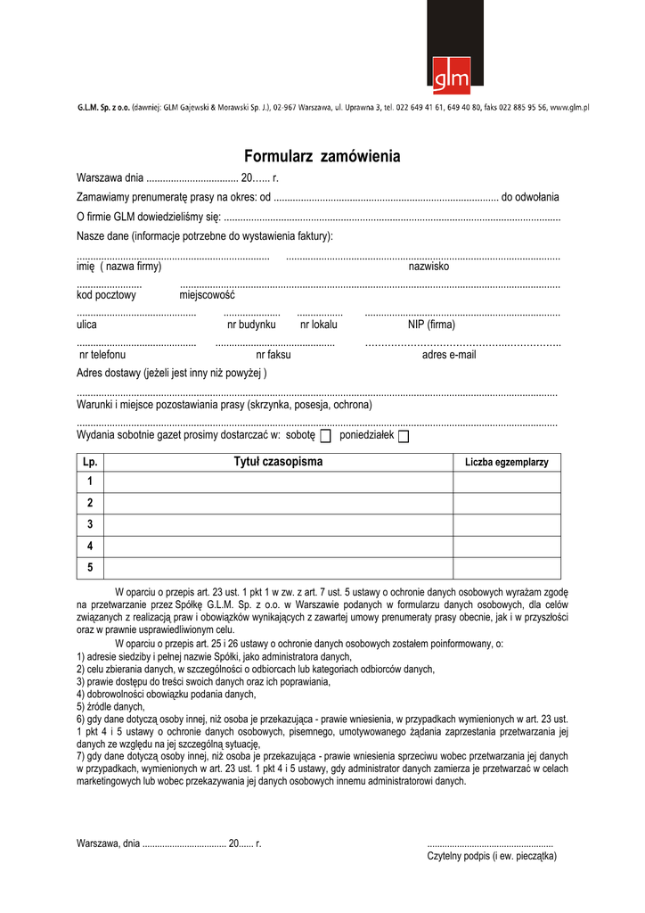 Formularz zamówienia Warszawa dnia .................................. 20…... r. Zamawiamy prenumeratę prasy na okres: od ................................................................................... do odwołania O firmie GLM dowiedzieliśmy się: ............................................................................................................................ Nasze dane (informacje potrzebne do wystawienia faktury): ....................................................................... ..................................................................................................... imię ( nazwa firmy) nazwisko ........................ ............................................................................................................................................ kod pocztowy miejscowość ............................................ ..................... ................. ........................................................................ ulica nr budynku nr lokalu NIP (firma) ............................................ ............................................ ……………………………………..…………….. nr telefonu nr faksu adres e-mail Adres dostawy (jeżeli jest inny niż powyżej ) ................................................................................................................................................................................. Warunki i miejsce pozostawiania prasy (skrzynka, posesja, ochrona) ................................................................................................................................................................................. Wydania sobotnie gazet prosimy dostarczać w: sobotę poniedziałek Lp. Tytuł czasopisma Liczba egzemplarzy 1 2 3 4 5 W oparciu o przepis art. 23 ust. 1 pkt 1 w zw. z art. 7 ust. 5 ustawy o ochronie danych osobowych wyrażam zgodę na przetwarzanie przez Spółkę G.L.M. Sp. z o.o. w Warszawie podanych w formularzu danych osobowych, dla celów związanych z realizacją praw i obowiązków wynikających z zawartej umowy prenumeraty prasy obecnie, jak i w przyszłości oraz w prawnie usprawiedliwionym celu. W oparciu o przepis art. 25 i 26 ustawy o ochronie danych osobowych zostałem poinformowany, o: 1) adresie siedziby i pełnej nazwie Spółki, jako administratora danych, 2) celu zbierania danych, w szczególności o odbiorcach lub kategoriach odbiorców danych, 3) prawie dostępu do treści swoich danych oraz ich poprawiania, 4) dobrowolności obowiązku podania danych, 5) źródle danych, 6) gdy dane dotyczą osoby innej, niż osoba je przekazująca - prawie wniesienia, w przypadkach wymienionych w art. 23 ust. 1 pkt 4 i 5 ustawy o ochronie danych osobowych, pisemnego, umotywowanego żądania zaprzestania przetwarzania jej danych ze względu na jej szczególną sytuację, 7) gdy dane dotyczą osoby innej, niż osoba je przekazująca - prawie wniesienia sprzeciwu wobec przetwarzania jej danych w przypadkach, wymienionych w art. 23 ust. 1 pkt 4 i 5 ustawy, gdy administrator danych zamierza je przetwarzać w celach marketingowych lub wobec przekazywania jej danych osobowych innemu administratorowi danych. Warszawa, dnia .................................. 20...... r. ................................................... Czytelny podpis (i ew. pieczątka) Regulamin dostawy prasy w prenumeracie 1. 2. 3. 4. 5. 6. 7. 8. 9. 10. 11. 12. 13. 14. 15. 16. 17. 18. GLM zobowiązuje się do dostawy prasy wskazanej przez Odbiorcę na podstawie pisemnego zamówienia przesłanego listownie lub drogą elektroniczną, przy czym dostawa będzie realizowana po ustaleniu, czy Odbiorca znajduje się w okręgu świadczenia przez GLM dostawy prasy, po pisemnym potwierdzeniu przyjęcia zamówienia i po udzieleniu przez Odbiorcę pisemnej zgody na przetwarzanie jego danych osobowych. Odbiorca zobowiązuje się do wyznaczenia (portiernia, recepcja, skrzynka pocztowa, posesja) i udostępnienia (kod lub klucz do domofonu, klucz do skrzynki pocztowe lub/ i, powiadomienia portiera lub recepcjonisty o fakcie dostaw prasy) miejsca pozostawiania prasy, w ten sposób, aby zapobiec jej zabraniu przez osoby trzecie. Jeżeli odbiorca nie wyznaczy miejsca pozostawienia prasy lub wyznaczone miejsce nie będzie należycie zabezpieczone, firma GLM nie ponosi odpowiedzialności za brak prasy powstały w wyniku kradzieży przez osoby trzecie lub zniszczenia, bądź zaginięcia paczek z prasą. Odbiorca ma możliwość dokonywania zmian w zamówieniu po uprzedniej konsultacji z sekcją działu współpracy z klientami GLM. Firma GLM zobowiązuje się realizować zmiany w zamówieniu w możliwie najkrótszym czasie. Prasa krajowa (dzienniki centralne/czasopisma) dostarczana jest w dniu wydania/wprowadzenia do sprzedaży nie później niż o godzinie 8:00 do miejsca wskazanego zgodnie z postanowieniami pkt 1 regulaminu. Dostawa prasy krajowej może ulec opóźnieniu z przyczyn niezawinionych przez GLM. Prasa krajowa regionalna (dzienniki regionalne, regionalne mutacje dzienników centralnych poza mutacją warszawską) dostarczane są do miejsca wskazanego zgodnie z postanowieniami pkt 1 regulaminu w możliwie najkrótszym czasie od daty ich wydania. Prasa zagraniczna poranna dostarczana jest niezwłocznie po jej dostarczeniu transportem lotniczym do Warszawy. Prasa zagraniczna popołudniowa dostarczana jest następnego roboczego dnia w godzinach porannych, nie później niż w godzinach przedpołudniowych. Dostawy prasy realizowane są od poniedziałku do soboty z wyjątkiem świąt i dni ustawowo wolnych od pracy. Na życzenie sobotnią prasę dostarczamy w poniedziałek. Na życzenie - do paczek z prasą dołączamy specyfikację zawartości. Ewentualne reklamacje dotyczące dostawy prasy rozpatrujemy niezwłocznie po ich zgłoszeniu. Telefony reklamacyjne czynne od poniedziałku do piątku w godzinach 8:00 - 16:00: (+48 22) 649 40 80, 649 41 61 Reklamacje zgłoszone do go