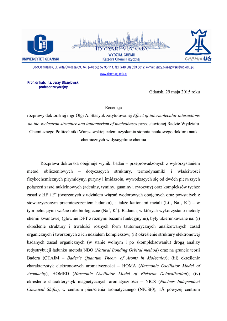 80-308 Gdańsk, ul. Wita Stwosza 63, tel. (+48 58) 52 35 111, fax (+48 58) 523 5012, e-mail: [email protected], www.chem.ug.edu.pl Prof. dr hab. inż. Jerzy Błażejowski profesor zwyczajny Gdańsk, 29 maja 2015 roku Recenzja rozprawy doktorskiej mgr Olgi A. Stasyuk zatytułowanej Effect of intermolecular interactions on the π-electron structure and tautomerism of nucleobases przedstawionej Radzie Wydziału Chemicznego Politechniki Warszawskiej celem uzyskania stopnia naukowego doktora nauk chemicznych w dyscyplinie chemia Rozprawa doktorska obejmuje wyniki badań – przeprowadzonych z wykorzystaniem metod obliczeniowych – dotyczących struktury, termodynamiki i właściwości fizykochemicznych pirymidyny, puryny i imidazolu, wywodzących się od dwóch pierwszych połączeń zasad nukleinowych (adeniny, tyminy, guaniny i cytozyny) oraz kompleksów tychże zasad z HF i F¯ (tworzonych z udziałem wiązań wodorowych obojętnych oraz powstałych z stowarzyszonym przemieszczeniem ładunku), a także kationami metali (Li+, Na+, K+) – w tym pełniącymi ważne role biologiczne (Na+, K+). Badania, w których wykorzystano metody chemii kwantowej (głównie DFT z różnymi bazami funkcyjnymi), były ukierunkowane na: (i) określenie struktury i trwałości rożnych form tautomerycznych analizowanych zasad organicznych i tworzonych z ich udziałem kompleksów; (ii) określenie struktury elektronowej badanych zasad organicznych (w stanie wolnym i po skompleksowaniu) drogą analizy redystrybucji ładunku metodą NBO (Natural Bonding Orbital method) oraz na gruncie teorii Badera (QTAIM – Bader’s Quantum Theory of Atoms in Molecules); (iii) określenie charakterystyk elektronowych aromatyczności – HOMA (Harmonic Oscillator Model of Aromacity), HOMED (Harmonic Oscillator Model of Elektron Delocalization); (iv) określenie charakterystyk magnetycznych aromatyczności – NICS (Nucleus Independent Chemical Shifts), w centrum pierścienia aromatycznego (NICS(0), 1Å powyżej centrum NICS(1) oraz jako składowej tensora prostopadłej do płaszczyzny pierścienia aromatycznego (NICS(1)zz); oraz (v) określenie (w niektórych przypadkach – tyminy) charakterystyk numerycznych aromatyczności – indeksów wiązań Wiberga. Zgromadzone wyniki, w efekcie przeprowadzonych na szeroką skalę badań, były analizowane pod kątem: względnej trwałości różnych form tautomerycznych zasad organicznych, zmian strukturalnych będących efektem funkcjonalizacji (obecności grup egzocyklicznych amino/imino lub karbonylo/hydroksylo) oraz uczestnictwa zasad w oddziaływaniach międzycząsteczkowych, zmian w rozkładzie gęstości elektronowej i aromatyczności wskutek funkcjonalizacji i kompleksowania, a także znaczenia dla zrozumienia zachowania zasad nukleinowych wkomponowanych w złożone struktury kwasów nukleinowych w układach biologicznych. Tematyka rozprawy wkomponowuje się w główny nurt badań współczesnej chemii i biochemii. W pełni spełnia kanony nowoczesnych badań naukowych. W tym kontekście wybór tematyki rozprawy uznać należy za trafny i wychodzący naprzeciw oczekiwaniom kierowanym pod adresem środowisk naukowych. Rozprawa doktorska, przygotowana pod okiem doświadczonych uczonych dr hab. Haliny Szatyłowicz i prof. T.M. Krygowskiego, bazuje na 5 pracach oryginalnych (opublikowanych (4) lub w druku (1)) oraz 1 pracy przeglądowej (kopie stanowią załączniki rozprawy), które ukazały się w wysokiej i najwyższej rangi czasopismach o zasięgu światowym z zakresu chemii (w nawiasach IF): Chem. Rev. (45,661) – 1, J. Org. Chem. (4,638) – 1, Org. Biomol. Chem. (3.487) – 2, Struct. Chem. (1,900) – 1 i Croat. Chim. Acta (0,667) – 1. Tekst rozprawy podzielony jest na 3 rozdziały: przegląd literaturowy, metodologia oraz komentarz do serii publikacji (6). W rozdziale pierwszym zostały omówione zagadnienia dotyczące tautomerii zasad nukleinowych, wiązań wodorowych w układach biologicznych, umiejscowienia jonów metali w strukturach DNA i ich funkcji oraz aromatyczności zasad nukleinowych. W rozdziale drugim zarysowane zostały techniki obliczeniowe oraz wskazane metody określania deskryptorów strukturalnych, gęstości elektronowej i aromatyczności. Rozdział trzeci obejmuje przegląd wyników zamieszczonych w 6 wspomnianych powyżej publikacjach oraz ich dyskusję. Rozdziały 1-3 poprzedza streszczenie rozprawy w języku angielskim i polskim, wykaz publikacji na których bazuje, spis treści, lista skrótów oraz wprowadzenie, w którym zostały jasno wyartykułowane cele badań. Zasadnicze osiągnięcia badań przedstawionych w rozprawie są przedstawione w podsumowaniu. W tekście pisanym kandydatka odwołuje się do 222 pozycji najnowszej literatury. Rozprawa została przygotowana zgodnie z obowiązującymi przepisami i ukształtowaną przez lata tradycją. 2 Istotne odkrycia i osiągnięcia rozprawy doktorskiej scharakteryzowane są poniżej: • Znaczące poszerzenie i usystematyzowanie fundamentalnej wiedzy z zakresu tautomerii, aromatyczności i zachowania zasad nukleinowych, ich prekursorów oraz kompleksów z HF, F¯, Li+, Na+ i K+. • Wykazanie, że prekursory zasad nukleinowych (pirymidyna, puryna) oraz molekuła stanowiąca fragment jednej z nich (imidazol) tworzą kompleksy z HF i F¯ wskutek powstawania (odpowiednio) obojętnych i stowarzyszonych z przemieszczeniem ładunku wiązań wodorowych z udziałem endocyklicznych atomów azotu. Wiązania obojętne są słabsze od stowarzyszonych z przemieszczeniem ładunku. W obu przypadkach brak istotnego wpływu na parametry aromatyczności. • Wykazanie, że stabilność tautomerów zasad nukleinowych nie zawsze koreluje z parametrami aromatyczności – jak ma to miejsce w przypadku puryny, gdzie wraz ze wzrostem stabilności tautomerów rosną wartości parametrów aromatyczności (HOMA i NICS). Na aromatyczność zasad nukleinowych wpływ mają egzocykliczne grupy funkcyjne. Grupy, w których ob