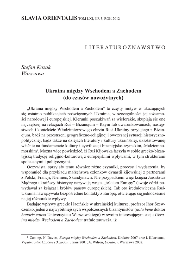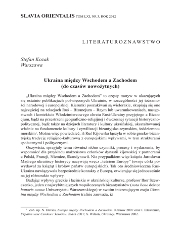 SLAVIA ORIENTALIS tom lxI, nr 3, rok 2012 L I T E R AT U R O Z N AW S T W O Stefan Kozak Warszawa Ukraina między Wschodem a Zachodem (do czasów nowożytnych) „Ukraina między Wschodem a Zachodem” to częsty motyw w ukazujących się ostatnio publikacjach poświęconych Ukrainie, w szczególności jej tożsamości narodowej i europejskiej. Kierunki poszukiwań są wielorakie, skupiają się one najczęściej na relacjach Ruś – Bizancjum – Rzym lub uwarunkowaniach, następstwach i kontekście Włodzimierzowego chrztu Rusi-Ukrainy przyjętego z Bizancjum, bądź na przestrzeni geograficzno-religijnej i ówczesnej sytuacji historycznopolitycznej, bądź także na dziejach literatury i kultury ukraińskiej, ukształtowanej właśnie na fundamencie kultury i cywilizacji bizantyjsko-rzymskim, śródziemnomorskim1. Można więc powiedzieć, iż Ruś Kijowska łączyła w sobie grecko-bizantyjską tradycję religijno-kulturową z europejskimi wpływami, w tym strukturami społecznymi i politycznymi. Oczywista, sprzyjały temu również różne czynniki, procesy i wydarzenia, by wspomnieć dla przykładu małżeństwa członków dynastii kijowskiej z partnerami z Polski, Francji, Niemiec, Skandynawii. Nie przypadkiem więc księcia Jarosława Mądrego ukraińscy historycy nazywają wręcz „teściem Europy” (swoje córki powydawał za książąt i królów państw europejskich). Tak oto średniowieczna RuśUkraina nawiązywała bezpośrednie kontakty z Europą, otwierając się jednocześnie na jej różnorakie wpływy. Badając wpływy greckie i łacińskie w ukraińskiej kulturze, profesor Ihor Szewczenko, jeden z najwybitniejszych współczesnych bizantynistów (nota bene doktor honoris causa Uniwersytetu Warszawskiego) w swoim interesującym eseju Ukraina między Wschodem a Zachodem trafnie zauważa, iż 1 Zob. np. N. Davies, Europa między Wschodem a Zachodem. Kraków 2007 oraz І. Шевченко, Україна між Сходом і Заходом. Львів 2001; A. Wilson, Ukraińcy. Warszawa 2002. 286 STEFAN KOZAK Bizancjum – czy też, jeśli ktoś woli, Konstantynopol – leży nie na wschód, lecz na południe, a nawet południowy zachód od Kijowa. Wynika z tego, że w przypadku Bizancjum powinniśmy mówić o wpływie wywieranym na Ukrainę nie przez Wschód, lecz przez część cywilizacji śródziemnomorskiej. Mimo to czujemy instynktownie, że Wschód oznacza Bizancjum, a Zachód oznacza Europę2. To przewodni motyw cytowanej pracy uczonego. Wiele wątków owej opozycji „Wschód-Zachód”, ciągłości i zmienności wpływów helleńsko-łacińskich, występujących w różnych okresach historycznych i kulturowych dziejów Ukrainy lub sąsiedzkiego, zwłaszcza polskiego pośrednictwa na Ukrainie, wejdzie do podstawowego kanonu pytań i lektur tytułowego zagadnienia. Warto przypomnieć, że niektóre rozdziały owej książki Ihora Szewczenki ukazały się jako trzeci tom znakomitej serii wydawniczej Ośrodka Badań nad Tradycją Antyczną w Polsce i w Europie Środkowo-Wschodniej Uniwersytetu Warszawskiego pt. Ukraina miedzy Wschodem a Zachodem3. Godzi się podkreślić, iż tę interesującą serię tego Ośrodka zapoczątkowały takie publikacje, jak Tradycje antyczne w kulturze europejskiej – perspektywa polska (1995) oraz Łacina w Polsce. Konteksty: między Slavia Latina i Slavia Orthodoxa (1995). W kontekście drugiego tytułowego ujęcia zwraca na siebie uwagę szkic otwierający tom pt. Latinitas Slaviae Romanae wybitnego włoskiego slawisty Riccarda Picchio. Jego ideą jest wyjście poza spór między Slavia Latina i Slavia Orthodoxa, zaś wyraźnym postulatem jest potraktowanie łacińskości Słowiańszczyzny jako zjawiska porównywalnego z łacińskością europejskiej wspólnoty zachodniej tradycji rzymskiej. Oczywista, jest to teza miła uchu Słowianina, ale nieco przesadna, wszak każdy naród słowiański przyjmował humanistyczną tradycję łacińską w różnym czasie, z różna intensywnością i nasileniem; stąd też Riccardo Piccho wyprowadza wniosek, że znajomość kultury klasycznej na ziemiach ukraińskich rozpowszechniła się zwłaszcza w stuleciach XVI i XVII dzięki wzorom łacińsko-polskim. Nauczanie poetyki i retoryki przyczyniło się wtedy do upowszechnienia w kulturze ruskiej sposobu pojmowania pisarskiej twórczości skrajnie różnego od tego, który przez stulecia narzuciła doktryna kościelna Słowiańszczyzny prawosławnej. Zastąpienie klasyczno-humanistycznymi normami staroruskich paradygmatów pisarskich i doktrynalnych, wywołało silny szok, którego skutki dość szybko z ziem ukraińskich sięgnęły państwa moskiewskiego4. І. Шевченко, op. cit., s. 1-2. Szeroki kontekst tego problemu prezentuje w cytowanej pracy Norman Davies oraz Andrew Wilson. 3 I. Ševčenko, Ukraina między Wschodem a Zachodem. Warszawa OBTA 1996. Jest to przekład esejów dokonany z angielskiego oryginału. 4 Łacina w Polsce. Konteksty: między Slavia Latina i Slavia Ortodoxa. Warszawa OBTA 1995, s. 11. 2 UKRAINA MIĘDZY WSCHODEM A ZACHODEM... 287 Pozostając w zakreślonym tu kręgu myślowym, należy podkreślić, iż przełomową rolę w europeizacji tożsamości kulturowej na Ukrainie odegrały dwie uczelnie – Akademia Ostrogska i Akademia Kijowsko-Mohylańska, wzorowane na szkołach jezuickich, które w okresie ponad 20 lat panowania hetmana Iwana Mazepy (wybitnego mecenata kultury i sztuki, zdecydowanego okcydentalisty) przeżywały swój burzliwy rozwój i rozgłos w Europie. Godzi się przy tej okazji zaznaczyć, iż interesującą egzemplifikację wybranych zagadnień przedstawiły we wspomnianym zbiorze dwie badaczki: Natalia Jakowenko w artykule Niespodzianki ukraińskiej historii przedstawionej po łacinie oraz Teresa Chyczewska-Hennel w syntetycznym szkicu Łacina na Zaporożu. W obu tekstach przekonująco ukazano, jak naturalnym procesem było upowszechnianie się łaciny w ówczesnym piśmiennictwie ukrai