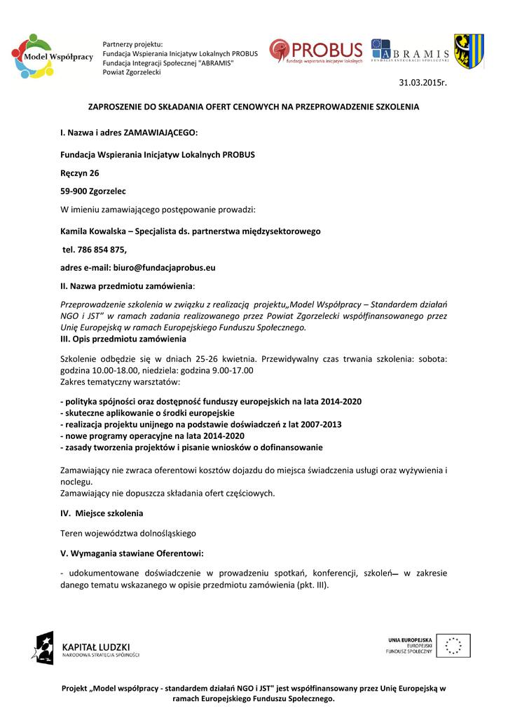 Partnerzy projektu: Fundacja Wspierania Inicjatyw Lokalnych PROBUS Fundacja Integracji Społecznej "ABRAMIS" Powiat Zgorzelecki 31.03.2015r. ZAPROSZENIE DO SKŁADANIA OFERT CENOWYCH NA PRZEPROWADZENIE SZKOLENIA I. Nazwa i adres ZAMAWIAJĄCEGO: Fundacja Wspierania Inicjatyw Lokalnych PROBUS Ręczyn 26 59-900 Zgorzelec W imieniu zamawiającego postępowanie prowadzi: Kamila Kowalska – Specjalista ds. partnerstwa międzysektorowego tel. 786 854 875, adres e-mail: [email protected] II. Nazwa przedmiotu zamówienia: Przeprowadzenie szkolenia w związku z realizacją projektu„Model Współpracy – Standardem działań NGO i JST” w ramach zadania realizowanego przez Powiat Zgorzelecki współfinansowanego przez Unię Europejską w ramach Europejskiego Funduszu Społecznego. III. Opis przedmiotu zamówienia Szkolenie odbędzie się w dniach 25-26 kwietnia. Przewidywalny czas trwania szkolenia: sobota: godzina 10.00-18.00, niedziela: godzina 9.00-17.00 Zakres tematyczny warsztatów: - polityka spójności oraz dostępność funduszy europejskich na lata 2014-2020 - skuteczne aplikowanie o środki europejskie - realizacja projektu unijnego na podstawie doświadczeń z lat 2007-2013 - nowe programy operacyjne na lata 2014-2020 - zasady tworzenia projektów i pisanie wniosków o dofinansowanie Zamawiający nie zwraca oferentowi kosztów dojazdu do miejsca świadczenia usługi oraz wyżywienia i noclegu. Zamawiający nie dopuszcza składania ofert częściowych. IV. Miejsce szkolenia Teren województwa dolnośląskiego V. Wymagania stawiane Oferentowi: - udokumentowane doświadczenie w prowadzeniu spotkań, konferencji, szkoleń danego tematu wskazanego w opisie przedmiotu zamówienia (pkt. III). w zakresie Projekt „Model współpracy - standardem działań NGO i JST" jest współfinansowany przez Unię Europejską w ramach Europejskiego Funduszu Społecznego. Partnerzy projektu: Fundacja Wspierania Inicjatyw Lokalnych PROBUS Fundacja Integracji Społecznej "ABRAMIS" Powiat Zgorzelecki VI. Potwierdzenie spełnienia powyższych warunków. Oferent jest zobowiązany do przedstawienia wraz z ofertą następujących dokumentów: - cv, - list motywacyjny, - kserokopie dokumentów potwierdzających posiadane kwalifikacje, - oświadczenie o wyrażeniu zgody na przetwarzanie danych osobowych. VII. Kryterium wyboru oferty: kwalifikacje – 50% , cena – 50% VIII. Termin płatności za wykonaną usługę: - zapłata nastąpi w terminie 14 dni od wystawieniu rachunku przez trenera. IX. Wymagane dokumenty należy złożyć: W formie elektronicznej na adres: [email protected],osobiście lub pocztą/kurierem na adres Zamawiającego do dnia 06.04.2015 r. do godziny 14:00. Liczy się data wpłynięcia dokumentów, a nie data nadania. Oferty złożone po terminie, nie zostaną rozpatrzone. W przypadku złożenia dokumentów w formie pisemnej lub osobiście należy opakować w kopertę i opisać „Oferta dotycząca przeprowadzenia konferencji ” w projekcie Model Współpracystandardem działań NGO i JST” i przesłać lub złożyć w siedzibie Zamawiającego: Fundacja Wspierania Inicjatyw Lokalnych PROBUS, ul. Mickiewicza 13, 59-900 Zgorzelec. Zleceniobiorca, który złoży najkorzystniejszą ofertę będzie zobowiązany do podpisania umowy. X. Informacje dodatkowe: Dokumenty aplikacyjne, w których nie zostanie podana cena brutto za godzinę szkolenia, nie będą rozpatrywane Zamawiający może unieważnić postępowanie na każdym jego etapie. W przypadku nie wybrania Wykonawcy, w szczególności w przypadku braku ofert, Zamawiający dopuszcza możliwość ponownego rozpoczęcia procedury zapytania ofertowego Niniejsze zapytanie nie jest zamówieniem i otrzymane od Oferentów oferty nie powodują żadnych zobowiązań wobec Stron. Projekt „Model współpracy - standardem działań NGO i JST" jest współfinansowany przez Unię Europejską w ramach Europejskiego Funduszu Społecznego.