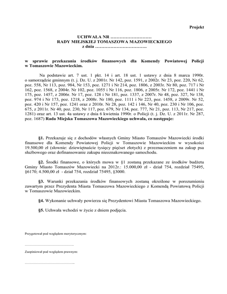 Projekt UCHWAŁA NR ……………………… RADY MIEJSKIEJ TOMASZOWA MAZOWIECKIEGO z dnia ……………………………. w sprawie przekazania środków finansowych dla Komendy Powiatowej Policji w Tomaszowie Mazowieckim. Na podstawie art. 7 ust. 1 pkt. 14 i art. 18 ust. 1 ustawy z dnia 8 marca 1990r. o samorządzie gminnym (t. j. Dz. U. z 2001r. Nr 142, poz. 1591, z 2002r. Nr 23, poz. 220, Nr 62, poz. 558, Nr 113, poz. 984, Nr 153, poz. 1271 i Nr 214, poz. 1806, z 2003r. Nr 80, poz. 717 i Nr 162, poz. 1568, z 2004r. Nr 102, poz. 1055 i Nr 116, poz. 1806, z 2005r. Nr 172, poz. 1441 i Nr 175, poz. 1457, z 2006r. Nr 17, poz. 128 i Nr 181, poz. 1337, z 2007r. Nr 48, poz. 327, Nr 138, poz. 974 i Nr 173, poz. 1218, z 2008r. Nr 180, poz. 1111 i Nr 223, poz. 1458, z 2009r. Nr 52, poz. 420 i Nr 157, poz. 1241 oraz z 2010r. Nr 28, poz. 142 i 146, Nr 40, poz. 230 i Nr 106, poz. 675, z 2011r. Nr 40, poz. 230, Nr 117, poz. 679, Nr 134, poz. 777, Nr 21, poz. 113, Nr 217, poz. 1281) oraz art. 13 ust. 4a ustawy z dnia 6 kwietnia 1990r. o Policji (t. j. Dz. U. z 2011r. Nr 287, poz. 1687) Rada Miejska Tomaszowa Mazowieckiego uchwala, co następuje: §1. Przekazuje się z dochodów własnych Gminy Miasto Tomaszów Mazowiecki środki finansowe dla Komendy Powiatowej Policji w Tomaszowie Mazowieckim w wysokości 19.500,00 zł (słownie: dziewiętnaście tysięcy pięćset złotych) z przeznaczeniem na zakup psa służbowego oraz dofinansowanie zakupu nieoznakowanego samochodu. §2. Środki finansowe, o których mowa w §1 zostaną przekazane ze środków budżetu Gminy Miasto Tomaszów Mazowiecki na 2012r.: 15.000,00 zł - dział 754, rozdział 75495, §6170; 4.500,00 zł - dział 754, rozdział 75495, §3000. §3. Warunki przekazania środków finansowych zostaną określone w porozumieniu zawartym przez Prezydenta Miasta Tomaszowa Mazowieckiego z Komendą Powiatową Policji w Tomaszowie Mazowieckim. §4. Wykonanie uchwały powierza się Prezydentowi Miasta Tomaszowa Mazowieckiego. §5. Uchwała wchodzi w życie z dniem podjęcia. Przygotował pod względem merytorycznym: ……………………………………. Zaopiniował pod względem prawnym: …………………………………….. UZASADNIENIE Przedmiotem przedstawionego projektu uchwały jest przekazanie środków finansowych w wysokości 19.500,00 zł z budżetu Gminy Miasto Tomaszów Mazowiecki dla Komendy Powiatowej Policji w Tomaszowie Mazowiecki na zakup psa służbowego oraz dofinansowanie zakupu samochodu nieoznakowanego. Zgodnie z przyjętą przez Radę Miejską Uchwałą Nr XLII/384/09 z dnia 24 czerwca 2009 roku w sprawie przyjęcia do realizacji „Programu Poprawy Bezpieczeństwa w Tomaszowie Mazowieckim – Bezpieczne Miasto” dla aktywnego przeciwdziałania przestępczości i poprawy porządku publicznego oraz bezpieczeństwa na terenie Miasta Tomaszowa Mazowieckiego postanowiono zakupić psa służbowego oraz dofinansować zakup samochodu nieoznakowanego. Szczegółowe warunki realizacji zadania określi porozumienie, które zostanie zawarte z Komendantem Powiatowym Policji w Tomaszowie Mazowieckim.