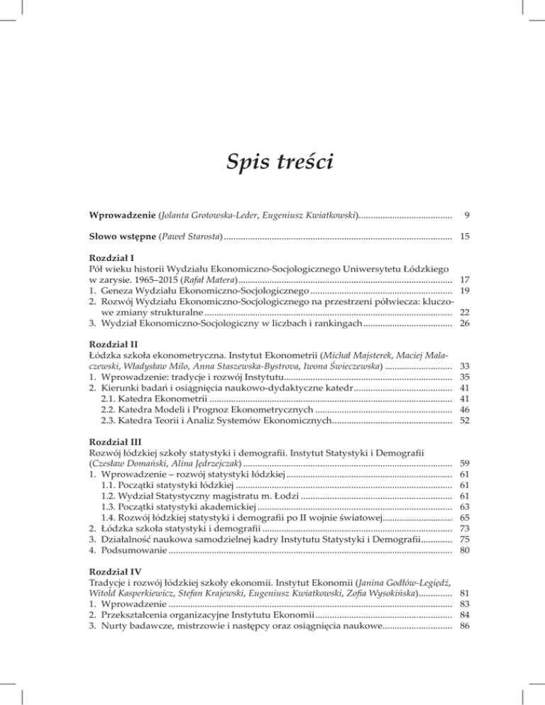 Spis treści Wprowadzenie (Jolanta Grotowska-Leder, Eugeniusz Kwiatkowski)....................................... 9 Słowo wstępne (Paweł Starosta)................................................................................................ 15 Rozdział I Pół wieku historii Wydziału Ekonomiczno-Socjologicznego Uniwersytetu Łódzkiego w zarysie. 1965–2015 (Rafał Matera).......................................................................................... 1. Geneza Wydziału Ekonomiczno-Socjologicznego............................................................ 2. Rozwój Wydziału Ekonomiczno-Socjologicznego na przestrzeni półwiecza: kluczowe zmiany strukturalne........................................................................................................ 3. Wydział Ekonomiczno-Socjologiczny w liczbach i rankingach...................................... 17 19 22 26 Rozdział II Łódzka szkoła ekonometryczna. Instytut Ekonometrii (Michał Majsterek, Maciej Mala czewski, Władysław Milo, Anna Staszewska-Bystrova, Iwona Świeczewska)............................. 1. Wprowadzenie: tradycje i rozwój Instytutu...................................................................... 2. Kierunki badań i osiągnięcia naukowo-dydaktyczne katedr.......................................... 2.1. Katedra Ekonometrii...................................................................................................... 2.2. Katedra Modeli i Prognoz Ekonometrycznych.......................................................... 2.3. Katedra Teorii i Analiz Systemów Ekonomicznych................................................... 33 35 41 41 46 52 Rozdział III Rozwój łódzkiej szkoły statystyki i demografii. Instytut Statystyki i Demografii (Czesław Domański, Alina Jędrzejczak)........................................................................................ 1. Wprowadzenie – rozwój statystyki łódzkiej...................................................................... 1.1. Początki statystyki łódzkiej........................................................................................... 1.2. Wydział Statystyczny magistratu m. Łodzi................................................................ 1.3. Początki statystyki akademickiej.................................................................................. 1.4. Rozwój łódzkiej statystyki i demografii po II wojnie światowej.............................. 2. Łódzka szkoła statystyki i demografii................................................................................ 3. Działalność naukowa samodzielnej kadry Instytutu Statystyki i Demografii.............. 4. Podsumowanie....................................................................................................................... 59 61 61 61 63 65 73 75 80 Rozdział IV Tradycje i rozwój łódzkiej szkoły ekonomii. Instytut Ekonomii (Janina Godłów-Legiędź, Witold Kasperkiewicz, Stefan Krajewski, Eugeniusz Kwiatkowski, Zofia Wysokińska)............... 1. Wprowadzenie....................................................................................................................... 2. Przekształcenia organizacyjne Instytutu Ekonomii.......................................................... 3. Nurty badawcze, mistrzowie i następcy oraz osiągnięcia naukowe.............................. 81 83 84 86 Spis treści 3.1. Początki Instytutu i jego rozwój. Kluczowa rola profesora Jana Mujżela.............. 87 3.2. Badania w zakresie funkcjonowania kapitalizmu i polskiej myśli ekonomicznej. Wiodąca rola profesora Janusza Górskiego................................................................ 96 3.3. Badania w zakresie wzrostu i rozwoju gospodarczego............................................ 105 3.4. Badania nad integracją europejską.............................................................................. 112 3.5. Badania w zakresie historii gospodarczej i historii myśli ekonomicznej............... 122 4. Wkład do dyscypliny............................................................................................................ 132 6 Rozdział V Wkład łódzkiej socjologii do wiedzy o społeczeństwie i metodologii badań społecznych. Instytut Socjologii (Wielisława Warzywoda-Kruszyńska).............................................................. 135 1. Wprowadzenie....................................................................................................................... 137 1.1. Krótka historia socjologii na Uniwersytecie Łódzkim.............................................. 137 1.2. Przekształcenia struktury organizacyjnej socjologii na Wydziale Ekonomiczno‑Socjologicznym.............................................................................................................. 141 2. Społeczne skutki zmian gospodarczych i politycznych w działalności badawczej łódzkich socjologów (1965–2015)......................................................................................... 143 2.1. Katedra Socjologii Przemysłu . .................................................................................... 144 2.2. Katedra Socjologii Zawodu i Katedra Socjologii Polityki i Moralności.................. 146 2.3. Katedra Socjologii Edukacji ......................................................................................... 150 2.4. Katedra Socjologii Organizacji i Zarządzania............................................................ 153 2.5. Katedra Socjologii Wsi i Miasta.................................................................................... 160 2.6. Zakład Socjologii Płci i Ruchów Społecznych............................................................ 164 2.7. Katedra Socjologii Ogólnej............................................................................................ 167 2.8. Katedra Socjologii Stosowanej i Pracy Socjalnej.................