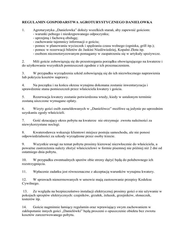 REGULAMIN GOSPODARSTWA AGROTURYSTYCZNEGO DANIELOWKA 1. Agroturystyka „Danielowka” dołoży wszelkich starań, aby zapewnić gościom: - warunki pełnego i nieskrępowanego odpoczynku; - uprzejmą i fachową obsługę; - zachowanie tajemnicy informacji o gościu; - pomoc w planowaniu wycieczek i spędzaniu czasu wolnego (ogniska, grill itp.); - pomoc w rezerwacji biletów do Jaskini Niedźwiedziej, Kopalni Złota itp. - osobom niezmotoryzowanym pomagamy w zaopatrzeniu się w artykuły spożywcze. 2. Mili goście zobowiązują się do przestrzegania porządku obowiązującego na kwaterze i do użytkowania wszystkich pomieszczeń zgodnie z ich przeznaczeniem. 3. W przypadku wyrządzenia szkód zobowiązują się do ich niezwłocznego naprawienia lub pokrycia kosztów naprawy. 4. Na początku i na końcu okresu wynajmu dokonana zostanie inwentaryzacja i sprawdzenie stanu pomieszczeń przez właściciela kwatery i gościa. 5. Rezerwacja kwatery zostanie potwierdzona wtedy, kiedy w ustalonym terminie zostaną uiszczone wymagane opłaty. 6. Wizyty gości osób zameldowanych w „Danielówce” możliwe są jedynie po uprzednim uzyskaniu zgody właścicieli. 7. Gość skracający okres pobytu na kwaterze nie otrzymuje zwrotu należności za niewykorzystane noclegi. 8. Kwaterodawca wskazuje klientowi miejsce postoju samochodu, ale nie ponosi odpowiedzialności za szkody wyrządzone przez osoby trzecie. 9. Wszystkie uwagi na temat pobytu prosimy kierować niezwłocznie do właściciela, a poważne zastrzeżenia należy złożyć właścicielowi w formie pisemnej nie później niż 2 dni od ostatniego dnia pobytu. 10. W przypadku ewentualnych sporów obie strony dążyć będą do polubownego ich rozstrzygnięcia. 11. Wpłacenie zadatku jest równoznaczne z akceptacją warunków wynajmu kwatery. 12. W sprawach nienormowanych w umowie mają zastosowanie przepisy Kodeksu Cywilnego. 13. Ze względu na bezpieczeństwo instalacji elektrycznej prosimy gości o nie używanie w pokojach sprzętów elektrycznych: czajników, grzałek, żelazek, grzejników, słoneczek, tosterów itp. 14. Goście nagminnie łamiący regulamin oraz wprawiający swym zachowaniem w zakłopotanie innych gości „Danielówki” będą proszeni o opuszczenie obiektu bez zwrotu kosztów zarezerwowanego pobytu.