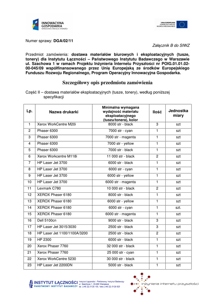 Numer sprawy: DGA/02/11 Załącznik B do SIWZ Przedmiot zamówienia: dostawa materiałów biurowych i eksploatacyjnych (tusze, tonery) dla Instytutu Łączności – Państwowego Instytutu Badawczego w Warszawie ul. Szachowa 1 w ramach Projektu Inżynieria Internetu Przyszłości nr POIG.01.01.0200-045/09 współfinansowanego przez Unię Europejską ze środków Europejskiego Funduszu Rozwoju Regionalnego, Program Operacyjny Innowacyjna Gospodarka. Szczegółowy opis przedmiotu zamówienia Część II – dostawa materiałów eksploatacyjnych (tusze, tonery), według poniższej specyfikacji Lp. Nazwa drukarki Minimalna wymagana wydajność materiału eksploatacyjnego (tuszu/tonera), kolor 8000 str - black Ilość Jednostka miary 3 szt 1 Xerox WorkCentre M20i 2 Phaser 6300 7000 str - cyan 1 szt 3 Phaser 6300 7000 str - magenta 1 szt 4 Phaser 6300 7000 str - yellow 1 szt 5 Phaser 6300 7000 str - black 1 szt 6 Xerox Workcentre M118i 11 000 str - black 2 szt 7 HP Laser Jet 3700 6000 str - black 1 szt 8 HP Laser Jet 3700 6000 str - cyan 1 szt 9 HP Laser Jet 3700 6000 str - yellow 1 szt 10 HP Laser Jet 3700 6000 str - magenta 1 szt 11 Lexmark C780 10 000 str - black 2 szt 12 XEROX Phaser 6180 8000 str - black 1 szt 13 XEROX Phaser 6180 6000 str - yellow 1 szt 14 XEROX Phaser 6180 6000 str - cyan 1 szt. 15 XEROX Phaser 6180 6000 str - magenta 1 szt 16 Dell 5100cn 9000 str - black 3 szt 17 HP Laser Jet 3015/3030 2500 str - black 3 szt 18 HP Laser Jet 1100/1100A/3200 2500 str - black 2 szt 19 HP 2300 6000 str - black 1 szt 20 Xerox Phaser 7760 32 000 str - black 1 szt 21 Xerox Phaser 7760 25 000 str - cyan 1 szt 22 Xerox WorkCentre 5230 30 000 str - black 1 szt 23 HP Laser Jet 2200DN 5000 str - black 1 szt 24 Canon iP4200 1 szt Canon iP4200 13ml/400 str - yellow 13ml/400 str - magenta 25 1 szt 26 Canon iP4200 13ml/400 str - cyan 1 szt 27 Canon iP4200 13ml/400 str - black 1 szt 28 Canon iP4200 13ml/400 str – black pigment 1 szt