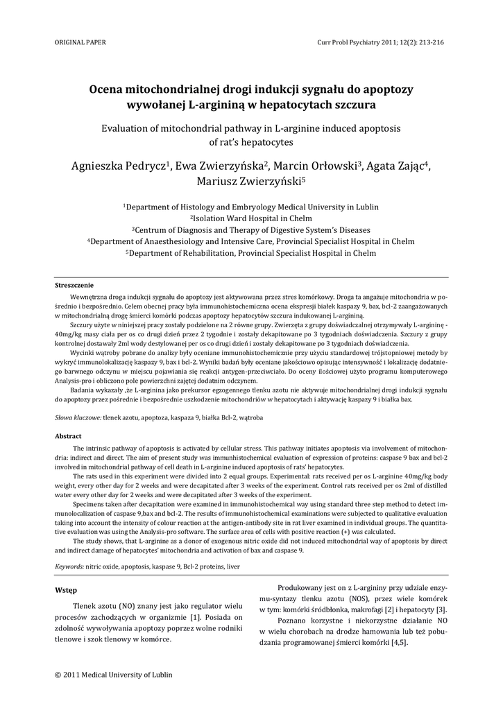 ORIGINAL PAPER Curr Probl Psychiatry 2011; 12(2): 213-216 Ocena mitochondrialnej drogi indukcji sygnału do apoptozy wywołanej L-argininą w hepatocytach szczura Evaluation of mitochondrial pathway in L-arginine induced apoptosis of rat’s hepatocytes Agnieszka Pedrycz1, Ewa Zwierzyńska2, Marcin Orłowski3, Agata Zając4, Mariusz Zwierzyński5 1Department of Histology and Embryology Medical University in Lublin 2Isolation Ward Hospital in Chelm 3Centrum of Diagnosis and Therapy of Digestive System’s Diseases 4Department of Anaesthesiology and Intensive Care, Provincial Specialist Hospital in Chelm 5Department of Rehabilitation, Provincial Specialist Hospital in Chelm Streszczenie Wewnętrzna droga indukcji sygnału do apoptozy jest aktywowana przez stres komórkowy. Droga ta angażuje mitochondria w pośrednio i bezpośrednio. Celem obecnej pracy była immunohistochemiczna ocena ekspresji białek kaspazy 9, bax, bcl-2 zaangażowanych w mitochondrialną drogę śmierci komórki podczas apoptozy hepatocytów szczura indukowanej L-argininą. Szczury użyte w niniejszej pracy zostały podzielone na 2 równe grupy. Zwierzęta z grupy doświadczalnej otrzymywały L-argininę 40mg/kg masy ciała per os co drugi dzień przez 2 tygodnie i zostały dekapitowane po 3 tygodniach doświadczenia. Szczury z grupy kontrolnej dostawały 2ml wody destylowanej per os co drugi dzień i zostały dekapitowane po 3 tygodniach doświadczenia. Wycinki wątroby pobrane do analizy były oceniane immunohistochemicznie przy użyciu standardowej trójstopniowej metody by wykryć immunolokalizację kaspazy 9, bax i bcl-2. Wyniki badań były oceniane jakościowo opisując intensywność i lokalizację dodatniego barwnego odczynu w miejscu pojawiania się reakcji antygen-przeciwciało. Do oceny ilościowej użyto programu komputerowego Analysis-pro i obliczono pole powierzchni zajętej dodatnim odczynem. Badania wykazały ,że L-arginina jako prekursor egzogennego tlenku azotu nie aktywuje mitochondrialnej drogi indukcji sygnału do apoptozy przez pośrednie i bezpośrednie uszkodzenie mitochondriów w hepatocytach i aktywację kaspazy 9 i białka bax. Słowa kluczowe: tlenek azotu, apoptoza, kaspaza 9, białka Bcl-2, wątroba Abstract The intrinsic pathway of apoptosis is activated by cellular stress. This pathway initiates apoptosis via involvement of mitochondria: indirect and direct. The aim of present study was immunhistochemical evaluation of expression of proteins: caspase 9 bax and bcl-2 involved in mitochondrial pathway of cell death in L-arginine induced apoptosis of rats’ hepatocytes. The rats used in this experiment were divided into 2 equal groups. Experimental: rats received per os L-arginine 40mg/kg body weight, every other day for 2 weeks and were decapitated after 3 weeks of the experiment. Control rats received per os 2ml of distilled water every other day for 2 weeks and were decapitated after 3 weeks of the experiment. Specimens taken after decapitation were examined in immunohistochemical way using standard three step method to detect immunolocalization of caspase 9,bax and bcl-2. The results of immunohistochemical examinations were subjected to qualitative evaluation taking into account the intensity of colour reaction at the antigen-antibody site in rat liver examined in individual groups. The quantitative evaluation was using the Analysis-pro software. The surface area of cells with positive reaction (+) was calculated. The study shows, that L-arginine as a donor of exogenous nitric oxide did not induced mitochondrial way of apoptosis by direct and indirect damage of hepatocytes’ mitochondria and activation of bax and caspase 9. Keywords: nitric oxide, apoptosis, kaspase 9, Bcl-2 proteins, liver Wstęp Tlenek azotu (NO) znany jest jako regulator wielu procesów zachodzących w organizmie [1]. Posiada on zdolność wywoływania apoptozy poprzez wolne rodniki tlenowe i szok tlenowy w komórce. © 2011 Medical University of Lublin Produkowany jest on z L-argininy przy udziale enzymu-syntazy tlenku azotu (NOS), przez wiele komórek w tym: komórki śródbłonka, makrofagi [2] i hepatocyty [3]. Poznano korzystne i niekorzystne działanie NO w wielu chorobach na drodze hamowania lub też pobudzania programowanej śmierci komórki [4,5]. 214 A. Pedrycz, E. Zwierzyńska, M. Orłowski, A. Zając, M. Zwierzyński Zarówno nadprodukcja jaki zmniejszona produkcja NO są przyczyną licznych chorób. Istnieje możliwość regulowania poziomu NO w organizmie poprzez podawanie egzogennego NO. Opisane zostały dwa szlaki wiodące do apoptozy komórki [6]. Droga zewnętrzna indukowana jest sygnałem z zewnątrz po połączeniu ligandów z błonowymi receptorami śmierci. W drodze wewnętrznej natomiast zaangażowane są mitochondria lub siateczka śróplazmatyczna. Pobudza ją stres komórkowy [7], który może wystąpić podczas ekspozycji komórki na promieniowanie, środki chemiczne, infekcję wirusową. Może również być konsekwencją uszkodzenia czynnika wzrostu lub stresu tlenowego. Droga wewnętrzna może zaangażować mitochondria pośrednio i bezpośrednio: W zaangażowaniu pośrednim uszkodzenie DNA prowadzi do nagromadzenia się w komórce białka p-53 i zahamowania cyklu komórkowego. Białko p-53 stymuluje komórkę do produkcji białka BAX. Białko BAX ma zdolność otwierania kanałów w mitochondriach, z których uwalnia się cytochrom C. Cytochrom c wraz z białkiem Apaf 1 tworzą kompleks aktywujący prokaspazę 9 i aktywujący tym samym kaskadę kaspaz. Bezpośrednie uszkodzenie mitochondriów również uwalnia do cytoplazmy cytochrom c, który z apaf1 i prokaspazą 9 tworzą apoptosom aktywując kaspazę 9 i rozpoczynając kaskadę Kaspar. Wpływ NO na śmieć komórki nadal nie jest do końca poznany, W zależności od dawki może on chronić komórkę przed śmiercią lub wręcz tę śmierć indukować [8]. Działa on również zależnie od typu komórek i narządów. W obecnej p