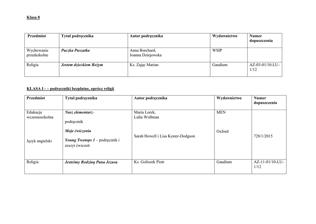 Klasa 0 Przedmiot Tytuł podręcznika Autor podręcznika Wydawnictwo Wychowanie przedszkolne Paczka Puszatka Anna Borchard, Joanna Dziejowska WSIP Religia Jestem dzieckiem Bożym Ks. Zając Marian Gaudium Numer dopuszczenia AZ-03-01/10-LU1/12 KLASA I - – podręczniki bezpłatne, oprócz religii Przedmiot Tytuł podręcznika Autor podręcznika Wydawnictwo Edukacja wczesnoszkolna Nasz elementarz– Maria Lorek, Lidia Wollman MEN podręcznik Moje ćwiczenia Język angielski Young Treetops 1 – podręcznik i zeszyt ćwiczeń Religia Jesteśmy Rodziną Pana Jezusa Numer dopuszczenia Oxford Sarah Howell i Lisa Kester-Dodgson Ks. Goliszek Piotr 728/1/2015 Gaudium AZ-11-01/10-LU1/12 KLASA II - – podręczniki bezpłatne, oprócz religii Przedmiot Tytuł podręcznika Autor podręcznika Wydawnictwo Edukacja wczesnoszkolna Nasza szkoła – podręcznik Ćwiczenia z pomysłem – zeszyt ćwiczeń Maria Lorek, Monika Zatorska E. Dulemba, J. Faliszewska, G. Lech, A. Opala, I. Parlicka, A. Ziewiecka MEN Young Treetops 2 – podręcznik i zeszyt ćwiczeń Kochamy Pana Jezusa Sarah Howell i Lisa Kester-Dodgson Oxford Ks. Goliszek Piotr Gaudium AZ-12-01/10-LU3/13 Przedmiot Tytuł podręcznika Autor podręcznika Wydawnictwo Numer dopuszczenia Edukacja wczesnoszkolna Nasza szkoła– podręcznik Ćwiczenia z pomysłem – zeszyt ćwiczeń Maria Lorek, Monika Zatorska E. Dulemba, J. Faliszewska, G. Lech, A. Opala, I. Parlicka, A. Ziewiecka MEN Język angielski Young Treetops 3 - podręcznik i zeszyt ćwiczeń S.M. Howell, L. Kester-Dodgson Oxford 728/3/2016 Religia Przyjmujemy Pana Jezusa ks. Piotr Goliszek Gaudium AZ-13-01/10-LU4/14 Numer dopuszczenia WSiP 728/2/2015 Język angielski Religia KLASA III WSIP KLASA IV – podręczniki bezpłatne, oprócz religii Przedmiot Tytuł podręcznika Autor podręcznika Wydawnictwo Język polski Słowa na start Podręcznik do języka polskiego dla klasy czwartej szkoły podstawowej. Część 1: Kształcenie literackie i kulturowe Część 2: Kształcenie językowe Marlena Derlukiewicz Danuta Chwastniewska, Agnieszka Gorzałczyńska-Mróz, Danuta Różek Nowa Era Przyroda Na tropach przyrody – podręcznik + zeszyt ćwiczeń Marcin Braun, Wojciech Grajkowski, Marek Więckowski Nowa Era 554/1/2012/2014 Język angielski Steps Forward 1-podręcznik + zeszyt ćwiczeń T. Falla, P. Davies, P. Shipton Oxford 741/1/2015 Historia Wczoraj i dziś Podręcznik + zeszyt ćwiczeń Grzegorz Wojciechowski Nowa Era 443/1/2012 Matematyka Matematyka z kluczem cz. I i II + ćwiczenia cz.I i II A. Braun, A. Mańkowska, M. Paszyńska Nowa Era 157/1/2012/z1/2014 157/1/2012/z2/2014 Plastyka Do dzieła-kl. 4 J. Lukas, K. Onak Nowa Era Muzyka I gra muzyka –podręcznik do muzyki kl.4-6 Jak to działa- podręcznik M. Gromek, G. Kilbach Nowa Era 326/1/2011/2015 589/1/2012 L. Łabecki, M. Łabecka Nowa Era 295/2010/2014 Lubię to! – podręcznik M. Kęska Nowa Era 729/1/2015 Jestem chrześcijaninem Ks. Janiga Waldemar Gaudium AZ-21-01/10-LU1/12 Zajęcia techniczne Zajęcia komputerowe Religia Numer dopuszczenia 338/1/2011/2015 338/2/2011/2015 KLASA V Przedmiot Tytuł podręcznika Autor podręcznika Wydawnictwo Język polski Słowa na start Podręcznik do języka polskiego dla klasy czwartej szkoły podstawowej. Część 1: Kształcenie literackie i kulturowe Część 2: Kształcenie językowe + zeszyt ćwiczeń Steps Forward 2-podręcznik + zeszyt ćwiczeń Marlena Derlukiewicz Danuta Chwastniewska, Agnieszka Gorzałczyńska-Mróz, Danuta Różek Nowa Era T. Falla, P. Davies, P. Shipton Oxford 741/2/2016 Przyroda Na tropach przyrody 5 Nowa Era 554/2/2013/2015 Matematyka Matematyka z kluczem cz. I i II Marcin Braun, Wojciech Grajkowski, Marek Więckowski A. Braun, A. Mańkowska, M. Paszyńska Nowa Era 157/2/2012/z1/2015 Język angielski Numer dopuszczenia 338/3/2013/2015 338/4/2013/2015 157/2/2012/z2/2015 Historia Plastyka Zajęcia techniczne Zajęcia komputerowe Muzyka Religia Wczoraj i dziś podręcznik + zeszyt ćwiczeń Do dzieła - podręcznik dla kl.4-6 Grzegorz Wojciechowski Nowa Era 443/2/2013 J. Lukas, K. Onak Nowa Era 326/2011 Jak to działa- podręcznik z ćwiczeniami kl.4-6 Lubię to! – podręcznik L. Łabecki, M. Łabecka Nowa Era 295/2010 M. Kęska 729/2/2016 I gra muzyka –podręcznik do muzyki kl.4-6 M. Gromek, G. Kilbach Nowa Era 589/1/2012 Wierzę w Boga Ks. Janiga Waldemar Gaudium AZ-22-01/10-LU2/13 KLASA VI Przedmiot Tytuł podręcznika Autor podręcznika Wydawnictwo Język polski Teraz polski- podręcznik do kształcenia literackiego, kulturowego i językowego dla kl.VI Steps in English 3-podręcznik Anna Klimowicz Nowa Era T. Falla, P. Davies, P. Shipton Oxford 302/3/2011 Ewa Gromek, Ewa Kłos, Wawrzyniec Kofta, Ewa Laskowska, Andrzej Melson H. Lewicka, M. Kowalczyk WSIP 530/3/2014 Matematyka Przyrodo, witaj!6-podręcznik + zeszyt ćwiczeń Matematyka wokół nas- podręcznik WSIP 275/3/2014/Z1 Historia Wczoraj i dziś Grzegorz Wojciechowski Nowa Era 443/3/2014 Język angielski Przyroda Numer dopuszczenia 538/3/2014 Podręcznik + 2 zeszyty ćwiczeń Muzyka I gra muzyka –podręcznik do muzyki kl.4-6 M. Gromek, G. Kilbach Nowa Era 589/1/2012 Plastyka Do dzieła - podręcznik dla kl.4-6 J. Lukas, K. Onak Nowa Era 326/2011 Zajęcia techniczne Jak to działa- podręcznik z ćwiczeniami kl.4-6 L. Łabecki, M. Łabecka Nowa Era 295/2010 Zajęcia komputerowe Lekcje z komputerem – podręcznik do zajęć komputerowych dla kl.6 W. Jochemczyk, I. Krajewska-Karnas, WSIP 453/3/2014 Religia Wierzę w Kościół – podręcznik + ćwiczenia ks. W. Janiga Gaudium AZ-23-01/10/LU2/14