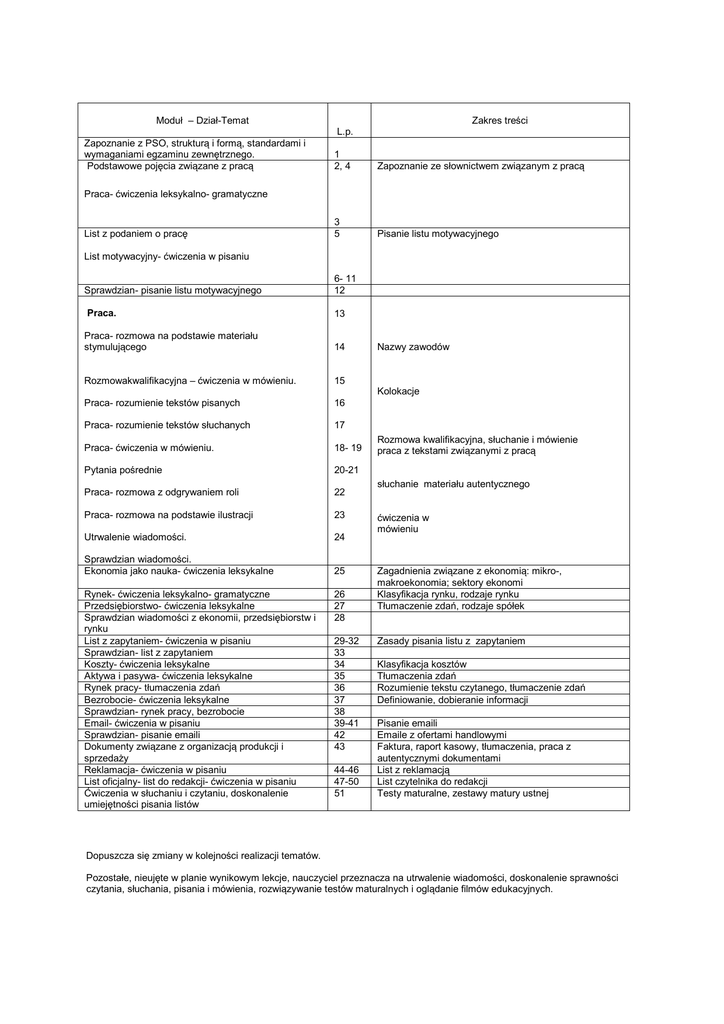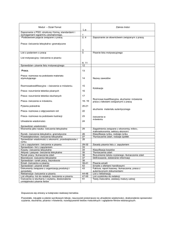 Moduł – Dział-Temat Zakres treści L.p. Zapoznanie z PSO, strukturą i formą, standardami i wymaganiami egzaminu zewnętrznego. Podstawowe pojęcia związane z pracą 1 2, 4 Zapoznanie ze słownictwem związanym z pracą 3 5 Pisanie listu motywacyjnego Praca- ćwiczenia leksykalno- gramatyczne List z podaniem o pracę List motywacyjny- ćwiczenia w pisaniu Sprawdzian- pisanie listu motywacyjnego 6- 11 12 Praca. 13 Praca- rozmowa na podstawie materiału stymulującego 14 Rozmowakwalifikacyjna – ćwiczenia w mówieniu. 15 Praca- rozumienie tekstów pisanych 16 Praca- rozumienie tekstów słuchanych 17 Praca- ćwiczenia w mówieniu. 18- 19 Pytania pośrednie 20-21 Praca- rozmowa z odgrywaniem roli 22 Praca- rozmowa na podstawie ilustracji 23 Utrwalenie wiadomości. 24 Sprawdzian wiadomości. Ekonomia jako nauka- ćwiczenia leksykalne 25 Nazwy zawodów Kolokacje Rynek- ćwiczenia leksykalno- gramatyczne Przedsiębiorstwo- ćwiczenia leksykalne Sprawdzian wiadomości z ekonomii, przedsiębiorstw i rynku List z zapytaniem- ćwiczenia w pisaniu Sprawdzian- list z zapytaniem Koszty- ćwiczenia leksykalne Aktywa i pasywa- ćwiczenia leksykalne Rynek pracy- tłumaczenia zdań Bezrobocie- ćwiczenia leksykalne Sprawdzian- rynek pracy, bezrobocie Email- ćwiczenia w pisaniu Sprawdzian- pisanie emaili Dokumenty związane z organizacją produkcji i sprzedaży Reklamacja- ćwiczenia w pisaniu List oficjalny- list do redakcji- ćwiczenia w pisaniu Ćwiczenia w słuchaniu i czytaniu, doskonalenie umiejętności pisania listów 26 27 28 29-32 33 34 35 36 37 38 39-41 42 43 44-46 47-50 51 Rozmowa kwalifikacyjna, słuchanie i mówienie praca z tekstami związanymi z pracą słuchanie materiału autentycznego ćwiczenia w mówieniu Zagadnienia związane z ekonomią: mikro-, makroekonomia; sektory ekonomi Klasyfikacja rynku, rodzaje rynku Tłumaczenie zdań, rodzaje spółek Zasady pisania listu z zapytaniem Klasyfikacja kosztów Tłumaczenia zdań Rozumienie tekstu czytanego, tłumaczenie zdań Definiowanie, dobieranie informacji Pisanie emaili Emaile z ofertami handlowymi Faktura, raport kasowy, tłumaczenia, praca z autentycznymi dokumentami List z reklamacją List czytelnika do redakcji Testy maturalne, zestawy matury ustnej Dopuszcza się zmiany w kolejności realizacji tematów. Pozostałe, nieujęte w planie wynikowym lekcje, nauczyciel przeznacza na utrwalenie wiadomości, doskonalenie sprawności czytania, słuchania, pisania i mówienia, rozwiązywanie testów maturalnych i oglądanie filmów edukacyjnych.