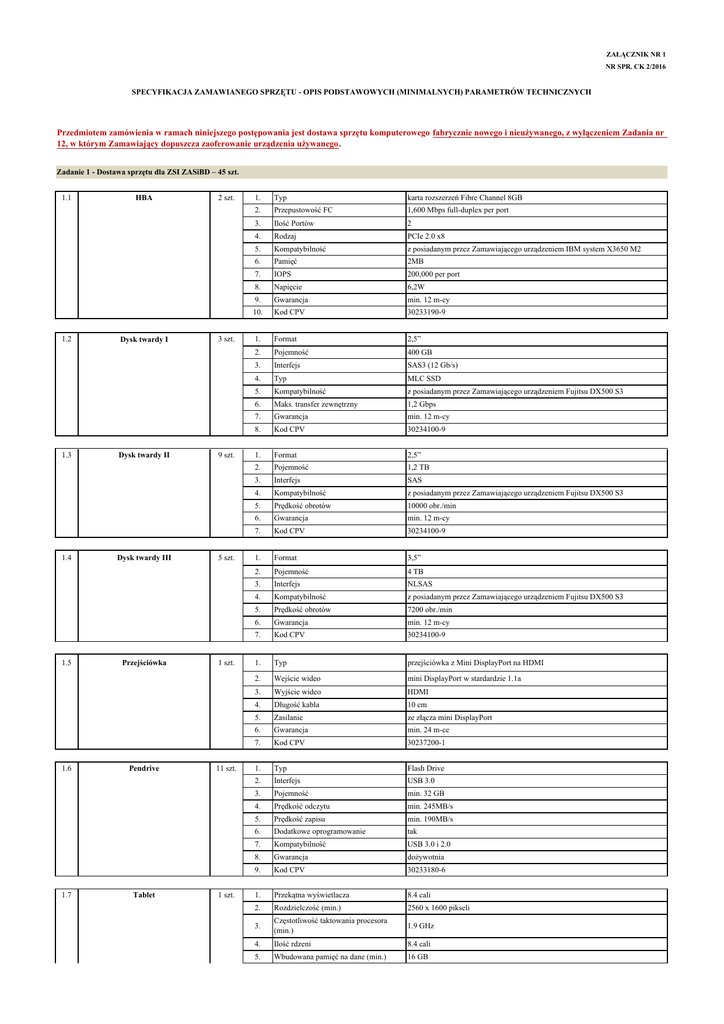 ZAŁĄCZNIK NR 1 NR SPR. CK 2/2016 SPECYFIKACJA ZAMAWIANEGO SPRZĘTU - OPIS PODSTAWOWYCH (MINIMALNYCH) PARAMETRÓW TECHNICZNYCH Przedmiotem zamówienia w ramach niniejszego postępowania jest dostawa sprzętu komputerowego fabrycznie nowego i nieużywanego, z wyłączeniem Zadania nr 12, w którym Zamawiający dopuszcza zaoferowanie urządzenia używanego. Zadanie 1 - Dostawa sprzętu dla ZSI ZASiBD – 45 szt. 1.1 1.2 1.3 1.4 1.5 1.6 1.7 HBA Dysk twardy I Dysk twardy II Dysk twardy III Przejściówka Pendrive Tablet 2 szt. 3 szt. 9 szt. 5 szt. 1 szt. 11 szt. 1 szt. 1. Typ karta rozszerzeń Fibre Channel 8GB 2. Przepustowość FC 1,600 Mbps full-duplex per port 2 3. Ilość Portów 4. Rodzaj PCIe 2.0 x8 5. Kompatybilność z posiadanym przez Zamawiającego urządzeniem IBM system X3650 M2 6. Pamięć 2MB 7. IOPS 200,000 per port 8. Napięcie 6,2W 9. Gwarancja min. 12 m-cy 10. Kod CPV 30233190-9 1. Format 2,5” 2. Pojemność 400 GB 3. Interfejs SAS3 (12 Gb/s) 4. Typ MLC SSD 5. Kompatybilność z posiadanym przez Zamawiającego urządzeniem Fujitsu DX500 S3 6. Maks. transfer zewnętrzny 1,2 Gbps 7. Gwarancja min. 12 m-cy 8. Kod CPV 30234100-9 1. Format 2,5” 2. Pojemność 1,2 TB 3. Interfejs SAS 4. Kompatybilność z posiadanym przez Zamawiającego urządzeniem Fujitsu DX500 S3 10000 obr./min 5. Prędkość obrotów 6. Gwarancja min. 12 m-cy 7. Kod CPV 30234100-9 1. Format 3,5” 2. Pojemność 4 TB 3. Interfejs NLSAS 4. Kompatybilność z posiadanym przez Zamawiającego urządzeniem Fujitsu DX500 S3 7200 obr./min 5. Prędkość obrotów 6. Gwarancja min. 12 m-cy 7. Kod CPV 30234100-9 1. Typ przejściówka z Mini DisplayPort na HDMI 2. Wejście wideo mini DisplayPort w stardardzie 1.1a 3. Wyjście wideo HDMI 4. Długość kabla 10 cm 5. Zasilanie ze złącza mini DisplayPort 6. Gwarancja min. 24 m-ce 7. Kod CPV 30237200-1 Flash Drive 1. Typ 2. Interfejs USB 3.0 3. Pojemność min. 32 GB 4. Prędkość odczytu min. 245MB/s 5. Prędkość zapisu min. 190MB/s 6. Dodatkowe oprogramowanie tak 7. Kompatybilność USB 3.0 i 2.0 8. Gwarancja dożywotnia 9. Kod CPV 30233180-6 1. Przekątna wyświetlacza 8.4 cali 2. Rozdzielczość (min.) 2560 x 1600 pikseli 3. Częstotliwość taktowania procesora (min.) 1.9 GHz 4. Ilość rdzeni 8.4 cali 5. Wbudowana pamięć na dane (min.) 16 GB 1.8 1.9 1.10 1.11 1.12 Adapter sieciowy Etui Mikrofon Słuchawki I Słuchawki II 2 szt. 2 szt. 1 szt. 1 szt. 3 szt. 6. Pamięć RAM 3 GB 7. Zewnętrzna pamięć do 128GB MicroSD 8. Interfejsy komunikacyjne WiFi 802.11a/b/g/n/AC 2.4G+5GHz, VHT80 MIMO 9. Bluetooth V4.0 10. Interfejsy Audio -Video stereo 3.5 mm 11. Wbudowany mikrofon tak 12. Wbudowane głośniki mono lub stereo 13. Pojemność baterii 4900 mAh 14. Czas pracy – transmisja (Wi-Fi) 10 godz. 15. Aparat fotograficzny z tyłu min. 8 Mpix 16. Aparat fotograficzny z przodu min. 2.1 Mpix 17. Lampka Błyskowa tak 18. Ładowanie przez USB tak 19. Kolor obudowy bronze 20. GPS tak 21. System Operacyjny Android lub równoważny do wskazanego 22. Gwarancja min. 12 m-cy 23. Kod CPV 30200000-1 1. Złącza 1x USB3.0 A męski, 3x USB3.0 A żeński 1x Gigabit LAN RJ45 2. Kompatybilność USB 3.0, wstecznie do USB2.0 3. Transfer danych do 5Gbps 4. Obsługa standardu IEEE 802.3 10/100/1000 Mbps, IEEE802.3az 5. Obsługiwane systemy operacyjne Windows 2000 /XP /Vista/7 /8 OSX 9.x lub nowszy 6. Gwarancja min. 12 m-cy 7. Kod CPV 30237110-3 1. Typ zapinane na suwak 2. Kompatybilność z posiadanym przez Zamawiającego urządzeniem Apple Macbook Pro A1278 3. Materiał tkanina odporna na wodę oraz ścieranie 4. Wyściółka z pianki w narożnikach aby chronić boki i krawędzie 5. Waga maks. 225 g 6. Gwarancja min. 12 m-cy 7. Kod CPV 30237270-2 1. Przeznaczenie komputer 2. Interfejs MiniJack 3.5 mm 2.5 m 3. Długość kabla 4. Inne funkcje przycisk wyciszenia 5. Kolor czarny 6. Konstrukcja podstawa 7. Wyposażenie statyw 8. Gwarancja min. 12 m-cy 9. Kod CPV 30237200-1 nauszne zamnknięte 1. Konstrukcja 2. Średnica membrany 40 mm 3. Pasmo przenoszenia słuchawek 10 – 30000 Hz 4. Impedancja 32 Ohm 5. Czułość 103 dB 6. Łączność przewodowa 7. Złącze 3.5 mm + przejściówka 6.3 mm 8. Długość kabla 1,2 m 9. Waga max. 210 g 10. Kolor czarne 11. Gwarancja min. 24 m-cy 12. Kod CPV 30237200-1 nauszne 1. Konstrukcja 2. Średnica membrany 40 mm 3. Pasmo przenoszenia słuchawek 80 – 20000 Hz 4. Impedancja 32 Ohm 5. Czułość 90 dB 6. Łączność bezprzewodowa – Bluetooth 7. Zasięg 10 m 8. Zasilanie wbudowany akumulator 9. Maksymalny czas pracy 14 godz. 10. Waga max. 130 g 11. Kolor żółty 12. Gwarancja min. 24 m-cy 13. Kod CPV 30237200-1 1.13 1.14 1.15 Słuchawki III Hub USB Rzutnik 2 szt. 1 szt. 1 szt. 1. Konstrukcja otwarte 2. Pasmo przenoszenia słuchawek 15 – 27000 Hz 3. Impedencja 32 Ohm 4. Czułość 114 dB 5. Łączność przewodowa 6. Długość przewodu 1,2 m 7. Złącze 1 x mini-jack 3,5 mm 8. Typ głośnika dynamiczny magnes neodymowy 9. Możliwość złożenia tak 10. Kolor czarne 11. Gwarancja min. 24 m-cy 12. Kod CPV 30237200-1 1. Typ koncentrator 2. Standard USB 3.0 3. Wejście 1x USB 3.0 4. Wyjście 4x USB 3.0 | 1 x USB z funkcją ładowania 5. Wymiary max. 86 x 86 x 14 mm 6. Gwarancja min. 24 m-cy 7. Kod CPV 30237132-3 min. 1920x1080 1. Rozdzielczość 2. Technologia 3xLCD 3. Żywotność lampy min. 4000h 4. Jasność min. 2200 ANSI lumenów 5. Wejścia 6. Inne funkcje min. 2x HDMI, 1x VGA, 1xVideo (CV) wbudowany odbiornik Miracast/WiDi dla systemów Android i Windows 8.1+ obsługa bezprzewodowego przesyłania obrazu z urządzeń z systemami operacyjnymi MacOS i IOS 7. Gwarancja min. 24 m-cy 8. Kod CPV 38652100-1 1. Typ urządzenia dysk twardy przeznaczony do urządzeń typu NAS 2. Pojemność 3000 GB 3. Pamięć cache 64 MB 4. Złącze/interfejs SATA 600 / Serial ATA III 5. Prędkość obrotowa IntelliPower obsługa głośników Bluetooh Audio (A2DP) Zadanie 2 - Dostawa dysków dla ZMSK ZT – 10 szt. 2.1 Dysk twardy 10 szt. 6. Wewn. szybkość prze