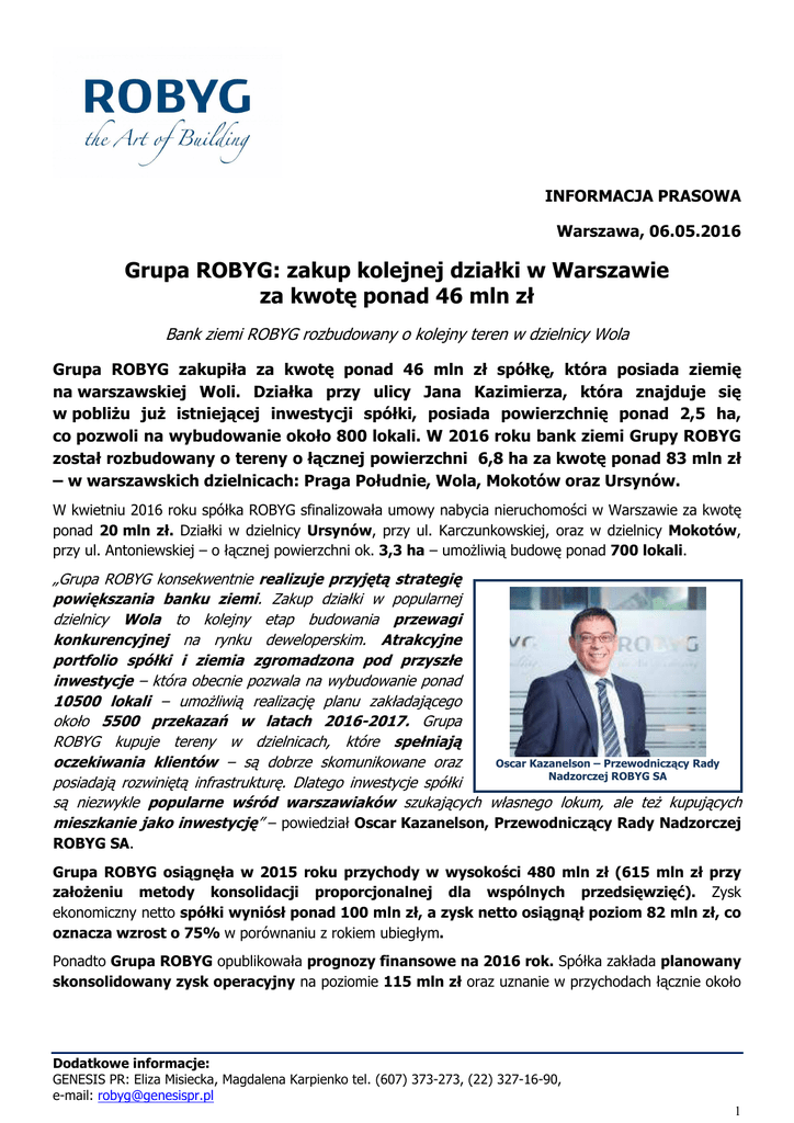 INFORMACJA PRASOWA Warszawa, 06.05.2016 Grupa ROBYG: zakup kolejnej działki w Warszawie za kwotę ponad 46 mln zł Bank ziemi ROBYG rozbudowany o kolejny teren w dzielnicy Wola Grupa ROBYG zakupiła za kwotę ponad 46 mln zł spółkę, która posiada ziemię na warszawskiej Woli. Działka przy ulicy Jana Kazimierza, która znajduje się w pobliżu już istniejącej inwestycji spółki, posiada powierzchnię ponad 2,5 ha, co pozwoli na wybudowanie około 800 lokali. W 2016 roku bank ziemi Grupy ROBYG został rozbudowany o tereny o łącznej powierzchni 6,8 ha za kwotę ponad 83 mln zł – w warszawskich dzielnicach: Praga Południe, Wola, Mokotów oraz Ursynów. W kwietniu 2016 roku spółka ROBYG sfinalizowała umowy nabycia nieruchomości w Warszawie za kwotę ponad 20 mln zł. Działki w dzielnicy Ursynów, przy ul. Karczunkowskiej, oraz w dzielnicy Mokotów, przy ul. Antoniewskiej – o łącznej powierzchni ok. 3,3 ha – umożliwią budowę ponad 700 lokali. „Grupa ROBYG konsekwentnie realizuje przyjętą strategię powiększania banku ziemi. Zakup działki w popularnej dzielnicy Wola to kolejny etap budowania przewagi konkurencyjnej na rynku deweloperskim. Atrakcyjne portfolio spółki i ziemia zgromadzona pod przyszłe inwestycje – która obecnie pozwala na wybudowanie ponad 10500 lokali – umożliwią realizację planu zakładającego około 5500 przekazań w latach 2016-2017. Grupa ROBYG kupuje tereny w dzielnicach, które spełniają oczekiwania klientów – są dobrze skomunikowane oraz Oscar Kazanelson – Przewodniczący Rady Nadzorczej ROBYG SA posiadają rozwiniętą infrastrukturę. Dlatego inwestycje spółki są niezwykle popularne wśród warszawiaków szukających własnego lokum, ale też kupujących mieszkanie jako inwestycję” – powiedział Oscar Kazanelson, Przewodniczący Rady Nadzorczej ROBYG SA. Grupa ROBYG osiągnęła w 2015 roku przychody w wysokości 480 mln zł (615 mln zł przy założeniu metody konsolidacji proporcjonalnej dla wspólnych przedsięwzięć). Zysk ekonomiczny netto spółki wyniósł ponad 100 mln zł, a zysk netto osiągnął poziom 82 mln zł, co oznacza wzrost o 75% w porównaniu z rokiem ubiegłym. Ponadto Grupa ROBYG opublikowała prognozy finansowe na 2016 rok. Spółka zakłada planowany skonsolidowany zysk operacyjny na poziomie 115 mln zł oraz uznanie w przychodach łącznie około Dodatkowe informacje: GENESIS PR: Eliza Misiecka, Magdalena Karpienko tel. (607) 373-273, (22) 327-16-90, e-mail: [email protected] 1 2800 lokali, z czego 1600 mieszkań z projektów realizowanych przez spółki zależne Grupy ROBYG i około 1200 w ramach projektów joint venture. ROBYG SA planuje przeznaczyć ponad 52 mln zł na wypłatę dywidendy z zysku za 2015 rok – czyli 0,20 zł na akcję co zostało pozytywnie zaopiniowane przez Radę Nadzorczą Grupy. Oznacza to, że stopa dywidendy wynosi obecnie ponad 6% wartości rynkowej akcji ROBYG SA. ROBYG SA – w rezultacie rewizji rocznej portfeli indeksów – weszła w skład indeksu giełdowego mWIG40 po sesji giełdowej w dniu 18 marca 2016. Ponadto Grupa ROBYG została włączona do indeksu spółek dywidendowych WIGdiv. W 2015 i 2016 roku Grupa ROBYG do tej pory nabyła lub podpisała umowy przedwstępne nabycia w Warszawie i Gdańsku terenów inwestycyjnych za łączną kwotę ponad 317 mln zł. W tym w 2016 nabyła: • • • • w warszawskiej dzielnicy Wola, działkę o łącznej powierzchni 2,5 ha, która umożliwi wybudowanie około 800 lokali; w warszawskiej dzielnicy Mokotów, 2 działki o łącznej powierzchni 1,8 ha, które umożliwią budowę ponad 300 mieszkań; na warszawskim Ursynowie, działkę o powierzchni 1,5 ha, która pozwoli na wybudowanie ok. 400 lokali mieszkalnych; w warszawskiej dzielnicy Praga Południe, działkę o łącznej powierzchni ponad 1 ha, która pozwoli na wybudowanie około 260 mieszkań; Od debiutu na Giełdzie Papierów Wartościowych w Warszawie w 2010 roku ROBYG SA regularnie dzieli się zyskiem z akcjonariuszami. Dotychczas spółka wypłaciła w ramach dywidendy: • ze skonsolidowanego zysku netto za 2014 rok w wysokości 0,11 zł na akcję, co stanowiło około 62,2% skonsolidowanego zysku netto • ze skonsolidowanego zysku netto za 2013 rok w wysokości 0,08 zł na akcję, co stanowiło około 72,9% skonsolidowanego zysku netto • z sumy skonsolidowanych zysków netto z lat 2010-2012 w wysokości łącznie 0,27 zł na akcję, co stanowiło około 78,4% sumy skonsolidowanych zysków netto w tym okresie Więcej informacji www.robyg.pl Dodatkowe informacje: GENESIS PR: Eliza Misiecka, Magdalena Karpienko tel. (607) 373-273, (22) 327-16-90, e-mail: [email protected] 2