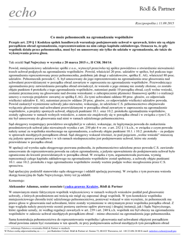echo Rzeczpospolita z 11.09.2015 Co może pełnomocnik na zgromadzeniu wspólników Przepis art. 239 § 1 Kodeksu spółek handlowych warunkuje podejmowanie uchwał w sprawach, które nie są objęte porządkiem obrad zgromadzenia, reprezentowaniem na nim całego kapitału zakładowego. Oznacza to, że gdy wspólnik działa przez pełnomocnika, musi być on umocowany nie tylko do udziału w zgromadzeniu, ale także do wykonywania prawa głosu. Tak orzekł Sąd Najwyższy w wyroku z 20 marca 2015 r., II CSK 384/14. Powód, mniejszościowy udziałowiec spółki z o.o., wytoczył przeciwko tej spółce powództwo o stwierdzenie nieważności trzech uchwał podjętych na zgromadzeniu wspólników. Powód, właściciel 20 proc. udziałów w spółce, był podczas tego zgromadzenia reprezentowany przez pełnomocnika, podobnie jak drugi z udziałowców, spółka E. AG, właściciel 80 proc. udziałów. Pełnomocnik powoda C. S. był umocowany do jego reprezentowania na zgromadzeniu oraz głosowania nad uchwałami przewidzianymi w porządku obrad zawartym w zaproszeniu na zgromadzenie wspólników. Przewodniczący zgromadzenia przy zatwierdzaniu porządku obrad oświadczył, że wnioski o jego zmianę nie zostały złożone, co zostało objęte punktem 4 protokołu z tego zgromadzenia wspólników, natomiast punkt 10 porządku obrad, czyli wolne wnioski, zostanie przeznaczony na głosowanie nad dwoma wnioskami: o zabezpieczenie płynności finansowej spółki i o realizacji umowy o rozwoju projektów zawartej ze spółką E.AG. Za tymi uchwałami oddano 80 proc. głosów, co odpowiada wielkości udziałów E. AG, natomiast przeciw oddano 20 proc. głosów, co odpowiadało wielkości udziałów powoda. Powód zaskarżył wymienione uchwały jako nieważne, wskazując, że udzielone C.S. pełnomocnictwo obejmowało wyłącznie głosowanie nad uchwałami przewidzianymi w porządku obrad zawartym w zaproszeniu na zgromadzenie wspólników, a projekty spornych uchwał, objętych punktami 10.1. oraz 10.2. protokołu zgromadzenia wspólników, zostały zgłoszone w ramach wolnych wniosków, a zatem nie znajdowały się w porządku obrad i w związku z tym C.S. nie był umocowany do głosowania nad nimi w ramach udzielonego pełnomocnictwa. Sąd okręgowy rozpatrujący powództwo uwzględnił je w całości, wskazując, że legitymacja powoda do zaskarżenia przedmiotowych uchwał jako nieważnych wynika z art. 250 pkt 4 w zw. z art. 252 § 1 k.s.h., w związku z czym powoda należy uznać za wspólnika nieobecnego na zgromadzeniu, a uchwały objęte punktami 10.1. i 10.2. protokołu – za podjęte w sprawach nieobjętych porządkiem obrad. Sąd okręgowy wskazał również, że pod pojęciem „wolne wnioski" mieszczą się jedynie sprawy porządkowe i w ich ramach niedopuszczalne jest podejmowanie uchwał, które nie zostały przewidziane w porządku obrad. W apelacji od wyroku sądu okręgowego pozwana podnosiła, że pełnomocnictwo udzielone przez powoda C.S. zawierało umocowanie do reprezentowania powoda na całym zgromadzeniu, a jedynie upoważnienie do podejmowania uchwał było ograniczone do kwestii przewidzianych w porządku obrad. W związku z tym, argumentowała pozwana, wymóg reprezentacji całego kapitału zakładowego na zgromadzeniu wspólników został spełniony, a uchwały objęte punktami 10.1. oraz 10.2. protokołu z tego zgromadzenia wspólników zostały ważnie podjęte wobec niezgłoszenia przez C.S. sprzeciwu. Sąd apelacyjny podzielił stanowisko sądu okręgowego i oddalił apelację pozwanej. W związku z tym pozwana wniosła skargę kasacyjną do Sądu Najwyższego, który też ją oddalił. Komentuje: Aleksander Adamus, senior associate i radca prawny Kraków, Rödl & Partner W omawianym stanie faktycznym wspólnik większościowy w ramach wolnych wniosków poddał pod głosowanie uchwały, z których przedmiotem ani treścią nie mógł się zapoznać drugi wspólnik. W tym kontekście wspólnika mniejszościowego chroniła treść udzielonego pełnomocnictwa, ponieważ wskazał w nim wyraźnie, że pełnomocnik ma prawo głosu w głosowaniu nad uchwałami, które zostały wymienione w otrzymanym przez wspólnika porządku obrad. Z tego względu należy pozytywnie ocenić postawę zarówno sądów pierwszej i drugiej instancji, jak i Sądu Najwyższego, które zgodnie uznały, że według regulacji zawartych w art. 239 i art. 240 k.s.h. wspólnik nie był obecny na zgromadzeniu wspólników w zakresie uchwał nieobjętych porządkiem obrad – mimo obecności na zgromadzeniu jego pełnomocnika. Sama konstrukcja pełnomocnictwa do reprezentowania wspólnika i głosowania nad uchwałami objętymi porządkiem obrad powinna zatem być rozumiana w ten sposób, że przy podejmowaniu uchwał nieobjętych tym porządkiem obrad echo informuje Państwa o wizerunku Rödl & Partner w mediach. W Polsce osobą odpowiedzialną za echo jest Radosław Cichoń Rödl & Partner ul. Sienna 73, 00-833 Warszawa, tel. +48 22 696 28 00 E-mail: [email protected] pełnomocnik nie tylko nie ma prawa głosu, ale równocześnie w zakresie tych uchwał w ogóle nie reprezentuje wspólnika, a zatem wymóg art. 239 § 1 k.s.h., czyli wymóg reprezentacji całego kapitału zakładowego przy podejmowaniu uchwał nieobjętych porządkiem obrad, nie zostaje spełniony i uchwały te nie mogą być ważnie podjęte. Jak trafnie zauważył Sąd Najwyższy, art. 239 § 1 k.s.h. pełni funkcję gwarancyjną, ma bowiem na celu ochronę interesów wspólników nieobecnych na zgromadzeniu wspólników przy podejmowaniu uchwał nieobjętych porządkiem obrad. Ci wspólnicy nie mają bowiem możliwości zapoznania się z treścią uchwał przed ich podjęciem, co może naruszać ich interesy. Również wspólnik działający przez pełnomocnika nie ma możliwości zapoznania się z takimi uchwałami. Zaproponowana przez Sąd Najwyższy wykładnia treści art. 239 § 1 k.s.h. zakłada, że w przypadku uchwał nieob