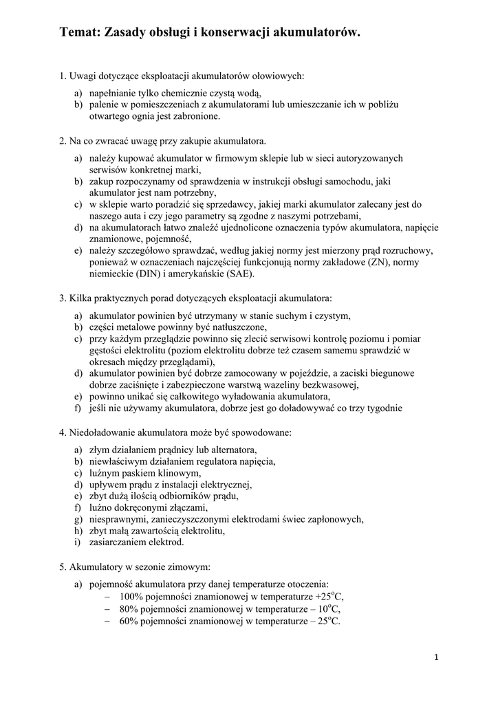 Temat: Zasady obsługi i konserwacji akumulatorów. 1. Uwagi dotyczące eksploatacji akumulatorów ołowiowych: a) napełnianie tylko chemicznie czystą wodą, b) palenie w pomieszczeniach z akumulatorami lub umieszczanie ich w pobliżu otwartego ognia jest zabronione. 2. Na co zwracać uwagę przy zakupie akumulatora. a) należy kupować akumulator w firmowym sklepie lub w sieci autoryzowanych serwisów konkretnej marki, b) zakup rozpoczynamy od sprawdzenia w instrukcji obsługi samochodu, jaki akumulator jest nam potrzebny, c) w sklepie warto poradzić się sprzedawcy, jakiej marki akumulator zalecany jest do naszego auta i czy jego parametry są zgodne z naszymi potrzebami, d) na akumulatorach łatwo znaleźć ujednolicone oznaczenia typów akumulatora, napięcie znamionowe, pojemność, e) należy szczegółowo sprawdzać, według jakiej normy jest mierzony prąd rozruchowy, ponieważ w oznaczeniach najczęściej funkcjonują normy zakładowe (ZN), normy niemieckie (DIN) i amerykańskie (SAE). 3. Kilka praktycznych porad dotyczących eksploatacji akumulatora: a) akumulator powinien być utrzymany w stanie suchym i czystym, b) części metalowe powinny być natłuszczone, c) przy każdym przeglądzie powinno się zlecić serwisowi kontrolę poziomu i pomiar gęstości elektrolitu (poziom elektrolitu dobrze też czasem samemu sprawdzić w okresach między przeglądami), d) akumulator powinien być dobrze zamocowany w pojeździe, a zaciski biegunowe dobrze zaciśnięte i zabezpieczone warstwą wazeliny bezkwasowej, e) powinno unikać się całkowitego wyładowania akumulatora, f) jeśli nie używamy akumulatora, dobrze jest go doładowywać co trzy tygodnie 4. Niedoładowanie akumulatora może być spowodowane: a) b) c) d) e) f) g) h) i) złym działaniem prądnicy lub alternatora, niewłaściwym działaniem regulatora napięcia, luźnym paskiem klinowym, upływem prądu z instalacji elektrycznej, zbyt dużą ilością odbiorników prądu, luźno dokręconymi złączami, niesprawnymi, zanieczyszczonymi elektrodami świec zapłonowych, zbyt małą zawartością elektrolitu, zasiarczaniem elektrod. 5. Akumulatory w sezonie zimowym: a) pojemność akumulatora przy danej temperaturze otoczenia: − 100% pojemności znamionowej w temperaturze +25oC, − 80% pojemności znamionowej w temperaturze – 10oC, − 60% pojemności znamionowej w temperaturze – 25oC. 1 6. Przed sezonem zimowym należy: a) sprawdzić poziom i gęstość elektrolitu ewentualnie uzupełnić go i doładować akumulator według instrukcji producenta, b) w samochodach z prądnicą prądu stałego, gdzie może występować ujemny bilans energetyczny, w razie potrzeby doładować akumulator poza pojazdem, c) przed rozruchem silnika należy pamiętać o wciśnięciu pedału sprzęgła, co zmniejsza opory stawiane rozrusznikowi, a tym samym zmniejsza pobór prądu z akumulatora, d) jeżeli samochód zimą nie będzie wykorzystywany należy wyjąć z niego akumulator i przechowywać w stanie naładowanym, e) można też stosować specjalne ocieplacze akumulatora, f) przynajmniej raz w miesiącu podładować akumulator, g) dbać o czystość powierzchni pokrywy akumulatora. UWAGA !!!!!!!!! Zbyt mała gęstość elektrolitu i niska temperatura mogą spowodować zamarznięcie elektrolitu i rozsadzenie obudowy akumulatora: a) elektrolit o gęstości 1,10 g/cm3 zamarza w temperaturze -9oC, b) elektrolit o gęstości 1.15 g/cm3 zamarza w temperaturze -15oC. 2