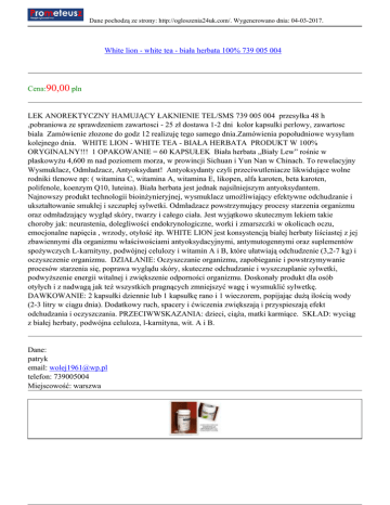 Dane pochodzą ze strony: http://ogloszenia24uk.com/. Wygenerowano dnia: 04-03-2017. White lion - white tea - biała herbata 100% 739 005 004 Cena:90,00 pln LEK ANOREKTYCZNY HAMUJĄCY ŁAKNIENIE TEL/SMS 739 005 004 przesyłka 48 h ,pobraniowa ze sprawdzeniem zawartosci - 25 zł dostawa 1-2 dni kolor kapsulki perlowy, zawartosc biala Zamówienie złozone do godz 12 realizuję tego samego dnia.Zamówienia popołudniowe wysyłam kolejnego dnia. WHITE LION - WHITE TEA - BIAŁA HERBATA PRODUKT W 100% ORYGINALNY!!! 1 OPAKOWANIE = 60 KAPSUŁEK Biała herbata „Biały Lew” rośnie w płaskowyżu 4,600 m nad poziomem morza, w prowincji Sichuan i Yun Nan w Chinach. To rewelacyjny Wysmuklacz, Odmładzacz, Antyoksydant! Antyoksydanty czyli przeciwutleniacze likwidujące wolne rodniki tlenowe np: ( witamina C, witamina A, witamina E, likopen, alfa karoten, beta karoten, polifenole, koenzym Q10, luteina). Biała herbata jest jednak najsilniejszym antyoksydantem. Najnowszy produkt technologii bioinżynieryjnej, wysmuklacz umożliwiający efektywne odchudzanie i ukształtowanie smukłej i szczupłej sylwetki. Odmładzacz powstrzymujący procesy starzenia organizmu oraz odmładzający wygląd skóry, twarzy i całego ciała. Jest wyjątkowo skutecznym lekiem takie choroby jak: neurastenia, dolegliwości endokrynologiczne, worki i zmarszczki w okolicach oczu, emocjonalne napięcia , wrzody, otyłość itp. WHITE LION jest konsystencją białej herbaty liściastej z jej zbawiennymi dla organizmu właściwościami antyoksydacyjnymi, antymutogennymi oraz suplementów spożywczych L-karnityny, podwójnej celulozy i witamin A i B, które ułatwiają odchudzenie (3,2-7 kg) i oczyszczenie organizmu. DZIAŁANIE: Oczyszczanie organizmu, zapobieganie i powstrzymywanie procesów starzenia się, poprawa wyglądu skóry, skuteczne odchudzanie i wyszczuplanie sylwetki, podwyższenie energii witalnej i zwiększenie odporności organizmu. Doskonały produkt dla osób otyłych i z nadwagą jak też wszystkich pragnących zmniejszyć wagę i wysmuklić sylwetkę. DAWKOWANIE: 2 kapsułki dziennie lub 1 kapsułkę rano i 1 wieczorem, popijając dużą ilością wody (2-3 litry w ciągu dnia). Dodatkowy ruch, spacery i ćwiczenia zwiększają i przyspieszają efekt odchudzania i oczyszczania. PRZECIWWSKAZANIA: dzieci, ciąża, matki karmiące. SKŁAD: wyciąg z białej herbaty, podwójna celuloza, l-karnityna, wit. A i B. Dane: patryk email: [email protected] telefon: 739005004 Miejscowość: warszwa