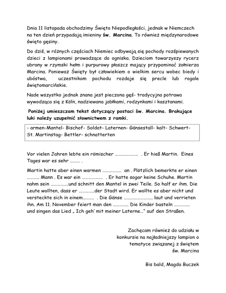 Dnia 11 listopada obchodzimy Święto Niepodległości, jednak w Niemczech na ten dzień przypadają imieniny św. Marcina. To również międzynarodowe święto gęsiny. Do dziś, w różnych częściach Niemiec odbywają się pochody rozśpiewanych dzieci z lampionami prowadzące do ogniska. Dzieciom towarzyszy rycerz ubrany w rzymski hełm i purpurowy płaszcz mający przypominać żołnierza Marcina. Ponieważ Święty był człowiekiem o wielkim sercu wobec biedy i ubóstwa, uczestnikom świętomarcińskie. pochodu rozdaje się precle lub rogale Nade wszystko jednak znana jest pieczona gęś- tradycyjna potrawa wywodząca się z Köln, nadziewana jabłkami, rodzynkami i kasztanami. Poniżej umieszczam tekst dotyczący postaci św. Marcina. Brakujące luki należy uzupełnić słownictwem z ramki. - armen-Mantel- Bischof- Soldat- Laternen- Gänsestall- kalt- SchwertSt. Martinstag- Bettler- schnatterten Vor vielen Jahren lebte ein römischer ………………… . Er hieß Martin. Eines Tages war es sehr ……… . Martin hatte aber einen warmen …………….. an . Plötzlich bemerkte er einen ……….. Mann . Es war ein ………………. . Er hatte sogar keine Schuhe. Martin nahm sein …………….und schnitt den Mantel in zwei Teile. So half er ihm. Die Leute wollten, dass er …………..der Stadt wird. Er wollte es aber nicht und versteckte sich in einem………. . Die Gänse …………………….. laut und verrieten ihn. Am 11. November feiert man den ………….. Die Kinder basteln ………….. und singen das Lied „ Ich geh‘ mit meiner Laterne…“ auf den Straßen. Zachęcam również do udziału w konkursie na najładniejszy lampion o tematyce związanej z świętem św. Marcina Bis bald, Magda Buczek