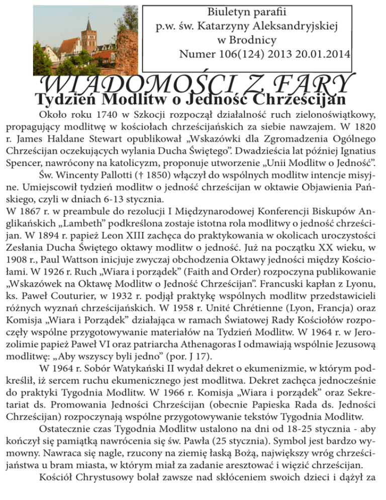 Biuletyn parafii p.w. św. Katarzyny Aleksandryjskiej w Brodnicy Numer 106(124) 2013 20.01.2014 WIADOMOŚCI Z FARY Tydzień Modlitw o Jedność Chrześcijan Około roku 1740 w Szkocji rozpoczął działalność ruch zielonoświątkowy, propagujący modlitwę w kościołach chrześcijańskich za siebie nawzajem. W 1820 r. James Haldane Stewart opublikował „Wskazówki dla Zgromadzenia Ogólnego Chrześcijan oczekujących wylania Ducha Świętego”. Dwadzieścia lat później Ignatius Spencer, nawrócony na katolicyzm, proponuje utworzenie „Unii Modlitw o Jedność”. Św. Wincenty Pallotti († 1850) włączył do wspólnych modlitw intencje misyjne. Umiejscowił tydzień modlitw o jedność chrześcijan w oktawie Objawienia Pańskiego, czyli w dniach 6-13 stycznia. W 1867 r. w preambule do rezolucji I Międzynarodowej Konferencji Biskupów Anglikańskich „Lambeth” podkreślona zostaje istotna rola modlitwy o jedność chrześcijan. W 1894 r. papież Leon XIII zachęca do praktykowania w okolicach uroczystości Zesłania Ducha Świętego oktawy modlitw o jedność. Już na początku XX wieku, w 1908 r., Paul Wattson inicjuje zwyczaj obchodzenia Oktawy jedności między Kościołami. W 1926 r. Ruch „Wiara i porządek” (Faith and Order) rozpoczyna publikowanie „Wskazówek na Oktawę Modlitw o Jedność Chrześcijan”. Francuski kapłan z Lyonu, ks. Paweł Couturier, w 1932 r. podjął praktykę wspólnych modlitw przedstawicieli różnych wyznań chrześcijańskich. W 1958 r. Unité Chrétienne (Lyon, Francja) oraz Komisja „Wiara i Porządek” działająca w ramach Światowej Rady Kościołów rozpoczęły wspólne przygotowywanie materiałów na Tydzień Modlitw. W 1964 r. w Jerozolimie papież Paweł VI oraz patriarcha Athenagoras I odmawiają wspólnie Jezusową modlitwę: „Aby wszyscy byli jedno” (por. J 17). W 1964 r. Sobór Watykański II wydał dekret o ekumenizmie, w którym podkreślił, iż sercem ruchu ekumenicznego jest modlitwa. Dekret zachęca jednocześnie do praktyki Tygodnia Modlitw. W 1966 r. Komisja „Wiara i porządek” oraz Sekretariat ds. Promowania Jedności Chrześcijan (obecnie Papieska Rada ds. Jedności Chrześcijan) rozpoczynają wspólne przygotowywanie tekstów Tygodnia Modlitw. Ostatecznie czas Tygodnia Modlitw ustalono na dni od 18-25 stycznia - aby kończył się pamiątką nawrócenia się św. Pawła (25 stycznia). Symbol jest bardzo wymowny. Nawraca się nagle, rzucony na ziemię łaską Bożą, największy wróg chrześcijaństwa u bram miasta, w którym miał za zadanie aresztować i więzić chrześcijan. Kościół Chrystusowy bolał zawsze nad skłóceniem swoich dzieci i dążył za wszelką cenę do ich pojednania w Jezusie Chrystusie. Szedł także na daleko idące ustępstwa. I tak np. Kościołom Wschodnim przyłączonym zostawił własny obrządek i język liturgiczny, własny kalendarz, a nawet własne ustawodawstwo. W historii ruchów ekumenicznych odróżnić możemy trzy etapy: wiek III i IV, gdy stała się aktualna sprawa powrotu do Kościoła tych, którzy od niego odpadli z obawy prześladowań (tzw. lapsi); wiek XII-XV to próby pozyskania dla jedności prawosławia; i współczesne kierunki, dążące ku zjednoczeniu rodziny chrześcijańskiej. Obecnie Światowa Rada Kościołów skupia 286 Kościołów i wyznań chrześcijańskich. Oprócz jednak tej akcji ogólnoludzkiej bardzo żywo toczy się dialog pomiędzy poszczególnymi Kościołami. Utworzone zostały komisje dla rozważenia problemów, które łączą i które dzielą braci odłączonych od Kościoła. W duchu miłości, cierpliwie prowadzi się teologiczne poszukiwanie do uzgodnienia poglądów. Dla przykładu: z Kościołem syryjsko-prawosławnym i koptyjsko-prawosławnym obie strony doszły do przekonania, że w dziedzinie tajemnicy natury ludzkiej Chrystusa, która w wieku V była formalną przyczyną rozłamu, używa się wprawdzie różnego języka teologicznego, ale treść tej nauki jest ta sama. Można więc powiedzieć, że obie strony wyznają tę samą prawdę, chociaż Kościół Rzymski ją ściślej może precyzuje. Ze wspólnotą anglikańską uzgodniono wiarę w tajemnicę realnej obecności Chrystusa w Najświętszym Sakramencie, jak też odnośnie do urzędu kościelnego, do którego wchodzi się przez święcenia kapłańskie. W dialogu katolicko-luterańskim nastąpiło znaczne zbliżenie poglądów w tak zasadniczych sprawach, jak: Pismo święte, tradycja, usprawiedliwienie, urząd duchowny, a nawet prymat papieża. Panie, modlę się, jak Ty się modliłeś: obyśmy wszyscy byli jedno, jak Ojciec jest w Tobie, a Ty w Nim, aby reszta świata uwierzyła, że to Ojciec Ciebie posłał. Dlatego modlę się też za owce, które nie należą do Twojej Owczarni, by one też usłyszały Twój Głos. Modlę się za muzułmanów, żydów i innych, aby od dziś miłowali Ciebie. Amen. OGŁOSZENIA PARAFIALNE II Niedziela Zwykła 19. stycznia 2014 1. Dziś obchodzimy Światowy Dzień Migranta. Pamiętajmy w naszych modlitwach o wszystkich, którzy z różnych przyczyn musieli opuścić swoją ojczyznę, szczególnie o naszych młodych rodakach, którzy wyemigrowali „za chlebem”, gdyż w naszej Ojczyźnie nie znaleźli pracy. 2. Dziś w Kaplicy Krzyża Św. o godz. 17.00 zapraszamy na spotkanie modlitewne przed Obrazem JEZU UFAM TOBIE. 3. W kalendarzu liturgicznym wspominać będziemy: w poniedziałek 20. stycz- nia św. Fabiana i św. Sebastiana, męczenników. Ks. Sebastianowi z okazji imienin życzymy wielu łask Bożych w posłudze kapłańskiej w naszej parafii. we wtorek 21. stycznia św. Agnieszkę, dziewicę i męczennicę. Jest to także Dzień Babci, zaś 22. stycznia przypada Dzień Dziadka. Pamiętajmy w naszych modlitwach o naszych babciach i dziadkach, którym tak wiele zawdzięczamy. W piątek 24. stycznia - św. Franciszka Salezego, biskupa i doktora Kościoła. Jest On patronem dziennikarzy i mediów katolickich. Zach