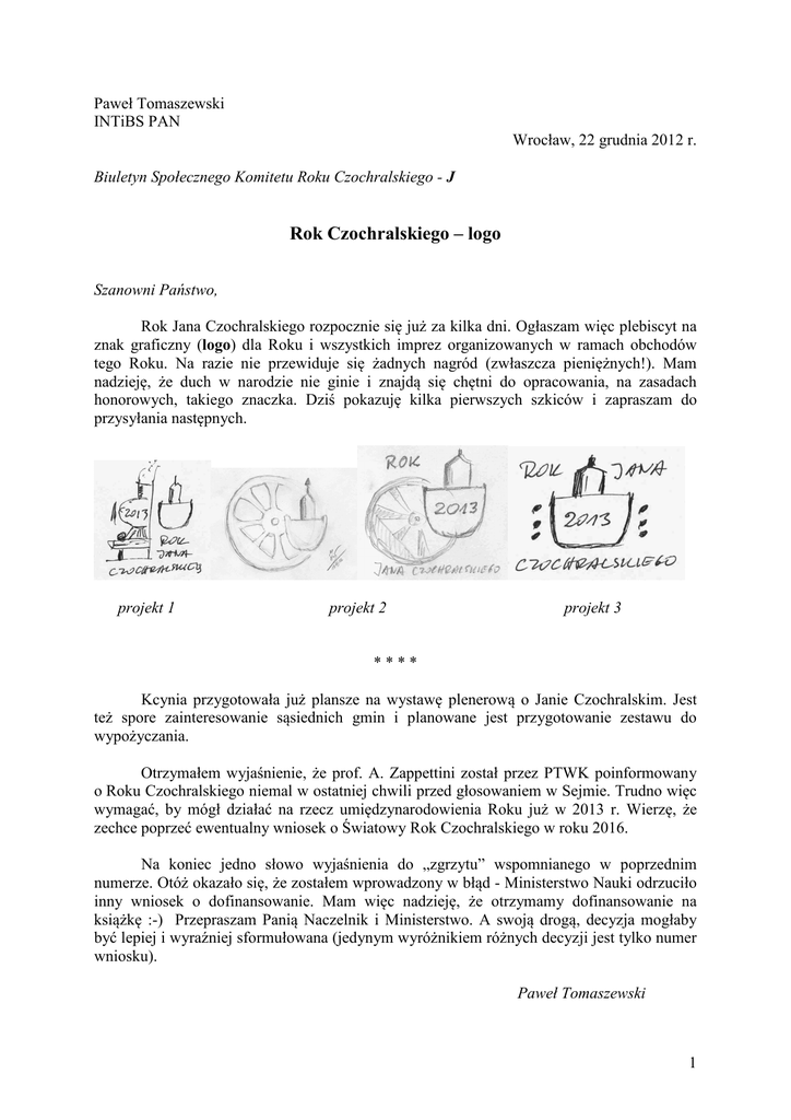 Paweł Tomaszewski INTiBS PAN Wrocław, 22 grudnia 2012 r. Biuletyn Społecznego Komitetu Roku Czochralskiego - J Rok Czochralskiego – logo Szanowni Państwo, Rok Jana Czochralskiego rozpocznie się już za kilka dni. Ogłaszam więc plebiscyt na znak graficzny (logo) dla Roku i wszystkich imprez organizowanych w ramach obchodów tego Roku. Na razie nie przewiduje się żadnych nagród (zwłaszcza pieniężnych!). Mam nadzieję, że duch w narodzie nie ginie i znajdą się chętni do opracowania, na zasadach honorowych, takiego znaczka. Dziś pokazuję kilka pierwszych szkiców i zapraszam do przysyłania następnych. projekt 1 projekt 2 projekt 3 **** Kcynia przygotowała już plansze na wystawę plenerową o Janie Czochralskim. Jest też spore zainteresowanie sąsiednich gmin i planowane jest przygotowanie zestawu do wypożyczania. Otrzymałem wyjaśnienie, że prof. A. Zappettini został przez PTWK poinformowany o Roku Czochralskiego niemal w ostatniej chwili przed głosowaniem w Sejmie. Trudno więc wymagać, by mógł działać na rzecz umiędzynarodowienia Roku już w 2013 r. Wierzę, że zechce poprzeć ewentualny wniosek o Światowy Rok Czochralskiego w roku 2016. Na koniec jedno słowo wyjaśnienia do „zgrzytu” wspomnianego w poprzednim numerze. Otóż okazało się, że zostałem wprowadzony w błąd - Ministerstwo Nauki odrzuciło inny wniosek o dofinansowanie. Mam więc nadzieję, że otrzymamy dofinansowanie na książkę :-) Przepraszam Panią Naczelnik i Ministerstwo. A swoją drogą, decyzja mogłaby być lepiej i wyraźniej sformułowana (jedynym wyróżnikiem różnych decyzji jest tylko numer wniosku). Paweł Tomaszewski 1