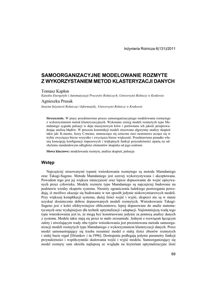 Inżynieria Rolnicza 6(131)/2011 SAMOORGANIZACYJNE MODELOWANIE ROZMYTE Z WYKORZYSTANIEM METOD KLASTERYZACJI DANYCH Tomasz Kapłon Katedra Energetyki i Automatyzacji Procesów Rolniczych, Uniwersytet Rolniczy w Krakowie Agnieszka Prusak Instytut Inżynierii Rolniczej i Informatyki, Uniwersytet Rolniczy w Krakowie Streszczenie. W pracy przedstawiono proces samoorganizacyjnego modelowania rozmytego z wykorzystaniem metod klasteryzacyjnych. Wykonano szereg modeli rozmytych typu Mamdaniego sygnału pulsacji w doju maszynowym krów i porównano ich jakość przeprowadzając analizę błędów. W procesie konstrukcji modeli stosowano algorytmy analizy skupień takie jak: K-means, fuzzy C-means, samouczące się sztuczne sieci neuronowe uczące się w trybie zwycięzca bierze wszystko i zwycięzca bierze większość. Przedstawiono ponadto własną koncepcję konfiguracji trapezowych i trójkątnych funkcji przynależności opartą na odchyleniu standardowym odległości elementów skupiska od jego centrum. Słowa kluczowe: modelowanie rozmyte, analiza skupień, pulsacja Wstęp Najczęściej stosowanymi typami wnioskowania rozmytego są metoda Mamdaniego oraz Takagi-Sugeno. Metoda Mamdaniego jest szerzej wykorzystywana i akceptowana. Powodem tego jest jej większa intuicyjność oraz lepsze dopasowanie do wejść opisywanych przez człowieka. Modele rozmyte typu Mamdaniego są najczęściej budowane na podstawie wiedzy eksperta systemu. Niestety ograniczenia ludzkiego postrzegania powodują, iż możliwe okazuje się budowanie w ten sposób jedynie niskowymiarowych modeli. Przy większej komplikacji systemu, dużej ilości wejść i wyjść, eksperci nie są w stanie uzyskać dostatecznie dobrze dopasowanych modeli rozmytych. Wnioskowanie TakagiSugeno jest z kolei efektywniejsze obliczeniowo, lepiej dopasowane do analiz matematycznych oraz wydajniejsze dla technik optymalizacji i adaptacji. Najistotniejszą wadą tego typu wnioskowania jest to, że mogą być konstruowane jedynie za pomocą analizy danych z systemu. Modele takie stają się przez to mało zrozumiałe. Jednym z rozwiązań łączącym zalety i niwelującym wady obu typów wnioskowania jest prezentowana metoda samoorganizacji modeli rozmytych typu Mamdaniego z wykorzystaniem klasteryzacji danych. Przez model samonastrajający się trzeba rozumieć model o stałej ilości zbiorów rozmytych i stałej bazie reguł [Driankov i in.1996]. Dostrajaniu podlegają jedynie parametry funkcji przynależności i współczynniki skalowania wejść i wyjść modelu. Samoorganizujący się model rozmyty sam określa najlepszą ze względu na kryterium optymalizacyjne ilość 69 Tomasz Kapłon, Agnieszka Prusak i postać funkcji przynależności, reguł, zbiorów rozmytych wejścia i wyjścia systemu. Modele takie są zwykle dokładniejsze w odwzorowaniu oryginalnego obiektu czy danych, ale są także trudniejsze w budowie [Piegat 1999]. Istnieją również inne metody samoorganizacji i samostrojenia modeli rozmytych np.: przekształcenie ich w rozmytą sieć neuronową, strojenie funkcji przynależności za pomocą algorytmów genetycznych, czy też metoda punktów maksymalnego błędu bezwzględnego. Cel Celem opracowania było dokonanie syntezy algorytmów analizy skupień oraz samoorganizujących sztucznych sieci neuronowych dla danych wielowymiarowych w celu znalezienia parametrów rozmytej funkcji przynależności typu trapezowego oraz trójkątnego. Opracowano i zaimplementowano w środowisku MATLAB program modelujący oraz przetestowano jego działanie na przykładzie odwzorowania wygenerowanego sygnału pulsacji w doju krów. Przeprowadzono także analizę błędów: średniego i jego odchylenia standardowego oraz RMSE (ang. Root Mean Square Error) - pierwiastka błędu średniokwadratowego modelowania sygnału pulsacji. W pracy przetestowano algorytm generacji parametrów funkcji przynależności modelu pulsacji w aparacie udojowym dla krów przy zmiennych parametrach takich jak: – rodzaj funkcji przynależności: trójkątna lub trapezowa, – użyty algorytm analizy skupień: K-means, C-means, samoorganizujące się sztuczne sieci neuronowe (SOM SNN) w trybie uczenia Winner Takes All (WTA) oraz Winner Takes Most (WTM). Metodyka W badaniach konstruowano samoorganizacyjne rozmyte modele typu Mamdaniego metodami klasteryzacyjnymi. Zaproponowano własną koncepcję konfiguracji użytych funkcji przynależności (rys. 1). Kluczowym parametrem konfiguracyjnym jest rozmiar odnalezionego skupiska, opisywany parametrem σ, który dla każdego z nich, w każdym wymiarze jest inny i równy co do wartości odchyleniu standardowemu odległości między centroidem a obiektami do tego klastra zakwalifikowanymi. W opracowywanych modelach systemów stosowano najprostsze bazy reguł. Dla systemu typu MISO o dwóch wejściach x1, x2 i jednym wyjściu y baza reguł wyglądałaby następująco: Reguła 1: IF (x1=A1) AND (x2=B1) THEN (y=C1) Reguła 2: IF (x1=A2) AND (x2=B2) THEN (y=C2) gdzie: N 70 Reguła N: IF (x1=AN) AND (x2=BN) THEN (y=CN), – liczba funkcji przynależności. W konstruowanych modelach wartość ta wynika z ilości wykrytych w analizie skupień klastrów. Samoorganizacyjne modelowanie... Y Elipsa o promieniach równych odchyleniom standardowym odległości w poszczególnych wymiarach punktów klastra od jego centroidu 0,5 σ 0,5 σ δ 1 X 1 σ σ Źródło: opracowanie własne Rys. 1. Fig. 1. Generacja trapezowych funkcji przynależności z parametrów jednego klastra dla danych dwuwymiarowych Generation of trapeze-membership functions from parameters of single cluster for two dimension data Sygnał pulsacji, stanowiący dane uczące i testujące, tworzące macierz [t, Ppuls], wygenerowano na podstawie symulacji komputerowej literaturowego modelu zmian ciśnienia bezwzględnego w komorze międzyściennej kubka udojowego w aparacie udojowym dla krów (rys. 2). Typy funkcji oraz odpowiednie współczynniki dobrano na podstawie wyników 