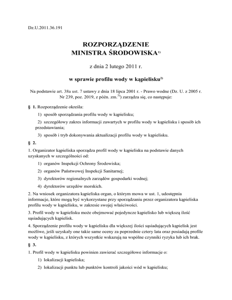 Dz.U.2011.36.191 ROZPORZĄDZENIE MINISTRA ŚRODOWISKA1) z dnia 2 lutego 2011 r. w sprawie profilu wody w kąpielisku2) Na podstawie art. 38a ust. 7 ustawy z dnia 18 lipca 2001 r. - Prawo wodne (Dz. U. z 2005 r. Nr 239, poz. 2019, z późn. zm.3)) zarządza się, co następuje: § 1. Rozporządzenie określa: 1) sposób sporządzania profilu wody w kąpielisku; 2) szczegółowy zakres informacji zawartych w profilu wody w kąpielisku i sposób ich przedstawiania; 3) sposób i tryb dokonywania aktualizacji profilu wody w kąpielisku. § 2. 1. Organizator kąpieliska sporządza profil wody w kąpielisku na podstawie danych uzyskanych w szczególności od: 1) organów Inspekcji Ochrony Środowiska; 2) organów Państwowej Inspekcji Sanitarnej; 3) dyrektorów regionalnych zarządów gospodarki wodnej; 4) dyrektorów urzędów morskich. 2. Na wniosek organizatora kąpieliska organ, o którym mowa w ust. 1, udostępnia informacje, które mogą być wykorzystane przy sporządzaniu przez organizatora kąpieliska profilu wody w kąpielisku, w zakresie swojej właściwości. 3. Profil wody w kąpielisku może obejmować pojedyncze kąpielisko lub większą ilość sąsiadujących kąpielisk. 4. Sporządzenie profilu wody w kąpielisku dla większej ilości sąsiadujących kąpielisk jest możliwe, jeśli uzyskały one takie same oceny za poprzednie cztery lata oraz posiadają profile wody w kąpielisku, z których wszystkie wskazują na wspólne czynniki ryzyka lub ich brak. § 3. 1. Profil wody w kąpielisku powinien zawierać szczegółowe informacje o: 1) lokalizacji kąpieliska; 2) lokalizacji punktu lub punktów kontroli jakości wód w kąpielisku; 3) cechach fizycznych, geograficznych i hydrologicznych wody w kąpielisku oraz innych wód powierzchniowych znajdujących się w zlewni kąpieliska, które mogłyby być źródłem zanieczyszczeń; 4) identyfikacji oraz ocenie przyczyn zanieczyszczeń, które mogłyby mieć wpływ na wodę w kąpielisku oraz wywierać niekorzystny wpływ na stan zdrowia kąpiących się, a w przypadku istnienia ryzyka krótkotrwałych zanieczyszczeń, również o: a) przewidywanym charakterze, częstotliwości oraz czasie trwania spodziewanego krótkotrwałego zanieczyszczenia, b) szczegółach wszelkich pozostałych przyczyn zanieczyszczeń, łącznie z podjętymi środkami zarządzania oraz harmonogramem eliminacji tych przyczyn, c) środkach zarządzania podjętych w przypadkach występowania zanieczyszczenia krótkotrwałego, wraz z określeniem podmiotów odpowiedzialnych za podjęcie takich działań i szczegółów dotyczących kontaktu z nimi; 5) ocenie możliwości rozmnożenia sinic; 6) ocenie możliwości rozmnożenia makroalg lub fitoplanktonu. 2. Szczegółowe informacje zawarte w profilu wody w kąpielisku przedstawia się w postaci tabelarycznej w formie wydruku oraz w wersji elektronicznej w postaci pliku .doc lub .pdf, a także w formie map w skali od 1:500 do 1:10 000 w postaci wydruku lub map w wersji elektronicznej, sporządzanych w postaci warstw Systemu Informacji Geograficznej (Geographic Information System - GIS), przedstawiających położenie kąpieliska lub grupy kąpielisk, zasięg kąpieliska lub grupy kąpielisk oraz informacje, o których mowa w ust. 1 pkt 3 i 4.4) 3. Na mapach, o których mowa w ust. 2, przedstawia się również cechy fizyczne, geograficzne i hydrologiczne wód powierzchniowych znajdujących się w zlewni kąpieliska, które mogłyby być źródłem zanieczyszczeń. 4. Wzór tabeli, o której mowa w ust. 2, jest określony w załączniku do rozporządzenia. 5. Informacje inne niż określone we wzorze tabeli, o której mowa w ust. 2, mogą być dołączone do profilu wody w kąpielisku w formie załączników. § 4. 1. Aktualizację profilu wody w kąpielisku sporządza organizator kąpieliska przed rozpoczęciem następnego sezonu kąpielowego, na podstawie danych uzyskanych w szczególności od organów, o których mowa w § 2 ust. 1. 2. Na wniosek organizatora kąpieliska organ dysponujący danymi, o których mowa w ust. 1, udostępnia informacje, które mogą być wykorzystane przy sporządzaniu przez organizatora kąpieliska aktualizacji profilu wody w kąpielisku, w zakresie swojej właściwości. 3. Aktualizacji, o której mowa w ust. 1, podlegają profile wody w kąpielisku sporządzone dla kąpielisk, w których jakość wody została sklasyfikowana jako "dobra", "dostateczna" albo "niedostateczna", jeżeli nastąpiły zmiany informacji, o których mowa w § 3 ust. 1. 4. Aktualizacji, o której mowa w ust. 1, dokonuje się z następującą częstotliwością: 1) co najmniej raz na 4 lata w przypadku kąpielisk, w których wody zostały zaklasyfikowane jako "dobre"; 2) co najmniej raz na 3 lata w przypadku kąpielisk, w których wody zostały zaklasyfikowane jako "dostateczne"; 3) co najmniej raz na 2 lata w przypadku kąpielisk, w których wody zostały zaklasyfikowane jako "niedostateczne". 5. Profile wody w kąpielisku sporządzone dla kąpielisk, w których woda została sklasyfikowana jako "doskonała", podlegają aktualizacji w przypadku zmiany informacji, o których mowa w § 3 ust. 1, wyłącznie wówczas, gdy klasyfikacja zostanie zmieniona na "dobrą", "dostateczną" albo "niedostateczną". 6. W przypadku przeprowadzenia istotnych prac budowlanych lub istotnych zmian w infrastrukturze kąpieliska lub w jego sąsiedztwie profil wody w kąpielisku powinien być aktualizowany przed rozpoczęciem następnego sezonu kąpielowego, niezależnie od wyników klasyfikacji wód w tym kąpielisku. § 5. Rozporządzenie wchodzi w życie po upływie 14 dni od dnia ogłoszenia. ______ 1) Minister Środowiska kieruje działem administracji rządowej - środowisko, na podstawie § 1 ust. 2 pkt 2 rozporządzenia Prezesa Rady Ministrów z dnia 16 listopada 2007 r. w sprawie szczegółowego zakresu działania Ministra Środowiska (Dz. U. Nr 216, poz. 1606). 2) Niniejsze rozporządzenie dokonuje w zakresie swojej regu