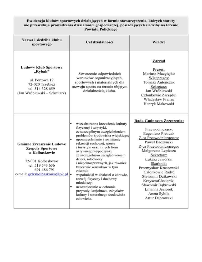 Ewidencja klubów sportowych działających w formie stowarzyszenia, których statuty nie przewidują prowadzenia działalności gospodarczej, posiadających siedzibę na terenie Powiatu Polickiego Nazwa i siedziba klubu sportowego Cel działalności Władze Zarząd Ludowy Klub Sportowy „Rybak” ul. Portowa 12 72-020 Trzebież tel. 514 328 659 (Jan Wróblewski – Sekretarz) Stworzenie odpowiednich warunków organizacyjnych, sportowych i materialnych dla rozwoju sportu na terenie objętym działalnością klubu. Gminne Zrzeszenie Ludowe Zespoły Sportowe w Kołbaskowie 72-001 Kołbaskowo tel. 519 543 636 691 486 791 e-mail: [email protected] wszechstronne krzewienie kultury fizycznej i turystyki, ze szczególnym uwzględnieniem problemów środowiska wiejskiego; upowszechnianie i rozwijanie rekreacji ruchowej, sportu i turystyki oraz innych form aktywnego wypoczynku ze szczególnym uwzględnieniem dzieci, młodzieży i niepełnosprawnych, jak również tworzenie warunków w tym zakresie; współudział w dbałości o zdrowie, rozwój fizyczny i duchowy młodzieży; uczestniczenie w ochronie przyrody, krajobrazu, zabytków kultury i naturalnego środowiska człowieka. Prezes: Mariusz Mazgiejko Wiceprezes: Tomasz Antończak Sekretarz: Jan Wróblewski Członkowie Zarządu: Władysław Franas Henryk Makowski Rada Gminnego Zrzeszenia: Przewodniczący: Eugeniusz Pietrzak Z-ca Przewodniczącego: Paweł Baczyński Z-ca Przewodniczącego: Małgorzata Lepiesza Sekretarz: Łukasz Jaworski Skarbnik: Przemysław Kraszewski Członkowie Rady: Sławomir Dzikowski Krzysztof Jezierski Sławomir Dąbrowski Lilianna Jeziorek Aneta Sybila Artur Dąbrowski Upowszechnianie kultury fizycznej i sportu poprzez działalność sportową i organizacyjną, m.in.: działalność w ramach sekcji podnoszenia ciężarów i sekcji Atletyczny Klub Sportowy kulturystycznej; PROMIEŃ Police rozwój sprawności fizycznej i kształtowania ul. Siedlecka 2b współzawodnictwa sportowego; 72-010 Police propagowanie rekreacji, sportu masowego i turystyki; e-mail: [email protected] kształtowanie pozytywnych cech u dzieci i młodzieży w oparciu o pozytywne wzorce sportowe. Gminne Stowarzyszenie Promocji Sportu FENIX Kołbaskowo 55/4 72-001 Kołbaskowo tel. 500 295 252 e-mail: [email protected] www.facebook.com/GSPS.Fenix działania na rzecz promocji inicjatyw lokalnych w zakresie turystyki, sportu i rekreacji; tworzenie i wspieranie więzi międzynarodowych wykorzystując działania w zakresie sportu; promowanie sportu na terenie Gminy Kołbaskowo; popieranie wszelkich działań mających na celu promowanie sportu na terenie Gminy Kołbaskowo; budowanie wzajemnych więzi międzyludzkich, poprzez wspieranie działań m.in. Koła Gospodyń Wiejskich, Ludowych Zespołów Sportowych, Ludowych Uczniowskich Klubów Sportowych, Uczniowskich Klubów Sportowych; pobudzanie i rozwój świadomości społecznej i aktywności obywateli; pobudzanie osób niepełnosprawnych do aktywności fizycznej; propagowanie zdrowego stylu życia; szerzenie tolerancji i poszanowania odrębności światopoglądowej i kulturowej; pomoc osobom szczególnie uzdolnionym w zakresie sportu, z terenu Gminy Kołbaskowo. Zarząd: Prezes: Antoni Rogowski Wiceprezes: Piotr Pełka Skarbnik: Henryk Kaczmarek Sekretarz: Artur Roczniewski Członek Zarządu: Ryszard Jeliński Zarząd: Prezes: Tomasz Żurawik Wiceprezes: Przemysław Pawelczuk Wiceprezes: Przemysław Słomkowski Skarbnik: Liliana Jeziorek Rada Powiatowa: Powiatowe Zrzeszenie Ludowe Zespoły Sportowe w Policach ul. Kościuszki 32 72-004 Trzeszczyn Wszechstronne krzewienie kultury fizycznej i turystki, ze szczególnym uwzględnieniem problemów środowiska wiejskiego. Adres do korespondencji: ul. Twardowskiego 12 b 72-320 Szczecin Nauczycielski Klub Szachowy ŚMIAŁY ul. Księcia Barnima I 26 72-010 Police tel. 91 317-53-95 601 992 551 e-mail: [email protected] www.smialy.pl Towarzystwo Krzewienia Kultury Fizycznej „Bielik“ Zespół Szkół w Nowym Warpnie Plac Zwycięstwa 6 72-022 Nowe Warpno tel. 517 509 798 e-mail: [email protected] promocja, popularyzacja i upowszechnianie idei sportu szachowego wśród mieszkańców Polic i województwa zachodniopomorskiego; edukacja szachowa; rozwój i promocja szachów polickich; integracja polickiego środowiska szachowego; współudział w inicjowaniu i koordynacji wszelkich inicjatyw mających podobne cele statutowe. prowadzenie działalności w sferze kultury fizycznej (współzawodnictwo sportowe z uwzględnieniem funkcji zdrowotnych, promocja zdrowia); rozwój masowej kultury fizycznej, upowszechnianie rekreacji ruchowej oraz innych form aktywnego wypoczynku wśród osób starszych, dorosłych, młodzieży i dzieci; propagowanie zdrowego stylu życia i wypoczynku, zapobieganie patologiom społecznym wśród młodzieży. Przewodniczący: Henryk Paluch Z-ca Przewodniczącego: Wiktor Misiak Z-ca Przewodniczącego: Jadwiga Martyniak Sekretarz: Natalia Stępień Skarbnik: Zbigniew Szczerkowski Zarząd Prezes: Mieczysław Manik Członkowie Zarządu: Genowefa Folbrycht Andrzej Kałuszyński Jacek Misiaszek Zarząd Prezes: Ewa Księżnik Wiceprezes: Iwona Moskal Sekretarz: Jolanta Gotfryd Klub Sportów Walki Police ul. Tanowska 2d 72-010 Police tel. 605 158 235 (Zbigniew Kotowski – Prezes), 509 562 160 (Jacek Mikulski – Instruktor) e-mail: [email protected] [email protected] [email protected] www.kswpolice.pl podejmowanie działań dla zapewnienia rozwoju psychofizycznego wychowania, doskonalenia uzdolnień i sprawności, zachowania zdrowi człowieka, w tym w szczególności dzieci i młodzieży oraz krzewienia wiedzy i utrwalania zwyczajów w tym zakresie; planowanie i organizowanie życia sportowego członków klubu w oparciu o możliwości obiektowe i sprzętowe; organizowanie zajęć sportowych w celu wszechstronnego rozwoju sprawności fizycznej i umysłowej członków klubu, a także w celu zapobiegania patologiom społecznym; organizowanie różnorodnych f