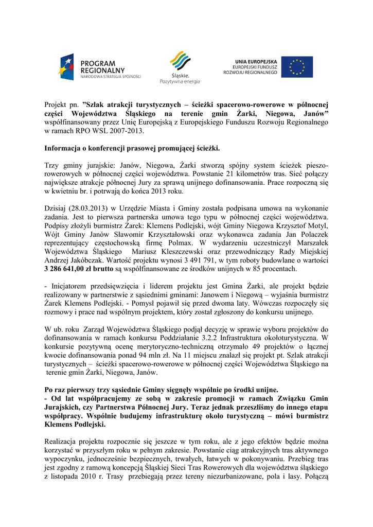 Projekt pn. ”Szlak atrakcji turystycznych – ścieżki spacerowo-rowerowe w północnej części Województwa Śląskiego na terenie gmin Żarki, Niegowa, Janów” współfinansowany przez Unię Europejską z Europejskiego Funduszu Rozwoju Regionalnego w ramach RPO WSL 2007-2013. Informacja o konferencji prasowej promującej ścieżki. Trzy gminy jurajskie: Janów, Niegowa, Żarki stworzą spójny system ścieżek pieszorowerowych w północnej części województwa. Powstanie 21 kilometrów tras. Sieć połączy największe atrakcje północnej Jury za sprawą unijnego dofinansowania. Prace rozpoczną się w kwietniu br. i potrwają do końca 2013 roku. Dzisiaj (28.03.2013) w Urzędzie Miasta i Gminy została podpisana umowa na wykonanie zadania. Jest to pierwsza partnerska umowa tego typu w północnej części województwa. Podpisy złożyli burmistrz Żarek: Klemens Podlejski, wójt Gminy Niegowa Krzysztof Motyl, Wójt Gminy Janów Sławomir Krzyształowski oraz wykonawca zadania Jan Polaczek reprezentujący częstochowską firmę Polmax. W wydarzeniu uczestniczył Marszałek Województwa Śląskiego Mariusz Kleszczewski oraz przewodniczący Rady Miejskiej Andrzej Jakóbczak. Wartość projektu wynosi 3 491 791, w tym roboty budowlane o wartości 3 286 641,00 zł brutto są współfinansowane ze środków unijnych w 85 procentach. - Inicjatorem przedsięwzięcia i liderem projektu jest Gmina Żarki, ale projekt będzie realizowany w partnerstwie z sąsiednimi gminami: Janowem i Niegową – wyjaśnia burmistrz Żarek Klemens Podlejski. - Pomysł pojawił się przed dwoma laty. Wówczas rozpoczęły się rozmowy i prace nad wspólnym projektem, który został zgłoszony do konkursu unijnego. W ub. roku Zarząd Województwa Śląskiego podjął decyzję w sprawie wyboru projektów do dofinansowania w ramach konkursu Poddziałanie 3.2.2 Infrastruktura okołoturystyczna. W konkursie pozytywną ocenę merytoryczno-techniczną otrzymało 49 projektów o łącznej kwocie dofinansowania ponad 94 mln zł. Na 11 miejscu znalazł się projekt pt. Szlak atrakcji turystycznych – ścieżki spacerowo-rowerowe w północnej części Województwa Śląskiego na terenie gmin Żarki, Niegowa, Janów. Po raz pierwszy trzy sąsiednie Gminy sięgnęły wspólnie po środki unijne. - Od lat współpracujemy ze sobą w zakresie promocji w ramach Związku Gmin Jurajskich, czy Partnerstwa Północnej Jury. Teraz jednak przeszliśmy do innego etapu współpracy. Wspólnie budujemy infrastrukturę około turystyczną – mówi burmistrz Klemens Podlejski. Realizacja projektu rozpocznie się jeszcze w tym roku, ale z jego efektów będzie można korzystać w przyszłym roku w pełnym zakresie. Powstanie ciąg atrakcyjnych tras aktywnego wypoczynku, jednocześnie bezpiecznych, trwałych, łatwych w pokonywaniu. Przebieg tras jest zgodny z ramową koncepcją Śląskiej Sieci Tras Rowerowych dla województwa śląskiego z listopada 2010 r. Trasy przebiegają przez tereny niezurbanizowane, pola i lasy. Połączą największe atrakcje: od ruin średniowiecznego zamku w Mirowie i Bobolicach do Żarek, następnie z Żarek obok sanktuarium leśniowskiego do Przewodziszowic, Czatachowy, Ostrężnika i Złotego Potoku. Z Przewodziszowic ścieżka poprowadzi w stronę Trzebniowa i Brzezin oraz z Trzebniowa do Ostrężnika. - Głównym zamierzeniem projektu jest połączenie ścieżek już istniejących. Trasa w Złotym Potoku zostanie połączona przez Gminę Żarki z trasami wybudowanymi nie tak dawno w Gminie Niegowa – wyjaśnia burmistrz Klemens Podlejski. Przy trasach znajdą się miejsca odpoczynku dla rowerzystów w ilości – 13 lokalizacji. Przy wytypowanych pięciu miejscach wykonane zostaną parking dla samochodów osobowych, w czterech lokalizacjach projektuje się warstwę ścieralną z betonu asfaltowego, jedynie parking w Złotym Potoku zostanie wyłożony kostką. Każde z projektowanych miejsc odpoczynku dla turysty wyposażone będzie w zadaszenie, stół z ławkami, stojak na rowery, kosz na śmieci. W niektórych wytypowanych lokalizacjach umieszczone jeszcze będą stojaki na narty biegowe m.in. w Przewodziszowicach, gdzie odbywają się co roku zawody z narciarstwa biegowego. Trasy zostaną oznaczone zgodnie z zasadami znakowania szlaków turystycznych PTTK. Ścieżki będą miały nawierzchnię bitumiczną. (przygotowała: Katarzyna Kulińska-Pluta, fot. Ania Stodółkiewicz)