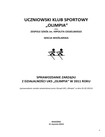 UCZNIOWSKI KLUB SPORTOWY „OLIMPIA” przy ZESPOLE SZKÓŁ im. HIPOLITA CEGIELSKIEGO SEKCJA WIOŚLARSKA SPRAWOZDANIE ZARZĄDU Z DZIAŁALNOŚCI UKS „OLIMPIA” W 2011 ROKU (sprawozdanie zostało zatwierdzone przez Zarząd UKS „Olimpia” w dniu 01.02.2012r) ROGOŹNO 31 stycznia 2012r 1 I. SŁOWO WSTĘPNE Rok 2011 był w działalności Uczniowskiego Klubu Sportowego „OLIMPIA” przy Zespole Szkół im. Hipolita Cegielskiego w Rogoźnie okresem szczególnym. Dotychczasowa działalność powołanego w 2008 roku UKS ukierunkowana była na organizację zajęć sportowych dla uczniów w celu wszechstronnego rozwoju sprawności fizycznej i umysłowej, organizację zawodów i imprez sportowych itp. Głównym zadaniem realizowanym przez UKS w latach 2009-2010 była nauka i upowszechnianie pływania. Decyzją Walnego Zebrania Sprawozdawczo-Wyborczego Klubu, w dniu 24 maja 2011 roku w strukturach UKS „OLIMPIA” powołano sekcję wioślarstwa młodzieżowego. Sekcja działa pod patronatem Poznańskiego Towarzystwa Wioślarzy „TRYTON” z Poznania, który zabezpiecza członkom sekcji opiekę trenerską, udział w akcjach szkoleniowych – zawodach, zgrupowaniach, konsultacjach oraz sprzęt specjalistyczny: łodzie wioślarskie, wiosła, ergometry; sprzęt asekuracyjny (motorówka). Dzień 16 czerwca 2011 roku wyznacza początek wioślarstwa w Rogoźnie. II. INFORMACJE OGÓLNE 1. Uczniowski Klub Sportowy „OLIMPIA” na dzień 31 grudnia 2011 roku skupiał 40 członków, w tym 19 zawodniczek i zawodników sekcji wioślarstwa młodzieżowego. 2. Wiodącym zadaniem Zarządu UKS w 2011 było stworzenie struktur organizacyjnych sekcji wioślarskiej, które oparte były o nw. dokumenty: „Oferta Poznańskiego Towarzystwa Wioślarzy „TRYTON” dla Rogoźna” w sprawie powołania sekcji wioślarstwa młodzieżowego w Rogoźnie. Porozumienie z dnia 19 kwietnia 2011 roku zawarte pomiędzy UKS „OLIMPIA” a PTW „TRYTON” w sprawie współdziałania i współpracy w zakresie szkolenia młodzieży wioślarskiej w Rogoźnie. Uchwały z dnia 24 maja 2011r Walnego Zebrania Sprawozdawczo-Wyborczego UKS „OLIMPIA” w sprawie powołania sekcji wioślarskiej, zmiany statutu UKS-u, wybory nowych władz klubu. Przyjęty do realizacji „Program działalności UKS „OLIMPIA” w 2011 roku”. 3. W dniu 16 czerwca 2011 roku na przystani Klubu Żeglarskiego „Kotwica” w Rogoźnie odbył się pierwszy trening wioślarski. 4. W dniu 17 września 2011 roku na torze regatowym Malta w Poznaniu podczas Mistrzostw Miasta Poznania i Międzywojewódzkich Mistrzostw Młodzików w wioślarstwie pierwszy raz wystartowali w regatach wioślarskich zawodnicy UKS „OLIMPIA”. 5. W dniu 25 listopada 2011 roku Zarząd UKS „OLIMPIA” zorganizował masową imprezę dla młodzieży szkolnej w Rogoźnie pn. „ERGOWIOSŁA W ROGOŹNIE”. W zawodach wzięło udział 220 uczestników z 11 szkół Gminy Rogoźno. 6. Do kadry wojewódzkiej juniorów w wioślarstwie na 2012 rok zostali powołani: MICHAŁ PILARSKI i MATEUSZ SMOLIŃSKI zaś do rezerw KWJ: Dawid Kościółek, Mateusz Turtoń, Damian Urbaniak. III. PRACA ZARZĄDU UKS „OLIMPIA” W 2011 ROKU. Do dnia 24 maja 2011 roku Zarząd UKS-u pracował w następującym składzie: 1. 2. 3. 4. 5. JAN PTASZYŃSKI – prezes JUSTYNA SZAJ - sekretarz RENATA TOMASZEWSKA – członek ALICJA WIESE – członek MARIA GOMULEC - członek 2 W dniu 24 maja 2011 roku – podczas Walnego Zebrania Sprawozdawczo-Wyborczego Klubu wybrano Zarząd w składzie: 1. ARTUR PIATKOWSKI 2. RYSZARD OLCZUK 3. RENATA TOMASZEWSKA 4. JAN PTASZYŃSKI 5. DANUTA SZYMAŃSKA - prezes - sekretarz - członek - członek - członek Zarząd UKS w dniu 15.11.2011 podjął uchwałę w sprawie zmiany funkcji w Zarządzie. Zmiana funkcji podyktowana była koniecznością przydziału zadań i kompetencji dla poszczególnych członków Zarządu. Wiąże się to głównie z rozszerzeniem działalności statutowej Klubu, co przy braku pracowników etatowych – ułatwia i udoskonala pracę Zarządu. Ww. zmiany - Zarząd przedłoży do zatwierdzenia przez najbliższe Walne Zebranie Klubu. Aktualny podział funkcji w Zarządzie: 1. ARTUR PIATKOWSKI 2. RENATA TOMASZEWSKA 3. JAN PTASZYŃSKI 4. DANUTA SZYMAŃSKA 5. RYSZARD OLCZUK - prezes - wiceprezes ds. organizacyjno-wychowawczych - wiceprezes ds. sportowo-gospodarczych - skarbnik - sekretarz Zarząd UKS pracował w 2011 roku w oparciu o przyjęty „Plan pracy Zarządu UKS „OLIMPIA” w 2011 roku”. Podstawowa praca Zarządu opierała się o realizację przyjętych zadań przez poszczególnych członków Zarządu. Od aktywności społecznej poszczególnych członków Zarządu w znacznym stopniu uzależnione były osiągnięte efekty organizacyjno-sportowe. Pracę Zarządu UKS-u reguluje statut Klubu oraz regulamin pracy Zarządu. Zarząd w nowej kadencji zebrał się na 3 zebraniach plenarnych. Zarząd konsekwentnie realizował przyjęty na początku kadencji w 2011r „Program działalności UKS „OLIMPIA” w 2011 roku”. W zebraniach Zarządu brali udział zapraszane osoby, których obecność była wymagana tematyką obrad. Głównymi tematami zebrań Zarządu były sprawy finansowe, sportowe i organizacyjne. Wszystkie zebrania plenarne były protokołowane. Protokóły i uchwały Zarządu są ujęte w księdze protokółów i uchwał Zarządu UKS. Stałym gościem zebrań Zarządu jest Pani WERONIKA, EWERTOWSKA, która odpowiada za promocję działalności UKS „OLIMPIA”. IV. KOMISJA REWIZYJNA Komisja Rewizyjna Uczniowskiego Klubu Sportowego „OLIMPIA” do dnia 24.05.2011r pracowała w składzie: 1. KAMILA ZALEWSKA – przewodnicząca 2. IWONA KENCZYŃSKA – członek 3. AGATA FRANCKOWSKA – członek W dniu 24.05.2011r podczas Walnego Zebrania Członków Klubu została wybrana komisja rewizyjna w składzie: 1. BERNADETA ŁUBIANKA – przewodnicząca 2. MARIA GOMULEC – członek 3. BARTOSZ EWERTOWSKI – sekretarz. Pracę Komisji Rewizyjnej reguluje st