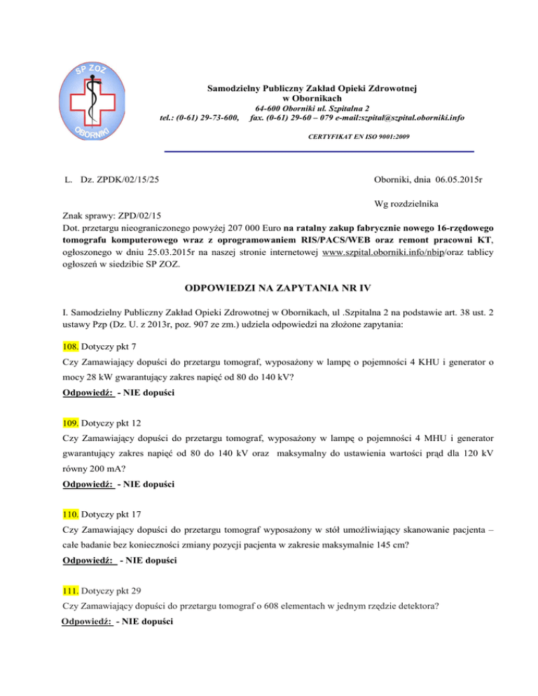Samodzielny Publiczny Zakład Opieki Zdrowotnej w Obornikach tel.: (0-61) 29-73-600, 64-600 Oborniki ul. Szpitalna 2 fax. (0-61) 29-60 – 079 e-mail:[email protected] CERTYFIKAT EN ISO 9001:2009 L. Dz. ZPDK/02/15/25 Oborniki, dnia 06.05.2015r Wg rozdzielnika Znak sprawy: ZPD/02/15 Dot. przetargu nieograniczonego powyŜej 207 000 Euro na ratalny zakup fabrycznie nowego 16-rzędowego tomografu komputerowego wraz z oprogramowaniem RIS/PACS/WEB oraz remont pracowni KT, ogłoszonego w dniu 25.03.2015r na naszej stronie internetowej www.szpital.oborniki.info/nbip/oraz tablicy ogłoszeń w siedzibie SP ZOZ. ODPOWIEDZI NA ZAPYTANIA NR IV I. Samodzielny Publiczny Zakład Opieki Zdrowotnej w Obornikach, ul .Szpitalna 2 na podstawie art. 38 ust. 2 ustawy Pzp (Dz. U. z 2013r, poz. 907 ze zm.) udziela odpowiedzi na złoŜone zapytania: 108. Dotyczy pkt 7 Czy Zamawiający dopuści do przetargu tomograf, wyposaŜony w lampę o pojemności 4 KHU i generator o mocy 28 kW gwarantujący zakres napięć od 80 do 140 kV? Odpowiedź: - NIE dopuści 109. Dotyczy pkt 12 Czy Zamawiający dopuści do przetargu tomograf, wyposaŜony w lampę o pojemności 4 MHU i generator gwarantujący zakres napięć od 80 do 140 kV oraz maksymalny do ustawienia wartości prąd dla 120 kV równy 200 mA? Odpowiedź: - NIE dopuści 110. Dotyczy pkt 17 Czy Zamawiający dopuści do przetargu tomograf wyposaŜony w stół umoŜliwiający skanowanie pacjenta – całe badanie bez konieczności zmiany pozycji pacjenta w zakresie maksymalnie 145 cm? Odpowiedź: - NIE dopuści 111. Dotyczy pkt 29 Czy Zamawiający dopuści do przetargu tomograf o 608 elementach w jednym rzędzie detektora? Odpowiedź: - NIE dopuści 112. Dotyczy pkt 33 Czy Zamawiający dopuści do przetargu tomograf o nie izotopowym kształcie woksela i wymiarze wzdłuŜ osi Z 0,625 mm? Odpowiedź: - NIE dopuści 113. Dotyczy pkt 35 Czy Zamawiający dopuści do przetargu tomograf o szybkości rekonstrukcji równej 12 obrazów/s? Odpowiedź: - NIE dopuści 114. Dotyczy pkt 47 Czy Zamawiający dopuści do przetargu tomograf o maksymalnej rozdzielczości wysokokontrastowej równej 14 pl/cm? Odpowiedź: - NIE dopuści 115. Dotyczy pkt 62 Czy Zamawiający dopuści do przetargu tomograf wyposaŜony w dwumonitorową stację technika z pomiarami geometrycznymi takimi jak: długość, kąty, powierzchnia bez pomiaru objętości? Odpowiedź: - NIE dopuści 116. Dotyczy pkt 73 Czy Zamawiający dopuści do przetargu tomograf bez specjalistycznego algorytmu opisanego w pkt 73? Odpowiedź: : - NIE dopuści 117. Dotyczy pkt 78 Czy Zamawiający dopuści do przetargu tomograf wyposaŜony w system monitorowania i ostrzegania o przekroczonych poziomach dawki ale bez oprogramowania do kontroli wartości i poziomu alarmowego dawki dla dorosłych i dzieci z uwzględnieniem progów wiekowych? Odpowiedź: - NIE dopuści 118. Dotyczy pkt 80 Czy Zamawiający dopuści do przetargu tomograf umoŜliwiający uzyskanie rozdzielczości niskokontrastowej 4 mm (wyŜszej niŜ opisana w pkt 80) przy dawce 19,8 mGy? Odpowiedź: - NIE dopuści 119. Dotyczy pkt 1-8 Czy Zamawiający dopuści do przetargu tomograf bez oprogramowania do monitorowania i raportowania poziomu dawki z tomografu komputerowego opisane w pkt 108 ale z oprogramowaniem do generowania raportu dawki oraz monitorowania dawki w trakcie badania zainstalowane w tomografie? Odpowiedź: - NIE dopuści 120. Czy Zamawiający wymaga aby dostarczany tomograf komputerowy wraz ze stacją lekarską opisową został równieŜ podłączony do posiadanego i działającego u Zamawiającego systemu PACS i RIS? Odpowiedź: - Zamawiający wymaga aby dostarczany tomograf komputerowy wraz ze stacją lekarską został podłączony do systemu RIS/PACS stanowiącego przedmiot zamówienia. 121. Czy Zamawiający dopuści dostarczenie i uruchomienie tomografu komputerowego wraz ze stacją lekarską opisową oraz zintegrowanie go z systemem PACS/RIS działającym aktualnie u Zamawiającego z jednoczesnym wymogiem dokonania integracji posiadanych systemów RIS Chazon i HIS Eskulap, jako rozwiązanie równowaŜne do dostarczenia nowego systemu PACS/RIS? Odpowiedź: - System RIS/PACS - wraz z tomografem komputerowym, stacją lekarską i innymi elementami o parametrach określony w SIWZ - stanowi przedmiot zamówienia i to z tym systemem zamawiający wymaga integracji. Dyrektor mgr Małgorzata Ludzkowska