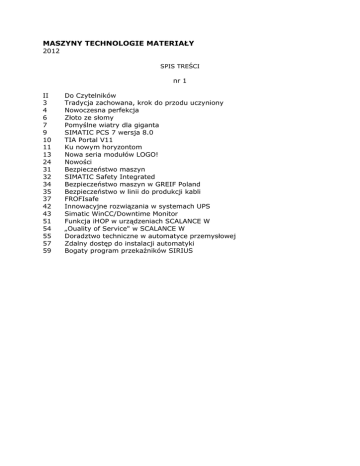 MASZYNY TECHNOLOGIE MATERIAŁY 2012 SPIS TREŚCI nr 1 II 3 4 6 7 9 10 11 13 24 31 32 34 35 37 42 43 51 54 55 57 59 Do Czytelników Tradycja zachowana, krok do przodu uczyniony Nowoczesna perfekcja Złoto ze słomy Pomyślne wiatry dla giganta SIMATIC PCS 7 wersja 8.0 TIA Portal V11 Ku nowym horyzontom Nowa seria modułów LOGO! Nowości Bezpieczeństwo maszyn SIMATIC Safety Integrated Bezpieczeństwo maszyn w GREIF Poland Bezpieczeństwo w linii do produkcji kabli FROFIsafe Innowacyjne rozwiązania w systemach UPS Simatic WinCC/Downtime Monitor Funkcja iHOP w urządzeniach SCALANCE W „Ouality of Service" w SCALANCE W Doradztwo techniczne w automatyce przemysłowej Zdalny dostęp do instalacji automatyki Bogaty program przekaźników SIRIUS nr 2 AUTOMATYKA, STEROWANIE II Elektrostrykcja w elastomerach 1 Monitor dwu- i trójwymiarowy 2 Trzy wymiary bez okularów 5 Usługi w telewizji cyfrowej 8 Mierzenie Ethernetu 8 Rekordowa szybkość transmisji danych 9 Rozwiązania automatyki inteligentnego budynku (1) 12 Skanujące kamery termowizyjne 14 Komunikacja na centymetry 17 Wyświetlacze OLED 18 Kamera widzi przestrzennie 19 Tranzystory IGBT w układach mocy 21 Ultrakondensatory 21 Zintegrowany napęd POMIARY 22 Pomiary poziomu i przepływu cieczy 24 Przetwornik ciśnienia 25 Oscyloskopy i generatory 27 Odbiornik - analizator pola elektromagnetycznego TECHNIKI WYTWARZANIA 28 Obróbka wykańczająca silników 31 Mroźna obróbka 32 Nożyce akumulatorowe 32 Wytwarzanie wodoru nr 3 AUTOMATYKA, STEROWANIE 2 Pamięci magneto rezystancyjne 3 Zabezpieczenia świetlne 4 Procesory komunikacyjne 5 System Galileo 10 Wydajne baterie słoneczne 10 Określenie obciążenia silnika elektrycznego 11 Sprzęgła bezpieczeństwa 11 Napęd z odzyskiem energii 12 Rozwiązania automatyki inteligentnego budynku (2) 15 Sterowanie silnikami elektrycznymi POMIARY 16 Scalone liczniki energii 17 Nowy wzmacniacz DF-G1 Expert 18 Mikrodozowanie 20 Pomiary wielkości nieelektrycznych 21 Mierzenie rur 22 Piezoelektryczne czujniki napełnienia TECHNIKI WYTWARZANIA II Wielkie podłoża II Naprawa wirników turbin 24 Implanty naczyń krwionośnych 26 Cięcie wodą 28 Łożyska dla ekologii 29 Nowe materiały skrawające 30 Uchwyty narzędziowe 30 Wrota na granicie 31 Przekładnie kątowe nr 4 AUTOMATYKA, STEROWANIE II Analizatory widma częstotliwości 2 Rozwiązania automatyki inteligentnego budynku (3) 4 Wydajniejsze baterie 5 ThinCoreV481 6 Elektrownie na dachu POMIARY 7 Piezorezystywne czujniki przyśpieszenia 8 Zdalny odczyt wyników pomiarowych 9 Pomiary drgań i uderzeń 9 Czujnik mocowania narzędzia 10 Wskaźniki świetlne EZ-LIGHT TECHNIKI WYTWARZANIA 11 Mikrosystemy elektromechaniczne 14 Ochrona antykorozyjna 14 Izolacja cieplna rurociągów 15 Kompozyty metalowo-węglowe 16 Lekkie koło frezowe 17 Części maszyn z kompozytów 19 Ekranowanie magnezem 20 Granitowa szlifierka 21 Szlifowanie rur 22 Wytwarzanie protez dentystycznych 23 Hydraulika na mrozy 24 Obróbka zielonej ceramiki 26 Przezroczyste obwody drukowane 27 Porowate spieki tworzywowe 27 Odlewy warstwowe w hamulcach nr 5 II 2 5 7 10 16 19 22 24 26 28 32 37 38 39 40 42 43 44 49 52 Do Czytelników System sterowania załadunkiem i rozładunkiem antracytu w procesie kalcynacji elektrycznej Przekształtnik AC/DC/AC współpracujący z nieidealną siecią elektroenergetyczną i implementacja na stanowisku z mikrokontrolerem DSP Rozproszona struktura ramowa do przetwarzania danych sensorycznych Projekt i wykonanie algorytmu sterowania procesem magazynowania elementów z zastosowaniem sterownika SIMATIC S7-300 Sieć ze sterowników PLC i HMI na szynie Ethernet System sterowania ruchem drogowym z wykorzystaniem sterownika SIMATIC S7-1200 Sekwencyjny układ sterowania podajnika i robota sortującego z dwoma kryteriami selekcji i wizualizacją procesu Narzędzia projektowe dla sterowników SIMATIC Narzędzia projektowe dla paneli SIMATIC HMI SIMATIC HMI Comfort Panels Nowości SIMATIC S7-1200 w maszynach specjalnych SIMATIC S7-300 i oprogramowanie SCADA WinCC Linia produkcyjna preparatów iniekcyjnych Nowoczesne technologie sterowania SIMATIC do nadzoru produkcji SIPLUS B-BAC Walidacja układów bezpieczeństwa SIMATIC S7-300 nr 6 AUTOMATYKA, STEROWANIE II Jednoatomowy tranzystor II Kilkuatomowe pamięci 1 Projektor wizyjny 2 Łączność w podróży 7 Sprawne panele słoneczne 7 Antena z ciekłych kryształów 8 Rozwiązania automatyki inteligentnego budynku (4) 11 Energia z promieniowania podczerwonego Słońca 14 Uniwersalna kamera POMIARY 15 Pomiary koncentracji cieczy 16 Pomiary narzędzi podczas pracy 16 Urządzenie pomiarowe Talyrond 500 17 Ręczne reflektometry TECHNIKI WYTWARZANIA 18 Optymalizacja pracy pras 20 Mycie dwutlenkiem węgla 21 Ochrona przed pękaniem 22 Dwufazowe chłodziwo 23 Łączenie lekkich konstrukcji 24 Powlekane wiertła 24 Kompozytowe koło z silnikiem elektrycznym 25 Obróbka dużych sztuk 27 Sprężyny o regulowanej sztywności 28 Stal wytrzymała i plastyczna Oprac. BPK
