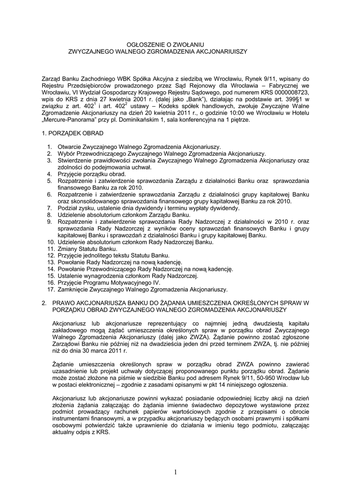 OGŁOSZENIE O ZWOŁANIU ZWYCZAJNEGO WALNEGO ZGROMADZENIA AKCJONARIUISZY Zarząd Banku Zachodniego WBK Spółka Akcyjna z siedzibą we Wrocławiu, Rynek 9/11, wpisany do Rejestru Przedsiębiorców prowadzonego przez Sąd Rejonowy dla Wrocławia – Fabrycznej we Wrocławiu, VI Wydział Gospodarczy Krajowego Rejestru Sądowego, pod numerem KRS 0000008723, wpis do KRS z dnia 27 kwietnia 2001 r. (dalej jako „Bank”), działając na podstawie art. 399§1 w związku z art. 4021 i art. 4022 ustawy – Kodeks spółek handlowych, zwołuje Zwyczajne Walne Zgromadzenie Akcjonariuszy na dzień 20 kwietnia 2011 r., o godzinie 10:00 we Wrocławiu w Hotelu „Mercure-Panorama” przy pl. Dominikańskim 1, sala konferencyjna na 1 piętrze. 1. PORZĄDEK OBRAD 1. Otwarcie Zwyczajnego Walnego Zgromadzenia Akcjonariuszy. 2. Wybór Przewodniczącego Zwyczajnego Walnego Zgromadzenia Akcjonariuszy. 3. Stwierdzenie prawidłowości zwołania Zwyczajnego Walnego Zgromadzenia Akcjonariuszy oraz zdolności do podejmowania uchwał. 4. Przyjęcie porządku obrad. 5. Rozpatrzenie i zatwierdzenie sprawozdania Zarządu z działalności Banku oraz sprawozdania finansowego Banku za rok 2010. 6. Rozpatrzenie i zatwierdzenie sprawozdania Zarządu z działalności grupy kapitałowej Banku oraz skonsolidowanego sprawozdania finansowego grupy kapitałowej Banku za rok 2010. 7. Podział zysku, ustalenie dnia dywidendy i terminu wypłaty dywidendy. 8. Udzielenie absolutorium członkom Zarządu Banku. 9. Rozpatrzenie i zatwierdzenie sprawozdania Rady Nadzorczej z działalności w 2010 r. oraz sprawozdania Rady Nadzorczej z wyników oceny sprawozdań finansowych Banku i grupy kapitałowej Banku i sprawozdań z działalności Banku i grupy kapitałowej Banku. 10. Udzielenie absolutorium członkom Rady Nadzorczej Banku. 11. Zmiany Statutu Banku. 12. Przyjęcie jednolitego tekstu Statutu Banku. 13. Powołanie Rady Nadzorczej na nową kadencję. 14. Powołanie Przewodniczącego Rady Nadzorczej na nową kadencję. 15. Ustalenie wynagrodzenia członkom Rady Nadzorczej. 16. Przyjęcie Programu Motywacyjnego IV. 17. Zamknięcie Zwyczajnego Walnego Zgromadzenia Akcjonariuszy. 2. PRAWO AKCJONARIUSZA BANKU DO ŻĄDANIA UMIESZCZENIA OKREŚLONYCH SPRAW W PORZĄDKU OBRAD ZWYCZAJNEGO WALNEGO ZGROMADZENIA AKCJONARIUSZY Akcjonariusz lub akcjonariusze reprezentujący co najmniej jedną dwudziestą kapitału zakładowego mogą żądać umieszczenia określonych spraw w porządku obrad Zwyczajnego Walnego Zgromadzenia Akcjonariuszy (dalej jako ZWZA). Żądanie powinno zostać zgłoszone Zarządowi Banku nie później niż na dwadzieścia jeden dni przed terminem ZWZA, tj. nie później niż do dnia 30 marca 2011 r. Żądanie umieszczenia określonych spraw w porządku obrad ZWZA powinno zawierać uzasadnienie lub projekt uchwały dotyczącej proponowanego punktu porządku obrad. Żądanie może zostać złożone na piśmie w siedzibie Banku pod adresem Rynek 9/11, 50-950 Wrocław lub w postaci elektronicznej – zgodnie z zasadami opisanymi w pkt 14 niniejszego ogłoszenia. Akcjonariusz lub akcjonariusze powinni wykazać posiadanie odpowiedniej liczby akcji na dzień złożenia żądania załączając do żądania imienne świadectwo depozytowe wystawione przez podmiot prowadzący rachunek papierów wartościowych zgodnie z przepisami o obrocie instrumentami finansowymi, a w przypadku akcjonariuszy będących osobami prawnymi i spółkami osobowymi potwierdzić także uprawnienie do działania w imieniu tego podmiotu, załączając aktualny odpis z KRS. 1 3. PRAWO AKCJONARIUSZA DO ZGŁASZANIA PROJEKTÓW UCHWAŁ DOTYCZĄCYCH SPRAW WPROWADZONYCH DO PORZĄDKU OBRAD ZWZA LUB SPRAW, KTÓRE MAJĄ ZOSTAĆ WPROWADZONE DO PORZĄDKU OBRAD PRZED TERMINEM ZWZA Akcjonariusz lub akcjonariusze reprezentujący co najmniej jedną dwudziestą kapitału zakładowego mogą przed terminem ZWZA zgłaszać na piśmie w siedzibie Banku pod adresem Rynek 9/11, 50-950 Wrocław lub w postaci elektronicznej – zgodnie z zasadami opisanymi w pkt 14 niniejszego ogłoszenia – projekty uchwał dotyczące spraw wprowadzonych do porządku obrad ZWZA lub spraw, które mają zostać wprowadzone do porządku obrad. Akcjonariusz lub akcjonariusze zobowiązani są dołączyć do zgłoszenia dokumenty, o których mowa w pkt 2 powyżej. 4. PRAWO AKCJONARIUSZA DO ZGŁASZANIA PROJEKTÓW UCHWAŁ DOTYCZĄCYCH SPRAW WPROWADZONYCH DO PORZĄDKU OBRAD PODCZAS ZWZA Każdy z akcjonariuszy może podczas ZWZA zgłaszać projekty uchwał dotyczące spraw wprowadzonych do porządku obrad. 5. INFORMACJA O SPOSOBIE WYKONYWANIA PRAWA GŁOSU PRZEZ PEŁNOMOCNIKA, W TYM W SZCZEGÓLNOŚCI O FORMULARZACH STOSOWANYCH PODCZAS GŁOSOWANIA PRZEZ PEŁNOMOCNIKA, ORAZ SPOSOBIE ZAWIADAMIANIA BANKU PRZY WYKORZYSTANIU ŚRODKÓW KOMUNIKACJI ELEKTRONICZNEJ O USTANOWIENIU PEŁNOMOCNIKA Akcjonariusz może uczestniczyć w ZWZA oraz wykonywać prawo głosu osobiście lub przez pełnomocnika. Wzór formularza pozwalającego na wykonywanie prawa głosu przez pełnomocnika, zawierającego dane określone w art. 4023§3 ustawy – Kodeks spółek handlowych, został zamieszczony na stronie internetowej Banku pod adresem http://www.bzwbk.pl/wza. Pełnomocnictwo do uczestniczenia w ZWZA i wykonywania prawa głosu wymaga udzielenia na piśmie lub w postaci elektronicznej. Udzielenie pełnomocnictwa w postaci elektronicznej nie wymaga opatrzenia bezpiecznym podpisem elektronicznym weryfikowanym przy pomocy ważnego kwalifikowanego certyfikatu. 5.1. Pełnomocnictwo udzielone na piśmie W przypadku, gdy akcjonariusz udzielił pełnomocnictwa na piśmie, pełnomocnik obowiązany jest przy sporządzaniu listy obecności: - przedłożyć kopię dokumentu pełnomocnictwa wraz z kopiami dokumentów umożliwiających potwierdzenie uprawnienia do reprezentacji akcjonariusza (aktualny odpis z KRS w przypadku osób prawnych i spółek osobowych) za jednoczesnym okazaniem oryginałów tych dokumentów, - okazać dokument pozwalający na ide