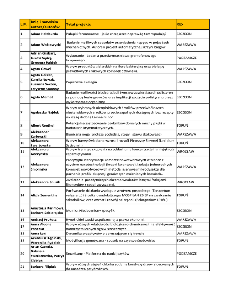 L.P. Imię i nazwisko autora/autorów Tytuł projektu REX