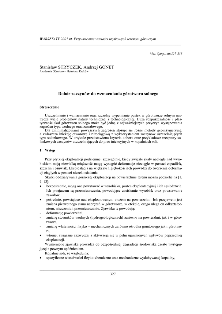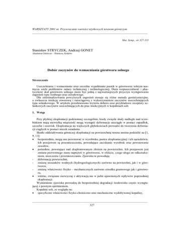 WARSZTATY 2001 nt. Przywracanie wartości użytkowych terenom górniczym ____________________________________________________________________________ Mat. Symp., str.327-335 Stanisław STRYCZEK, Andrzej GONET Akademia Górniczo – Hutnicza, Kraków Dobór zaczynów do wzmacniania górotworu solnego Streszczenie Uszczelnianie i wzmacnianie oraz szczelne wypełnianie pustek w górotworze solnym nastręcza wiele problemów natury technicznej i technologicznej. Duża rozpuszczalność i plastyczność skał górotworu solnego może być jedną z najważniejszych przyczyn występowania zagrożeń typu wodnego oraz zawałowego. Dla zminimalizowania powyższych zagrożeń stosuje się różne metody geoinżynieryjne, a zwłaszcza iniekcję otworową i rurociągową z wykorzystaniem zaczynów uszczelniających typu solankowego. W artykule przedstawiono kryteria doboru oraz przykładowe receptury solankowych zaczynów uszczelniających do prac iniekcyjnych w kopalniach soli. 1. Wstęp Przy płytkiej eksploatacji podziemnej szczególnie, kiedy zwięzłe skały nadległe nad wyrobiskiem mają niewielką miąższość mogą wystąpić deformacje nieciągłe w postaci zapadlisk, szczelin i osuwisk. Eksploatacja na większych głębokościach prowadzi do tworzenia deformacji ciągłych w postaci niecek osiadania. Skutki oddziaływania górniczej eksploatacji na powierzchnię terenu można podzielić na [1, 9, 13]: bezpośrednie, mogą one powstawać w wyrobisku, pustce eksploatacyjnej i ich sąsiedztwie. Ich przejawem są przemieszczenia, powodujące zaciskanie wyrobisk oraz powstawanie zawałów, pośrednie, powstające nad eksploatowanym złożem na powierzchni. Ich przejawem jest zmiana pierwotnego stanu naprężeń w górotworze, w efekcie, czego ulega on odkształceniom, niszczeniu i przemieszczaniu. Zjawiska te powodują: - deformację powierzchni, - zmianę stosunków wodnych (hydrogeologicznych) zarówno na powierzhni, jak i w górotworze, - zmianę właściwości fizyko – mechanicznych zarówno ośrodka gruntowego jak i górotworu, wtórne, związane zazwyczaj z aktywacją nie w pełni ujawnionych wpływów poprzedniej eksploatacji. Wymienione zjawiska prowadzą do bezpośredniej degradacji środowiska często występującej z pewnym opóźnieniem. Kopalnie soli, ze względu na: specyficzne właściwości fizyko-chemiczno oraz mechaniczne wydobywanej kopaliny, ____________________________________________________________________________ 327 A. GONET, S. STRYCZEK – Dobór zaczynów do wzmacniania górotworu solnego ____________________________________________________________________________ różnorodność skał w górotworze solnym (sól, łupki, iłowce, mułowce), sposób zalegania; bardzo często borykają się z problemem różnego rodzaju zagrożeń, do których najczęściej można zaliczyć: zagrożenie wodne, zagrożenie zawałowe, niekontrolowane przemieszczenie się masywu skalnego. W większości publikacji [1, 2, 9, 10, 11] analizujących możliwości profilaktyki oraz metod naprawczych związanych z zagrożeniami w kopalniach soli, podkreśla się, że do najbardziej efektywnych można zaliczyć: uszczelnianie, wzmacnianie i izolację górotworu metodami iniekcji otworowej z zastosowaniem odpowiednio dobranych zaczynów uszczelniających, trwałą izolację całego zagrożonego rejonu (np. przez otamowanie wycieku) oraz wypełnianie wolnych pustek w górotworze lub wyrobisku górniczym zaczynem uszczelniającym metodą iniekcji rurociągowej. Podczas realizacji tych metod, należy zwracać szczególną uwagę na parametry technologiczne bądź to zaczynów uszczelniających bądź stosowanej podsadzki jako czynnika zmniejszającego w sposób istotny powyższe problemy. 2. Kryteria doboru zaczynów do uszczelniania górotworu solnego Aby wzmocnienie i uszczelnienie górotworu solnego było skuteczne, stosowane zaczyny muszą charakteryzować się odpowiednio dobranymi parametrami technologicznymi oraz uwzględniać specyfikę górotworu solnego. Górotwór solny w sposób bardzo znaczący wpływa na fizyczno-chemiczne właściwości świeżego oraz stwardniałego zaczynu uszczelniającego. W zależności od składu chemicznego górotworu solnego, (chlorki sodu, wapnia, magnezu) do prac uszczelniających należy stosować zaczyny sporządzane na osnowie solanki o pełnym nasyceniu solami, w których wykonuje się uszczelnianie i wzmacnianie górotworu. Zaczyny sporządzane na osnowie solanek nazywane są często w literaturze jako solankowe zaczyny uszczelniające [2, 3, 4, 5, 6, 7, 14]. Po raz pierwszy solankowe zaczyny zostały zastosowane w Stanach Zjednoczonych (1940 rok) podczas cementacji kolumn rur okładzinowych w wysadzie solnym w rejonie Gulf Coast. Obecnie są one rutynowo stosowane do prac uszczelniających i wzmacniających górotwór solny, a ich stosowaniu towarzyszy ogromny postęp technologiczny wynikający z konieczności modyfikacji cech fizyczno-chemicznych, a zwłaszcza pod kątem poprawy ich właściwości technologicznych, a przede wszystkim trwałości. Solankowe zaczyny uszczelniające wpływają ponadto w sposób pozytywny na otaczające skały górotworu. W tym przypadku można wyróżnić następujące zalety technologiczne zaczynów solankowych: liczne rodzaje łupków i piaskowców ilastych nie stanowią dobrego ośrodka do wiązania z zaczynami uszczelniającymi z powodu ich skłonności do pęcznienia lub też kawernowania przy zetknięciu się z zaczynem sporządzanym na wodzie słodkiej; sporządzenie zaczynu na solance zapobiega tym negatywnym zjawiskom, przepuszczalność wielu rodzajów skał zmniejsza się w kontakcie z wodą słodką lub z filtratem z zaczynu sporządzanego na wodzie słodkiej; sporządzenie zaczynu na solance zapobiega lub redukuje spadek pierwotnej przepuszczalności. ____________________________________________________________________________ 328 WARSZTATY 2001 nt. Przywracanie wartości użytkowych terenom górniczym 