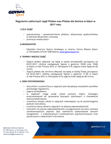 Regulamin cyklicznych zajęć Pilates oraz Pilates dla Seniora w Gdyni w 2017 roku 1.CELE ZAJĘĆ − popularyzacja i upowszechnienie pilatesu, aktywizacja społeczeństwa w zakresie aktywności ruchowej, − promocja miasta Gdyni 2.ORGANIZATOR − Gdyńskie Centrum Sportu działające w imieniu Gminy Miasta Gdyni, ul. Olimpijska 5/9, 81-538 Gdynia, www.gdyniasport.pl 3. TERMIN I MIEJSCE ZAJĘĆ − Zajęcia pilates odbywać się będą w każdy poniedziałek począwszy od 02.01.2017, zbiórka następować będzie o godzinie 18.00 oraz 19:00 w Gdyni w Hali Fitness GCS, ul. Olimpijska 5/9, zajęcia trwać będą do 60 minut, − Zajęcia pilates dla serniora odbywać się będą w każdą Środę, począwszy od 02.01.2017, zbiórka następować będzie o godzinie 11.30 w Gdyni w Hali Fitness GCS, ul. Olimpijska 5/9, zajęcia trwać będą do 60 minut, 4. INNE POSTANOWIENIA − warunkiem uczestnictwa w zajęciach jest akceptacja wszystkich punktów poniższego regulaminu, − zajęcia są bezpłatne, − w zajęciach mogą wziąć udział wszyscy chętni, niemający przeciwwskazań do uprawiania dyscyplin sportowych o charakterze wytrzymałościowym, − uczestnicy biorący udział w zajęciach zobowiązani są do przestrzegania poleceń instruktora, − uczestnicy biorą udział w zajęciach na własną odpowiedzialność, − instruktor nie ponosi odpowiedzialności za pogorszenie się stanu zdrowia zainteresowanych poprzez zbyt nadmierne wykonywanie ćwiczeń niezgodnych z indywidualnymi możliwościami psychoruchowymi oraz sprzecznymi z zaleceniami instruktora, − organizator nie ponosi konsekwencji w związku z nieprawidłowym wykonywaniem ćwiczeń, − uczestnicy zobligowani są do przestrzegania podstawowych zasad bezpieczeństwa oraz kultury osobistej, − matę do ćwiczeń należy zapewnić we własnym zakresie, − uczestników obowiązuje strój sportowy oraz obuwie sportowe z jasną podeszwą, − uczestnictwo w zajęciach pod wpływem alkoholu, leków oraz innych środków obniżających sprawność psychoruchową jest kategorycznie zabronione, − organizator nie odpowiada za rzeczy pozostawione w szatni, − uczestnictwo w zajęciach jest równoznaczne z wyrażeniem zgody na wykorzystywanie przez Organizatora zdjęć i materiałów wideo z wizerunkiem uczestników zajęć, wykonanych podczas zajęć z udziałem uczestników, do własnych działań marketingowych i promocyjnych, − ostateczna interpretacja regulaminu należy do Organizatora zajęć.