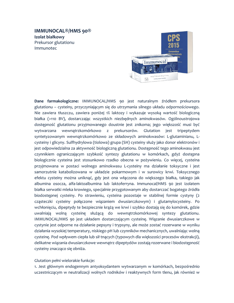 IMMUNOCAL®/HMS 90® Izolat białkowy Prekursor glutationu Immunotec Dane farmakologiczne: IMMUNOCAL/HMS 90 jest naturalnym źródłem prekursora glutationu – cysteiny, przyczyniającym się do utrzymania silnego układu odpornościowego. Nie zawiera tłuszczu, zawiera poniżej 1% laktozy i wykazuje wysoką wartość biologiczną białka (>110 BV), dostarczając wszystkich niezbędnych aminokwasów. Ogólnoustrojowa dostępność glutationu przyjmowanego doustnie jest znikoma; jego większość musi być wytwarzana wewnątrzkomórkowo z prekursorów. Glutation jest tripeptydem syntetyzowanym wewnątrzkomórkowo ze składowych aminokwasów: L-glutaminianu, Lcysteiny i glicyny. Sulfhydrylowa (tiolowa) grupa (SH) cysteiny służy jako donor elektronów i jest odpowiedzialna za aktywność biologiczną glutationu. Dostępność tego aminokwasu jest czynnikiem ograniczającym szybkość syntezy glutationu w komórkach, gdyż dostępna biologicznie cysteina jest stosunkowo rzadko obecna w pożywieniu. Co więcej, cysteina przyjmowana w postaci wolnego aminokwasu L-cysteiny ma działanie toksyczne i jest samorzutnie katabolizowana w układzie pokarmowym i w surowicy krwi. Toksycznego efektu cysteiny można uniknąć, gdy jest ona włączona do większego białka, takiego jak albumina osocza, alfa-laktoalbumina lub laktoferryna. Immunocal/HMS 90 jest izolatem białka serwatki mleka krowiego, specjalnie przygotowanym aby dostarczać bogatego źródła biodostępnej cysteiny. Po strawieniu, cysteina pozostaje w stabilnej formie cystyny (2 cząsteczki cysteiny połączone wiązaniem dwusiarczkowym) i glutamylocysteiny. Po wchłonięciu, dipeptydy te bezpiecznie krążą we krwi i szybko dostają się do komórek, gdzie uwalniają wolną cysteinę służącą do wewnątrzkomórkowej syntezy glutationu. IMMUNOCAL/HMS 90 jest układem dostarczającym cysteinę. Wiązanie dwusiarczkowe w cystynie jest odporne na działanie pepsyny i trypsyny, ale może zostać rozerwane w wyniku działania wysokiej temperatury, niskiego pH lub czynników mechanicznych, uwalniając wolną cysteinę. Pod wpływem ciepła lub sił tnących (typowych dla większości procesów ekstrakcji), delikatne wiązania dwusiarczkowe wewnątrz dipeptydów zostają rozerwane i biodostępność cysteiny znacząco się obniża. Glutation pełni wielorakie funkcje: 1. Jest głównym endogennym antyoksydantem wytwarzanym w komórkach, bezpośrednio uczestniczącym w neutralizacji wolnych rodników i reaktywnych form tlenu, jak również w utrzymywaniu egzogennych przeciwutleniaczy, takich jak witaminy C i E, w zredukowanych (aktywnych) formach. 2. W wyniku bezpośredniej koniugacji, detoksykuje wiele ksenobiotyków (związków obcego pochodzenia) i kancerogenów, zarówno organicznych jak i nieorganicznych, takich jak metale ciężkie, węglowodory aromatyczne, nitrozaminy, benzopirydyny i inne, w tym środki farmakologiczne takie jak acetaminofen. 3. Jest kluczowy dla optymalnego funkcjonowania układu odpornościowego np. (1) modulując prezentację antygenu limfocytom, w ten sposób wpływając na produkcję cytokin i rodzaj wytwarzanej odpowiedzi (komórkowa czy humoralna) (2) zwiększając proliferację limfocytów i tą drogą wzmacniając odpowiedź immunologiczną, (3) wzmacniając cytotoksyczne działanie limfocytów T i komórek NK oraz (4) regulując proces apoptozy i w ten sposób utrzymując odpowiedź immunologiczną pod kontrolą. 4. Odgrywa fundamentalną rolę w wielu procesach metabolicznych i reakcjach biochemicznych, takich jak: synteza i naprawa DNA, synteza prostaglandyn, transport aminokwasów i aktywacja enzymów. Wiele układów organizmu, w tym: odpornościowy, nerwowy, pokarmowy, sercowonaczyniowy i oddechowy, odczuwa niepożądane skutki niskiego poziomu glutationu. Wskazania: Zwiększanie poziomu glutationu jest strategią opracowaną w celu stosowania w stanach niedoboru glutationu, natężonego stresu oksydacyjnego, niedoborów immunologicznych oraz zatruciach tymi ksenobiotykami, których detoksykacja jest zależna od glutationu. Wiele przypadków klinicznych, licznie opisywanych w piśmiennictwie medycznym, jest związanych ze stresem oksydacyjnym i niedoborem glutationu. Niski poziom glutationu jest także silnie powiązany z wyniszczeniem organizmu i ujemnym bilansem azotowym obserwowanym podczas zaniku mięśni. Przeciwskazania: U osób, u których ujawniła się lub u których wcześniej zdiagnozowano nadwrażliwość na specyficzne białka mleka (nie dotyczy nietolerancji laktozy). Ostrzeżenie: Pacjenci poddawani terapii immunosupresyjnej powinni przed zastosowaniem tego produktu skonsultować się z lekarzem. Ogrzewanie lub dodawanie Immunocal/HMS 90 do gorącej cieczy, jak również używanie wysokoobrotowego blendera znacząco obniży skuteczność stosowania produktu. Środki ostrożności: Każda saszetka Immunocal/ HMS-90 dostarcza 9 g białka. Pacjenci na diecie niskobiałkowej powinni wziąć to pod uwagę podczas obliczania dziennej dawki białka. Chociaż jest pochodną mleka krowiego, Immunocal/HMS-90 jest dobrze tolerowany przez osoby nietolerujące laktozy. Immunocal/HMS-90 jest odradzany osobom, u których ujawniła się lub u których wcześniej zdiagnozowano nadwrażliwość na specyficzne białka mleka (nie dotyczy nietolerancji laktozy). Ciąża: Brak doniesień o działaniu niepożądanym. Zalecana konsultacja lekarska, jeśli pacjentka jest ciężarna lub ma podejrzenie ciąży. Laktacja: Brak doniesień o działaniu niepożądanym. Zalecana konsultacja lekarska, jeśli pacjentka karmi piersią. Osoby w podeszłym wieku: Poziom glutationu spada wraz z wiekiem. Zalecana dawka może wzrastać wraz z wiekiem. Działania niepożądane: Immunocal/HMS 90 jest naturalnym źródłem białka klasyfikowanym jako naturalny produkt prozdrowotny i nie ma danych statystycznych na temat jego działań niepożądanych. W przypadku przyjmowania niedostatecznie uwodnionego produktu mogą wystąpi