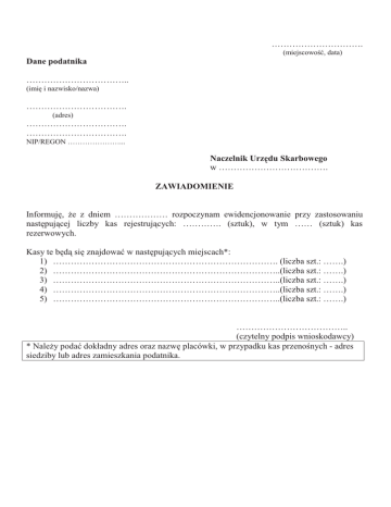 Zawiadomienie o liczbie kas rejestrujących i miejscu