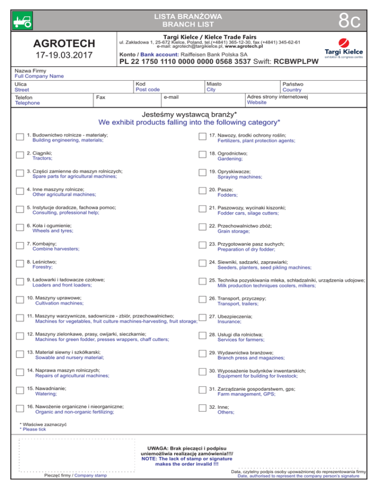 8c LISTA BRAN¯OWA BRANCH LIST Targi Kielce / Kielce Trade Fairs AGROTECH ul. Zak³adowa 1, 25-672 Kielce, Poland, tel.(+4841) 365-12-30, fax (+4841) 345-62-61 e-mail: [email protected], www.agrotech.pl 17-19.03.2017 Konto / Bank account: Raiffeisen Bank Polska SA PL 22 1750 1110 0000 0000 0568 3537 Swift: RCBWPLPW Nazwa Firmy Full Company Name Kod Post code Ulica Street Fax Telefon Telephone Miasto City Pañstwo Country Adres strony internetowej Website e-mail Jesteœmy wystawc¹ bran¿y* We exhibit products falling into the following category* 1. Budownictwo rolnicze - materia³y; Building engineering, materials; 17. Nawozy, œrodki ochrony roœlin; Fertilizers, plant protection agents; 2. Ci¹gniki; Tractors; 18. Ogrodnictwo; Gardening; 3. Czêœci zamienne do maszyn rolniczych; Spare parts for agricultural machines; 19. Opryskiwacze; Spraying machines; 4. Inne maszyny rolnicze; Other agricultural machines; 20. Pasze; Fodders; 5. Instytucje doradcze, fachowa pomoc; Consulting, professional help; 21. Paszowozy, wycinaki kiszonki; Fodder cars, silage cutters; 6. Ko³a i ogumienie; Wheels and tyres; 22. Przechowalnictwo zbó¿; Grain storage; 7. Kombajny; Combine harvesters; 23. Przygotowanie pasz suchych; Preparation of dry fodder; 8. Leœnictwo; Forestry; 24. Siewniki, sadzarki, zaprawiarki; Seeders, planters, seed pikling machines; 9. £adowarki i ³adowacze czo³owe; Loaders and front loaders; 25. Technika pozyskiwania mleka, sch³adzalniki, urz¹dzenia udojowe; Milk production techniques coolers, milkers; 10. Maszyny uprawowe; Cultivation machines; 26. Transport, przyczepy; Transport, trailers; 11. Maszyny warzywnicze, sadownicze - zbiór, przechowalnictwo; Machines for vegetables, fruit culture machines-harvesting, fruit storage; 27. Ubezpieczenia; Insurance; 12. Maszyny zielonkawe, prasy, owijarki, sieczkarnie; Machines for green fodder, presses wrappers, chaff cutters; 28. Us³ugi dla rolnictwa; Services for farmers; 13. Materia³ siewny i szkó³karski; Sowable and nursery material; 29. Wydawnictwa bran¿owe; Branch press and magazines; 14. Naprawa maszyn rolniczych; Repairs of agricultural machines; 30. Wyposa¿enie budynków inwentarskich; Equipment for building for livestock; 15. Nawadnianie; Watering; 31. Zarz¹dzanie gospodarstwem, gps; Farm management, GPS; 16. Nawo¿enie organiczne i nieorganiczne; Organic and non-organic fertilizing; 32. Inne; Others; * W³aœciwe zaznaczyæ * Please tick UWAGA: Brak pieczêci i podpisu uniemo¿liwia realizacjê zamówienia!!!/ NOTE: The lack of stamp or signature makes the order invalid !!! Pieczêæ firmy / Company stamp Data, czytelny podpis osoby upowa¿nionej do reprezentowania firmy Date, authorised to represent the company person’s signature