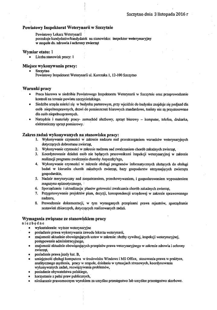 Szczytno dnia 3 listopada 2016 r Powiatowy Inspektorat Weterynarii w Szczytnie Powiatowy Lekarz Weterynarii poszukuje kandydatów/kandydatek na stanowisko: inspektor weterynaryjny w zespole ds. zdrowia i ochrony zwierząt Wymiar etatu: l • Liczba stanowisk pracy: l Miejsce wykonywania pracy: • Szczytno Powiatowy Inspektorat Weterynarii ul. Korczaka l, 12-100 Szczytno Warunki pracy • Praca biurowa w siedzibie Powiatowego Inspektoratu Weterynarii w Szczytnie oraz przeprowadzanie kontroli na terenie powiatu szczycieńskiego. • Siedziba urzędu mieści się w budynku parterowym, przy wjeździe do budynku znajduje się podjazd dla osób niepełnosprawnych, drzwi do pomieszczeń biurowych standardowe, toalety nie są przystosowane dla osób niepełnosprawnych. • Narzędzia i materiały pracy- samochód służbowy, sprzęt biurowy - komputer, telefon, drukarka, elektroniczny sprzęt pomiarowy, i Zakres zadań wykonywanych na stanowisku pracy: 1. 2. 3. 4. 5. 6. 7. 8. Wykonywanie czynności w zakresie nadzoru nad przestrzeganiem warunków weterynaryjnych dotyczących dobrostanu zwierząt, Wykonywanie czynności w zakresie nadzoru nad zwalczaniem chorób zakaźnych zwierząt, Koordynowanie działań osób nie będących pracownikami inspekcji weterynaryjnej w zakresie realizacji programu zwalczania choroby Auyeszky'ego, Wykonywanie czynności w zakresie obsługi programów informatycznych służących do obsługi badań w kierunku chorób zakaźnych zwierząt, bazy gospodarstw utrzymujących zwierzęta gospodarskie, Nadzór merytoryczny nad zaopatrzeniem, przechowywaniem, i gospodarowaniem wyposażeniem magazynu epizootycznego, l Sporządzanie i aktualizacja • planów gotowości zwalczania chorób zakaźnych zwierząt, Przygotowywanie projektów pism, decyzji, korespondencji urzędowej w zakresie sprawowanego nadzoru, Prowadzenie dokumentacji, w tym wymaganych przepisami prawa rejestrów, sporządzanie zestawień zbiorczych, dotyczących realizowanych zadań. Wymagania związane ze stanowiskiem pracy niezbędne • wykształcenie: wyższe weterynaryjne • posiadanie prawa wykonywania zawodu lekarza weterynarii, • znajomość aktualnie obowiązujących ustaw w zakresie: służby cywilnej, inspekcji weterynaryjnej, postępowania administracyjnego, • znajomość aktualnie obowiązujących przepisów prawa weterynaryjnego w zakresie zdrowia i ochrony zwierząt, • posiadanie prawa j azdy kat. B, • umiejętność obsługi komputera w środowisku Windows i MS Office, stosowania prawa w praktyce, analitycznego myślenia, pracy w zespole, działania w sytuacjach stresowych, koordynowania wykonywanych zadań, rozwiązywania problemów, • posiadanie obywatelstwa polskiego, • korzystanie z pełni praw publicznych, • nieskazanie prawomocnym wyrokiem za umyślne przestępstwo lub umyślne przestępstwo skarbowe. Szczytno dnia 3 listopada 2016 r Dokumenty i oświadczenia niezbędne: • • • • • • • • życiorys i list motywacyjny, kopie dokumentów potwierdzających spełnienie wymagania niezbędnego w zakresie wykształcenia, kopie świadectw pracy, kopie dokumentów potwierdzających posiadane uprawnienia i doświadczenie zawodowe, oświadczenie o posiadaniu obywatelstwa polskiego albo kopia dokumentu potwierdzającego posiadanie obywatelstwa polskiego, oświadczenie o wyrażeniu zgody na przetwarzanie danych osobowych do celów naboru, oświadczenie a o korzystaniu z pełni praw publicznych, oświadczenie o nieskazaniu prawomocnym wyrokiem za umyślne przestępstwo lub umyślne przestępstwo skarbowe, dokumenty i oświadczenia dodatkowe • Kopia dokumentu potwierdzającego niepełnosprawność - w przypadku kandydatów/kandydatek zamierzających skorzystać z pierwszeństwa w zatrudnieniu w przypadku, gdy znajdą się w gronie najlepszych kandydatów/kandydatek.. Termin składania dokumentów: Dokumenty należy złożyć do dnia 15 listopada 2016 r.. Decyduje data stempla pocztowego / osobistego dostarczenia oferty do urzędu. Miejsce składania dokumentów: Powiatowy Inspektorat Weterynarii Korczaka l 12-100 Szczytno Inne informacje: Planowany termin zatrudnienia: luty 2017 r. W miesiącu poprzedzającym datę upublicznienia ogłoszenia wskaźnik zatrudnienia osób niepełnosprawnych w urzędzie, w rozumieniu przepisów o rehabilitacji zawodowej i społecznej oraz zatrudnieniu osób niepełnosprawnych nie wynosi co najmniej 6%. Nasz urząd jest pracodawcą równych szans i wszystkie aplikacje są rozważane z równą uwagą bez względu na płeć, wiek, niepełnosprawność, rasę, narodowość, przekonania polityczne, przynależność związkową, pochodzenie etniczne, wyznanie, orientacje seksualną czy też jakakolwiek inną cechę prawnie chronioną. Do składania dokumentów zachęcamy osoby niepełnosprawne, które spełniają wymagania określone w niniejszym ogłoszeniu. Oferty nie spełniające wymogów formalnych, niekompletne, i dostarczone po terminie nie będą rozpatrywane. Oferty osób niezakwalifikowanych zostaną komisyjnie zniszczone. Dodatkowe informacje można uzyskać pod nr tel: 896242176 POWIATOWY LE w Sz dr n. wet. SpecjalistaEpizootioJógii i AdministraWji^eterypfiaryjnej