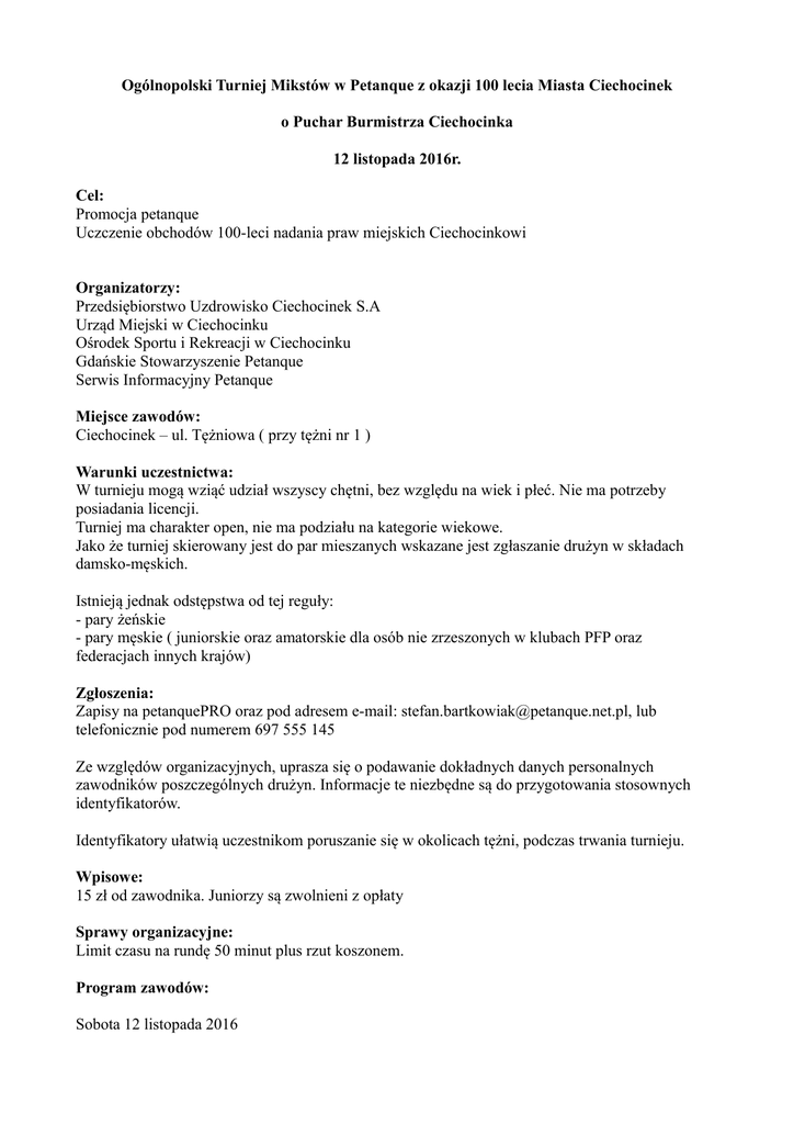 Ogólnopolski Turniej Mikstów w Petanque z okazji 100 lecia Miasta Ciechocinek o Puchar Burmistrza Ciechocinka 12 listopada 2016r. Cel: Promocja petanque Uczczenie obchodów 100-leci nadania praw miejskich Ciechocinkowi Organizatorzy: Przedsiębiorstwo Uzdrowisko Ciechocinek S.A Urząd Miejski w Ciechocinku Ośrodek Sportu i Rekreacji w Ciechocinku Gdańskie Stowarzyszenie Petanque Serwis Informacyjny Petanque Miejsce zawodów: Ciechocinek – ul. Tężniowa ( przy tężni nr 1 ) Warunki uczestnictwa: W turnieju mogą wziąć udział wszyscy chętni, bez względu na wiek i płeć. Nie ma potrzeby posiadania licencji. Turniej ma charakter open, nie ma podziału na kategorie wiekowe. Jako że turniej skierowany jest do par mieszanych wskazane jest zgłaszanie drużyn w składach damsko-męskich. Istnieją jednak odstępstwa od tej reguły: - pary żeńskie - pary męskie ( juniorskie oraz amatorskie dla osób nie zrzeszonych w klubach PFP oraz federacjach innych krajów) Zgłoszenia: Zapisy na petanquePRO oraz pod adresem e-mail: [email protected], lub telefonicznie pod numerem 697 555 145 Ze względów organizacyjnych, uprasza się o podawanie dokładnych danych personalnych zawodników poszczególnych drużyn. Informacje te niezbędne są do przygotowania stosownych identyfikatorów. Identyfikatory ułatwią uczestnikom poruszanie się w okolicach tężni, podczas trwania turnieju. Wpisowe: 15 zł od zawodnika. Juniorzy są zwolnieni z opłaty Sprawy organizacyjne: Limit czasu na rundę 50 minut plus rzut koszonem. Program zawodów: Sobota 12 listopada 2016 8:00 – 8:45 rejestracja drużyn 8:50 – otwarcie zawodów 9:00 – 9:50 ( I runda ) 10:00 – 10:50 ( II runda ) 11:00 – 11:50 ( III runda ) 12:00 – 12:50 ( IV runda ) 13:00 – 13:50 ( V runda ) 14:00 – 14:50 ( VI runda ) 15:00 – 15:50 ( VII runda ) 16:10 – zakończenie zawodów