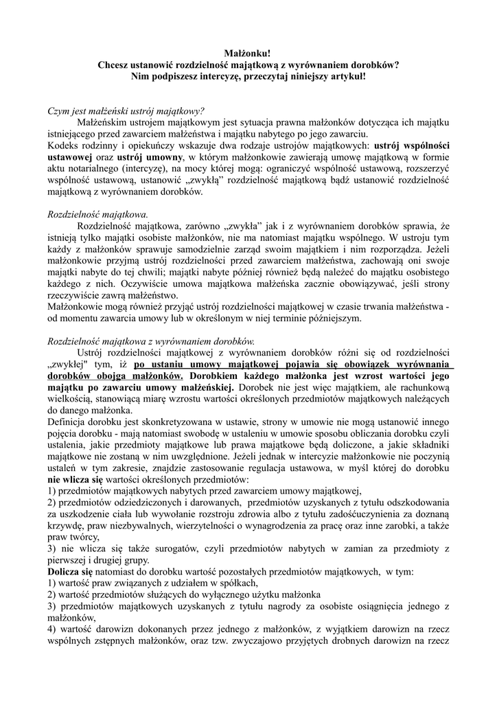 Małżonku! Chcesz ustanowić rozdzielność majątkową z wyrównaniem dorobków? Nim podpiszesz intercyzę, przeczytaj niniejszy artykuł! Czym jest małżeński ustrój majątkowy? Małżeńskim ustrojem majątkowym jest sytuacja prawna małżonków dotycząca ich majątku istniejącego przed zawarciem małżeństwa i majątku nabytego po jego zawarciu. Kodeks rodzinny i opiekuńczy wskazuje dwa rodzaje ustrojów majątkowych: ustrój wspólności ustawowej oraz ustrój umowny, w którym małżonkowie zawierają umowę majątkową w formie aktu notarialnego (intercyzę), na mocy której mogą: ograniczyć wspólność ustawową, rozszerzyć wspólność ustawową, ustanowić „zwykłą” rozdzielność majątkową bądź ustanowić rozdzielność majątkową z wyrównaniem dorobków. Rozdzielność majątkowa. Rozdzielność majątkowa, zarówno „zwykła” jak i z wyrównaniem dorobków sprawia, że istnieją tylko majątki osobiste małżonków, nie ma natomiast majątku wspólnego. W ustroju tym każdy z małżonków sprawuje samodzielnie zarząd swoim majątkiem i nim rozporządza. Jeżeli małżonkowie przyjmą ustrój rozdzielności przed zawarciem małżeństwa, zachowają oni swoje majątki nabyte do tej chwili; majątki nabyte później również będą należeć do majątku osobistego każdego z nich. Oczywiście umowa majątkowa małżeńska zacznie obowiązywać, jeśli strony rzeczywiście zawrą małżeństwo. Małżonkowie mogą również przyjąć ustrój rozdzielności majątkowej w czasie trwania małżeństwa od momentu zawarcia umowy lub w określonym w niej terminie późniejszym. Rozdzielność majątkowa z wyrównaniem dorobków. Ustrój rozdzielności majątkowej z wyrównaniem dorobków różni się od rozdzielności „zwykłej" tym, iż po ustaniu umowy majątkowej pojawia się obowiązek wyrównania dorobków obojga małżonków. Dorobkiem każdego małżonka jest wzrost wartości jego majątku po zawarciu umowy małżeńskiej. Dorobek nie jest więc majątkiem, ale rachunkową wielkością, stanowiącą miarę wzrostu wartości określonych przedmiotów majątkowych należących do danego małżonka. Definicja dorobku jest skonkretyzowana w ustawie, strony w umowie nie mogą ustanowić innego pojęcia dorobku - mają natomiast swobodę w ustaleniu w umowie sposobu obliczania dorobku czyli ustalenia, jakie przedmioty majątkowe lub prawa majątkowe będą doliczone, a jakie składniki majątkowe nie zostaną w nim uwzględnione. Jeżeli jednak w intercyzie małżonkowie nie poczynią ustaleń w tym zakresie, znajdzie zastosowanie regulacja ustawowa, w myśl której do dorobku nie wlicza się wartości określonych przedmiotów: 1) przedmiotów majątkowych nabytych przed zawarciem umowy majątkowej, 2) przedmiotów odziedziczonych i darowanych, przedmiotów uzyskanych z tytułu odszkodowania za uszkodzenie ciała lub wywołanie rozstroju zdrowia albo z tytułu zadośćuczynienia za doznaną krzywdę, praw niezbywalnych, wierzytelności o wynagrodzenia za pracę oraz inne zarobki, a także praw twórcy, 3) nie wlicza się także surogatów, czyli przedmiotów nabytych w zamian za przedmioty z pierwszej i drugiej grupy. Dolicza się natomiast do dorobku wartość pozostałych przedmiotów majątkowych, w tym: 1) wartość praw związanych z udziałem w spółkach, 2) wartość przedmiotów służących do wyłącznego użytku małżonka 3) przedmiotów majątkowych uzyskanych z tytułu nagrody za osobiste osiągnięcia jednego z małżonków, 4) wartość darowizn dokonanych przez jednego z małżonków, z wyjątkiem darowizn na rzecz wspólnych zstępnych małżonków, oraz tzw. zwyczajowo przyjętych drobnych darowizn na rzecz innych osób, 5) wartość usług świadczonych osobiście przez jednego z małżonków na rzecz majątku drugiego małżonka, 6) nakłady i wydatki na majątek jednego małżonka z majątku drugiego z nich. Dorobek oblicza się według stanu majątku z chwili ustania rozdzielności majątkowej i według cen z chwili rozliczenia. Pomimo braku wyraźnego przepisu konieczne jest więc sporządzenie pisemnego inwentarza majątku, zarówno początkowego, jak i końcowego. Kto może żądać wyrównania dorobków? Wyrównania dorobku może żądać małżonek, którego dorobek jest mniejszy od dorobku drugiego małżonka, a w razie śmierci jednego z małżonków wyrównanie następuje między jego spadkobiercami, a pozostałym przy życiu małżonkiem. Wyrównania dorobków można żądać po ustaniu tego ustroju majątkowego na podstawie porozumienia stron. Sposobem wyrównania wartości dorobków jest zapłata lub przeniesienie prawa. Jeżeli małżonkowie nie mogą zgodnie ustalić sposobu lub wysokości wyrównania, mogą zwrócić się do sądu, aby określił on wysokość wyrównania oraz sposób świadczenia. Możliwość zmniejszenia obowiązku. Nie w każdym jednak wypadku żądanie wyrównania dorobków jest moralnie uzasadnione i pożądane. Każdy z małżonków może żądać zmniejszenia obowiązku wyrównania dorobków. Okoliczności usprawiedliwiające zmniejszenie obowiązku wyrównania ustawodawca ujął formułą niedookreśloną „ważne powody”, która jest znana polskiemu prawu rodzinnemu. Wchodzą tu w rachubę takie okoliczności, jak naganna postawa życiowa jednego z małżonków przejawiająca się niechęcią do pracy bądź inne zawinione niewykorzystywanie swoich możliwości zarobkowych, trwonienie majątku, alkoholizm etc. Ustanie ustroju. Ustrój rozdzielności majątkowej z wyrównaniem dorobków może ustać z pięciu powodów: 1) ustania małżeństwa na skutek śmierci małżonka, rozwodu albo unieważnienia małżeństwa, 2) zawarcia intercyzy rozwiązującej dotychczasową umowę, a więc znoszącej ten ustrój, 3) orzeczenia separacji, która powoduje powstanie zwyczajnej rozdzielności majątkowej, 4) ubezwłasnowolnienia lub ogłoszenia upadłości małżonka, 5) ustanowienia przez sąd zw
