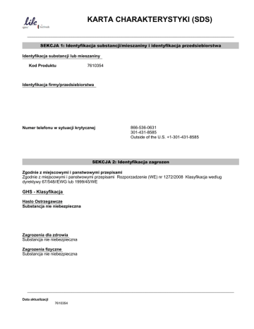 KARTA CHARAKTERYSTYKI (SDS) ________________________________________________________________________________________________________________ SEKCJA 1: Identyfikacja substancji/mieszaniny i identyfikacja przedsiebiorstwa Identyfikacja substancji lub mieszaniny Kod Produktu 7610354 Identyfikacja firmy/przedsiebiorstwa Numer telefonu w sytuacji krytycznej 866-536-0631 301-431-8585 Outside of the U.S. +1-301-431-8585 SEKCJA 2: Identyfikacja zagrozen Zgodnie z miejscowymi i panstwowymi przepisami Zgodnie z miejscowymi i panstwowymi przepisami Rozporzadzenie (WE) nr 1272/2008 Klasyfikacja wedlug dyrektywy 67/548//EWG lub 1999/45/WE GHS - Klasyfikacja Haslo Ostrzegawcze Substancja nie niebezpieczna Zagrozenia dla zdrowia Substancja nie niebezpieczna Zagrozenia fizyczne Substancja nie niebezpieczna ________________________________________________________________________________________________________________ Data aktualizacji 7610354 Unia Europejska Zwroty wskazujace na szczególne zagrozenia UE R -zdanie(a) Zaden(-a,-e) Zwroty S Zaden(-a,-e) Potencjalne skutki zdrowotne OCZY skóra wdychanie SPOZYCIE Moze dzialac drazniaco na oczy u osób wrazliwych. Moze dzialac drazniaco na skóre u osób wrazliwych. Moze dzialac szkodliwie przy wdychaniu. SUBSTANCJA MOZE BYC SZKODLIWA W PRZYPADKU SPOZYCIA. Dzialania szczególne Dzialania rakotwórcze DZIALANIA MUTAGENNE Toksycznosc rozrodcza Uczulenie Zaden(-a,-e) Zaden(-a,-e) Zaden(-a,-e) Zaden(-a,-e) Brak znanych dzialan w normalnych warunkach stosowania Dzialanie na organy docelowe SEKCJA 3: Sklad/informacja o skladnikach Niniejszy produkt nie zawiera zadnych substancji, które w podanych stezeniach uwaza sie za niebezpieczne dla zdrowia. Zalecamy obslugi wszystkich chemikaliów z ostroznoscia. SEKCJA 4: Srodki pierwszej pomocy Ostroznie plukac woda przez kilka minut. W przypadku wystapienia objawów, nalezy zasiegnac porady medycznej. Bezzwlocznie przeplukiwac duza iloscia wody przez co najmniej 15 minut, takze pod powiekami. Jesli objawy nie ustepuja, wezwac lekarza. Nigdy nie podawac niczego doustnie osobie nieprzytomnej. Jesli objawy nie ustepuja, wezwac lekarza. Nie wywolywac wymiotów bez uprzedniego zasiegniecia porady medycznej. Usunac na swieze powietrze. Jesli objawy nie ustepuja, wezwac lekarza. W przypadku braku oddychania zastosowac sztuczne oddychanie. Leczyc objawowo. Kontakt ze skóra Kontakt z oczyma SPOZYCIE wdychanie Uwagi dla lekarza SEKCJA 5: Postepowanie w przypadku pozaru Odpowiednie srodki gasnicze Specjalne wyposazenie ochronne dla strazaków Rozpylona woda. Dwutlenek wegla (CO2). Piana. Sucha substancja chemiczna. Stosowac niezalezny aparat oddechowy oraz odziez ochronna. ________________________________________________________________________________________________________________ Data aktualizacji Kod Produktu 30-Oct-2014 7610354 Strona 2 / 5 Nazwa produktu Dilution Buffer BHV-1 gB www.lifetechnologies.com SEKCJA 6: Postepowanie w przypadku niezamierzonego uwolnienia do srodowiska Indywidualne srodki ostroznosci Stosowac wyposazenie ochrony indywidualnej. Absorbowac obojetnym materialem absorbujacym. Metody usuwania Srodki ostroznosci w zakresie ochrony srodowiska O ile jest to bezpieczne, nalezy zapobiec dalszemu uwalnianiu lub wyciekaniu. Patrz: sekcja 12 po dalsze informacje. SEKCJA 7: Postepowanie z substancjami i mieszaninami oraz ich magazynowanie Unikac kontaktu ze skóra, oczami i ubraniem. Stosowac srodki ochrony osobistej. Trzymac w suchym, chlodnym i dobrze wentylowanym miejscu. Postepowanie Przechowywanie SEKCJA 8: Kontrola narazenia/srodki ochrony indywidualnej Wartosci graniczne narazenia Nie dysponujemy informacjami o jakichkolwiek krajowych limitach narazenia. Srodki techniczne Zapewnic odpowiednia wentylacje, szczególnie w miejscach zamknietych. Wyposazenie ochrony indywidualnej Wymagane srodki ochrony osobistej sa zalezne od oceny ryzyka w danej instytucji i zaleza od oceny ryzyka kazdego laboratorium gdzie dany material moze byc uzywany. Ochrona dróg oddechowych W przypadku niedostatecznej wentylacji stosowac odpowiednie indywidualne srodki ochrony dróg oddechowych. Ochrona rak Ochrona oczu Ochrona skóry i ciala Srodki higieny Srodki kontrolne narazenia srodowiska Nieprzepuszczalne rekawice. Okulary ochronne z oslonami bocznymi. lekka odziez ochronna. Postepowac zgodnie z ogólnie przyjetymi zasadami BHP. Zapobiec przedostaniu sie produktu do kanalizacji. SEKCJA 9: Wlasciwosci fizyczne i chemiczne Informacje ogólne Plyn Brak danych Postac wyglad ________________________________________________________________________________________________________________ Data aktualizacji Kod Produktu 30-Oct-2014 7610354 Strona 3 / 5 Nazwa produktu Dilution Buffer BHV-1 gB www.lifetechnologies.com Zapach Temperatura wrzenia / przedzial temperatur wrzenia Temperatura topnienia / zakres temperatury topnienia Temperatura zaplonu Temperatura samozaplonu Wlasciwosci utleniajace Rozpuszczalnosc w wodzie Brak danych °C brak danych °F brak danych °C brak danych °F brak danych °C brak danych °C brak danych Brak danych rozpuszczalny °F brak danych °F brak danych SEKCJA 10: Stabilnosc i reaktywnosc stabilnosc Materialy, których nalezy unikac Niebezpieczne produkty rozkladu Polimeryzacja Substancja stabilna w normalnych warunkach. Brak reakcji niebezpiecznych pod warunkiem normalnego uzycia. Zadne w normalnych warunkach stosowania. Nie dochodzi do niebezpiecznej polimeryzacji. SEKCJA 11: Informacje toksykologiczne Toksycznosc ostra Substancja nie niebezpieczna Potencjalne skutki zdrowotne OCZY skóra wdychanie SPOZYCIE Moze dzialac drazniaco na oczy u osób wrazliwych Moze dzialac drazniaco na skóre u osób wrazliwych Moze dzialac szkodliwie przy wdychaniu SUBSTANCJA MOZE BYC SZKODLIWA W PRZYPADKU SPOZYCIA Dzialania rakotwórcze DZIALANIA MUTAGENNE Toksycznosc rozrodcza Uczulenie Zaden(-a,-e) Zaden(-a,-e) Zaden(-a,-e) Zaden(-a,-e) Dzialanie na organy docelowe Brak znanych dzialan w normalnych warunkach stosowania SEKCJ