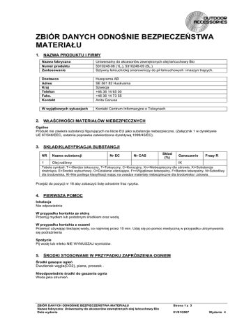 ZBIÓR DANYCH ODNOŚNIE BEZPIECZEŃSTWA MATERIAŁU 1. NAZWA PRODUKTU I FIRMY Nazwa fabryczna Numer produktu Zastosowanie Uniwersalny do akcesoriów zewnętrznych olej łańcuchowy Bio 5310248-08 (1L.), 5310248-09 (5L.) Sztywny łańcuch/olej smarowniczy do pił łańcuchowych i maszyn tnących. Dostawca Adres Kraj Telefon Faks. Kontakt Husqvarna AB SE 561 82 Huskvarna Szwecja +46 36 14 65 00 +46 36 14 73 55 Anita Cenusa W wyjątkowych sytuacjach Kontakt Centrum Informacyjne o Toksynach 2. WŁAŚCIWOŚCI MATERIAŁÓW NIEBEZPIECZNYCH Ogólne Produkt nie zawiera substancji figurujących na liście EU jako substancje niebezpieczne, (Załącznik 1 w dyrektywie UE 67/548/EEC, ostatnia poprawka zatwierdzona dyrektywą 1999/45/EC). 3. SKŁAD/KLASYFIKACJA SUBSTANCJI NR Nazwa substancji 1 Olej roślinny Nr EC Nr CAS Skład (%) Oznaczenie Frazy R IK Tabela symboli: T+=Bardzo toksyczny, T=Toksyczny, C=Korozyjny, Xn=Niebezpieczny dla zdrowia, Xi=Substancja drażniąca, E=Środek wybuchowy, O=Działanie utleniające, F+=Wyjątkowo łatwopalny, F=Bardzo łatwopalny, N=Szkodliwy dla środowiska, IK=Nie podlega klasyfikacji mając na uwadze materiały niebezpieczne dla środowiska i zdrowia. Przejdź do pozycji nr 16 aby zobaczyć listę odnośnie fraz ryzyka. 4. PIERWSZA POMOC Inhalacja Nie odpowiednie W przypadku kontaktu ze skórą Przemyj mydłem lub podobnym środkiem oraz wodą W przypadku kontaktu z oczami Przemyć używając bieżącej wody, co najmniej przez 10 min. Udaj się po pomoc medyczną w przypadku utrzymywania się podrażnienia Spożycie Pij wodę lub mleko NIE WYMUSZAJ wymiotów. 5. ŚRODKI STOSOWANE W PRZYPADKU ZAPRÓSZENIA OGNIEM Środki gaszące ogień Dwutlenek węgla(CO2), piana, proszek . Nieodpowiednie środki do gaszenia ognia Woda jako strumień. ZBIÓR DANYCH ODNOŚNIE BEZPIECZEŃSTWA MATERIAŁU Nazwa fabryczna: Uniwersalny do akcesoriów zewnętrznych olej łańcuchowy Bio Data wydania Strona 1 z 3 01/01/2007 Wydanie 4 6. ŚRODKI ZAPOBIEGAWCZE W PRZYPADKU ROZLANIA/PRZYPADKOWEGO WYCIEKU Środki podejmowane w celu uniknięcia szkód środowiskowych Zminimalizuj skażenie studzienek, powierzchni oraz cieków wodnych Zbieraj główne wypływy używając zwykłych środków wchłaniających do ich usuwania. Przenoś produkt przeznaczony do wywożenia w odpowiednim pojemniku i układaj w widocznym miejscu, patrz pozycja 13. Pozostałości i mniejsze ilości są usuwane wodą. 7. OBSŁUGA I PRZECHOWYWANIE Wytyczne odnośnie przemieszczania Unikaj wydłużonego I częstego kontaktu produktu ze skórą. Zdejmij ochlapane ubranie. Przechowywanie Zalecana temperatura przechowywania wynosi od ±0 do +40°C. Powinno unikać się dłuższego przechowywania w temperaturze poniżej –20 oraz powyżej +40°C. Przechowuj w uszczelnionych pojemnikach, preferowane są te oryginalne. 8. OGRANICZENIE NARAŻANIA SIĘ/OSOBISTE ŚRODKI OCHRONY Ochrona układu oddechowego Nie jest wymagane, aby pomieszczenia były przewietrzone. Zapewnij dobre przewietrzenie w wypadku parowania produktu. Ochronę oczu Zakładaj odpowiednią ochronę oczu. Ochronę rąk Zalecane w przypadku, kiedy nie jest dostępne mydło lub bieżąca woda lub podobne. 9. WŁAŚCIWOŚCI FIZYCZNE I CHEMICZNE Postać Barwa Zapach Rozpuszczalność w wodzie Olej. Żółty lub żółtawo - brązowy. Słaby, podobny do rzepaku. Gęstość Temperatura zapłonu Temperatura wrzenia Właściwości chłodzące Lepkość Stężenie oparów 920 kg/m³ (15°C) Nierozpuszczalny 230°C Nie odpowiednie Wlew po 96 godzinach w temperaturze –30°C 70 mm²/s (cSt, 40°C), 16 mm²/s (cSt, 100°C) Mało istotne w normalnych warunkach. 10. STABILNOŚĆ I ODCZYNOWOŚĆ Stabilność Produkt stabilnych w zwykłych warunkach. Unikaj następujących warunków Wysoka temperatura (>>100°C), silne środki utleniające. Niebezpieczne reakcje/produkty rozkładowe Żadne. ZBIÓR DANYCH ODNOŚNIE BEZPIECZEŃSTWA MATERIAŁU Nazwa fabryczna: Uniwersalny do akcesoriów zewnętrznych olej łańcuchowy Bio Data wydania Strona 2 z 3 01/01/2007 Wydanie 4 11. DANE TOKSYKOLOGICZNE Toksyczność Ostra toksyczność ustna (OECD 401): Ostra toksyczność skórna (OECD 402): LD50 szczur >5000 mg/kg,np. nie toksyczny. LD50 szczur>4 000 mg/kg, np. nie toksyczny. W przypadku kontaktu ze skórą Nie podrażnia (OECD 404, królik). Podrażniające oczy Nie podrażnia (OECD 405, królik). Mutagenność Nie mutagenne (test Amesa). 12. DANE EKOTOKSYKOLOGICZNE Rozkładalność w przyrodzie Produkt jest gotowy do biodegradacji jak określono w CEC L-33-A-93 (z wynikiem >95 % po 21 dniach). 13. GOSPODARKA ODPADAMI Stosowne wymagania odnośnie źródeł odpadów Zgodnie z lokalnymi wymaganiami 14. DANE ODNOŚNIE TRANSPORTU Chemikalia są sklasyfikowane jako towary niebezpieczne Tak Nie 7 Nie ocenione Inne informacje Nie mieści się w klasie transportowej. 15. STOSOWNE WYMAGANIA Informacje Produkt nie podlega oznaczeniu jak to określono w Szwedzkim Narodowym Inspektoracie o Chemikaliach w dyrektywach o klasyfikacji I oznaczaniu (KIFS 1994:12) oraz w stosownych dyrektywach EC dotyczących substancji niebezpiecznych i przetwarzania. Frazy R / frazy S Uwaga Oznaczenie/Symbol informujący o zagrożeniu Uwaga 16. RÓŻNORODNE DANE Źródła danych Obowiązujące w czasie kontroli przepisy oraz dokumentacja techniczna surowca dostawcy, Binol AB. Wykaz wszystkich odpowiadających fraz ryzyka. Żadne. Przegląd Wydanie 1 2 3 4 Data przeglądu 29/07/1996 14/11/2000 16/12/2003 01/01/2007 Odpowiedzialny Hanna Svennberg Hanna Svennberg Hanna Svennberg Anita Cenusa Poprawki Poprawione, Rozdziały 1-16 Poprawione, rozdział 1,16 Uwagi dostawcy ZBIÓR DANYCH ODNOŚNIE BEZPIECZEŃSTWA MATERIAŁU Nazwa fabryczna: Uniwersalny do akcesoriów zewnętrznych olej łańcuchowy Bio Data wydania Strona 3 z 3 01/01/2007 Wydanie 4