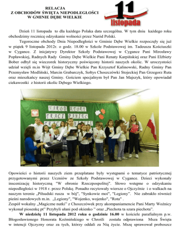 RELACJA Z OBCHODÓW ŚWIĘTA NIEPODLEGŁOŚCI W GMINIE DĘBE WIELKIE Dzień 11 listopada to dla kaŜdego Polaka data szczególna. W tym dniu kaŜdego roku obchodzimy rocznicę odzyskanie wolności przez Naród Polski. Tegoroczne obchody Dnia Niepodległości w Gminie Dębe Wielkie rozpoczęły się juŜ w piątek 9 listopada 2012r. o godz. 18.00 w Szkole Podstawowej im. Tadeusza Kościuszki w Cygance. Z inicjatywy Dyrektor Szkoły Podstawowej w Cygance Pani Mirosławy Popławskiej, Radnych Rady Gminy Dębe Wielkie Pani Renaty Karpińskiej oraz Pani ElŜbiety Bober odbył się wieczorek historyczny poświęcony historii naszych okolic. W uroczystości udział wzięli m.in Wójt Gminy Dębe Wielkie Pan Krzysztof Kalinowski, Radny Gminy Pan Przemysław Modliński, Marcin Grabarczyk, Sołtys Choszczówki Stojeckiej Pan Grzegorz Ruta oraz mieszkańcy naszej Gminy. Gościem specjalnym był Pan Jan Majszyk, który opowiadał ciekawostki z historii okolic Dębego Wielkiego. Opowieści o historii naszych ziem przeplatane były występami o tematyce patriotycznej przygotowanymi przez Uczniów ze Szkoły Podstawowej w Cygance. Dzieci wykonały inscenizację historyczną "W obronie Rzeczpospolitej". Słowo wstępne o odzyskaniu niepodległości w 1918 r. przez Polskę. Ponadto recytowały wiersze o Ojczyźnie i o walkach na naszym terenie „Piłsudski rusza w bój", "Synkowie moi", "Legiony”. Nie zabrakło równieŜ pieśni narodowych m.in. „Legiony", "Wojenko, wojenko", "Rota" . Zespół wokalny „Magiczne nutki” z Choszczówek przy akompaniamencie Pani Marty Woźnicy wykonał piosenkę pt” Przybyli ułani pod okienko ” oraz „Piechota ta szara piechota”. W niedzielę 11 listopada 2012 roku o godzinie 16.00 w kościele parafialnym p.w. Błogosławionego Honorata Koźmińskiego w Chrośli została odprawiona Msza Święta w intencji Ojczyzny oraz za tych, którzy oddali za Nią Ŝycie. Mszę sprawował proboszcz parafii - ksiądz Bogusław Wnuk, a uczestniczyli w niej przedstawiciele władz gminnych, licznie zgromadzeni mieszkańcy parafii oraz dzieci ze Szkoły Podstawowej im. Gen. Józefa Bema w Rudzie, wraz z pocztem sztandarowym. Msza zakończyła się okolicznościowym widowiskiem, tematycznie związanym z historią odzyskania przez Polskę niepodległości, starannie przygotowanym przez młodzieŜ szkolną pod kierunkiem nauczycieli. ZłoŜyły się na nie utwory poetyckie, opisy wydarzeń z dziejów Polski oraz znane pieśni historyczne. Całość widowiska miała stosowną oprawę plastyczną. Wszyscy wchodzący do świątyni otrzymali, wykonane przez dzieci, kotyliony w barwach narodowych, a na ławkach czekały na nich okolicznościowe śpiewniki, zawierające zbiór pieśni patriotycznych i wojskowych z początków XX wieku. Po wyprowadzeniu sztandaru szkoły, wszyscy obecni w kościele zostali zaproszeni do wspólnego śpiewania pieśni związanych z obchodami. Obchody Dnia Niepodległości w takiej formie spotkały się z pozytywnym odbiorem wśród mieszkańców. Niedzielne obchody Narodowego Święta Niepodległości w gminie Dębe Wielkie trwały do późnego wieczora. O godz. 18.00 w Kościele parafialnym w Dębem Wielkim została odprawiona kolejna uroczysta Msza Święta za poległych w obronie naszej Ojczyzny. Uroczystość Mszy Świętej uświetniły poczty sztandarowe: Zarządu Ochotniczych StraŜy PoŜarnych w Dębem Wielkim, poczty jednostek Ochotniczych StraŜy PoŜarnych, poczty sztandarowe ze szkół podstawowych oraz poczet Kombatantów. Po Mszy Świętej w Kościele młodzieŜ z Gimnazjum Gminnego w Dębem Wielkim wraz z Wójtem Gminy Dębe Wielkie Panem Krzysztofem Kalinowski przedstawili fascynujący (pełen niezapomnianych emocji) program artystyczny pt „Obrazy z przeszłości”, którego przygotowaniem zajęli się nauczyciele Pani Marlena Pilarska, Pani Dorota Późniecka, Pani Anna Sadowska. Program artystyczny rozpoczęła Julia Kalinowska uczennica Szkoły Podstawowej w Dębem Wielkim wykonując na pianinie walc cis-moll op.64 Nr 2 Fryderyka Chopina. Bardzo poruszające było takŜe wykonanie pieśni pt „Tango na głos” z repertuaru Maryli Rodowicz, które wykonała obdarzona niezwykłym głosem i zmysłem artystycznym Kinga Grala. Widowisko dostarczyło licznie zgromadzonym mieszkańcom niezapomnianych doznań i wraŜeń estetycznych, a to za sprawą m.in. ciekawych występów artystycznych niezwykle utalentowanej młodzieŜy, oraz oprawy scenicznej. Program artystyczny został wystawiony przy zgaszonym świetle. MłodzieŜ gimnazjalna zaistniała podczas programu przede wszystkim jako grupa chóralna oraz teatralna. Uczniowie Gimnazjum Gminnego nie tylko postarali się o piękną recytację tekstu, ale równieŜ swoje widowisko wzbogacili profesjonalnymi kostiumami, które w kaŜdym szczególe dopasowane były do tematu przewodniego programu artystycznego. Wójt Gminy Dębe Wielkie Pan Krzysztof Kalinowski zaprezentował swoje umiejętności wokalne, licznie zgromadzona publiczność mogła usłyszeć pieśń z repertuaru Jacka Kaczmarskiego pt. „Modlitwa o Wschodzie Słońca” oraz wiersz Jana Pawła II pt „Myśląc Ojczyzna” w wykonaniu Pana Wójta. Wójt Gminy Dębe Wielkie serdecznie dziękuje wszystkim za zaangaŜowanie w przygotowaniu tak uroczystych Obchodów Dnia Niepodległości. WIĘCEJ ZDJĘĆ W GALERII ZAPRASZAMY ERROR: syntaxerror OFFENDING COMMAND: --nostringval-STACK: /Title () /Subject (D:20121121094605+01’00’) /ModDate () /Keywords (PDFCreator Version 0.9.5) /Creator (D:20121121094605+01’00’) /CreationDate (KasiaP) /Author -mark-